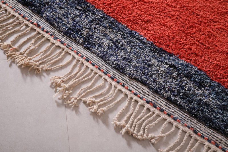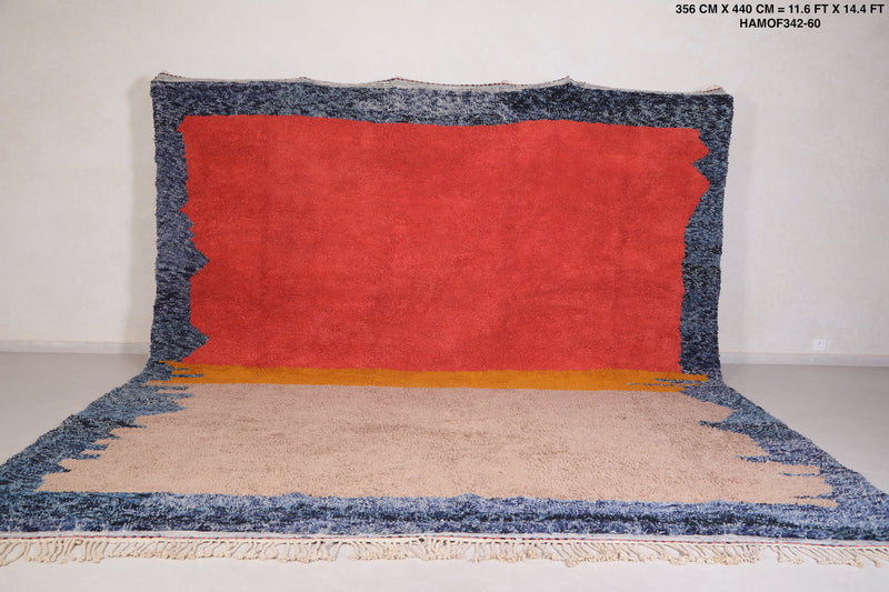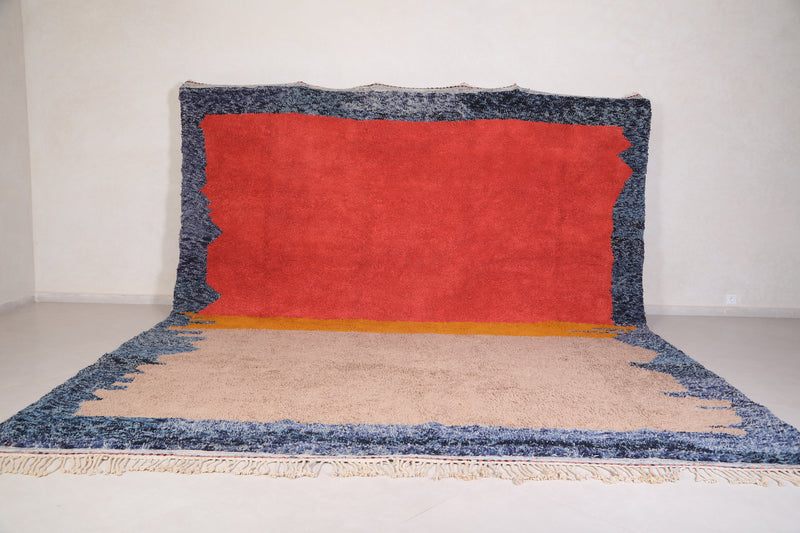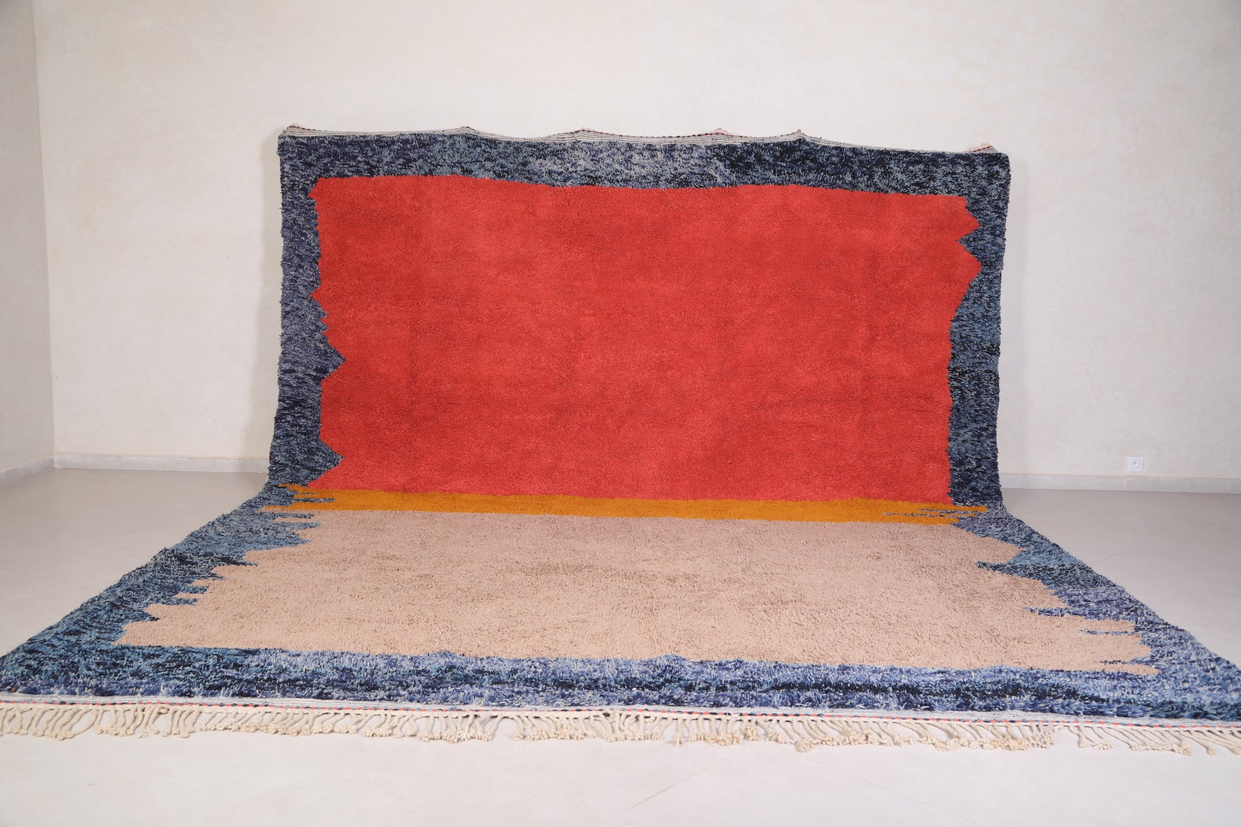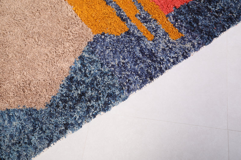 Add a bold artistic statement to your space with this stunning handmade Moroccan rug, featuring a vibrant abstract design. The rich red, deep blue, warm mustard, and neutral beige tones blend seamlessly, creating a unique and contemporary look that enhances any modern interior.