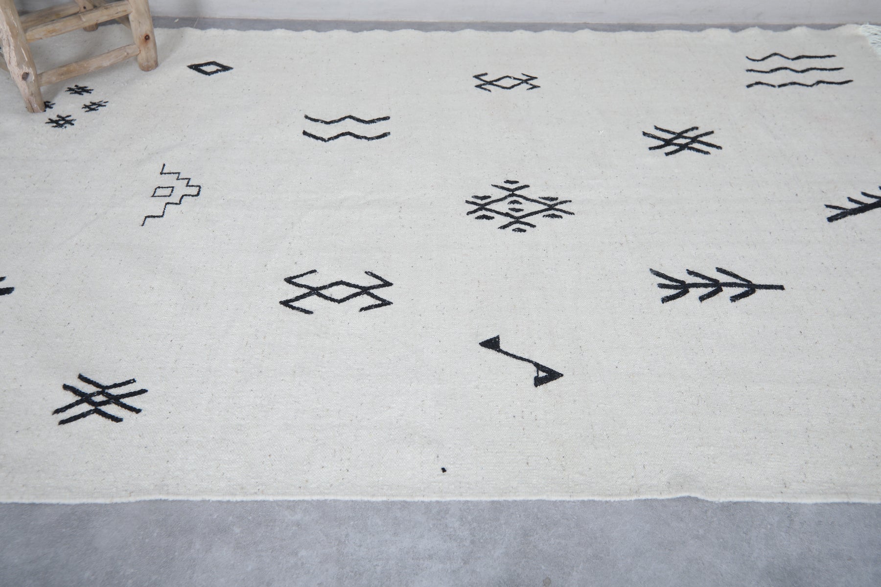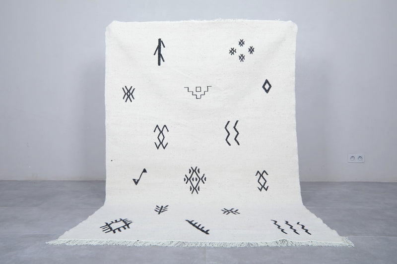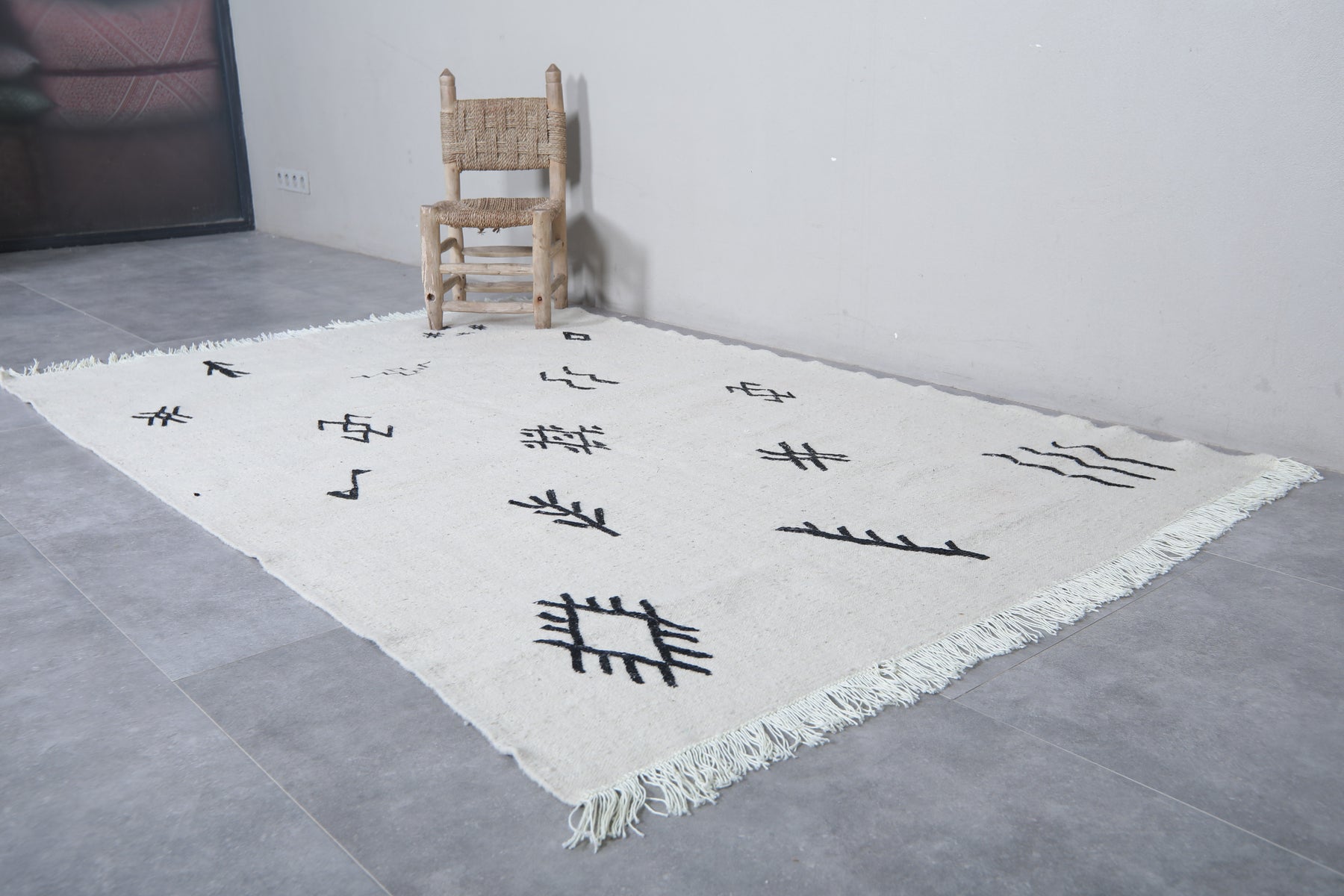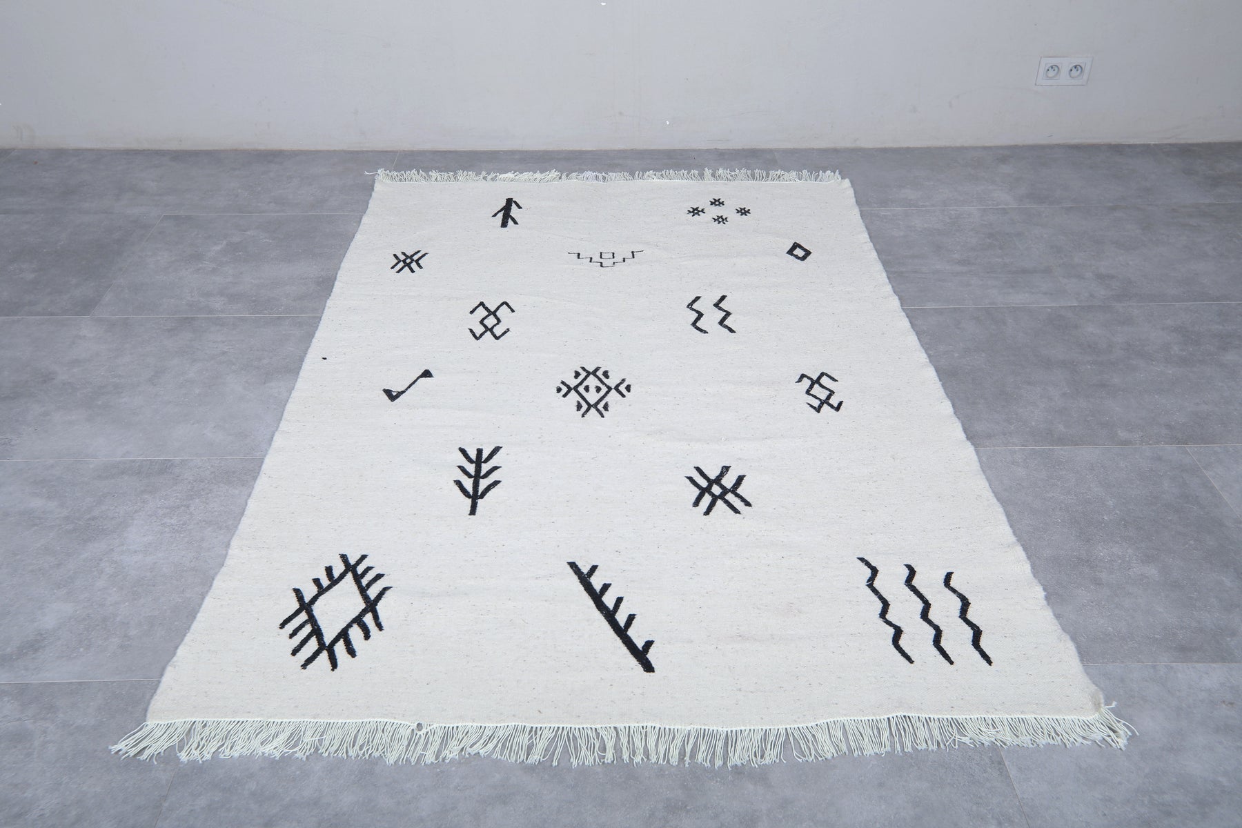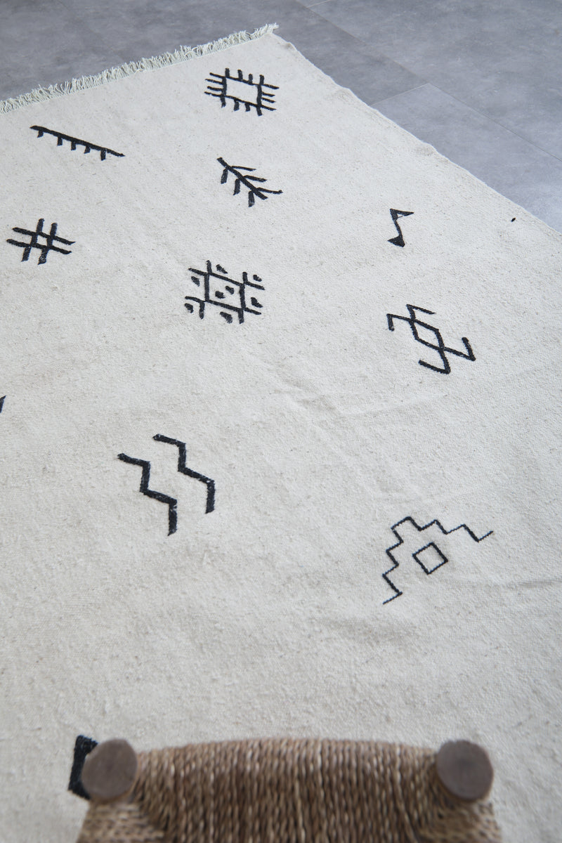 Add a touch of authentic character to a room with this Azilal-style flat-weave Moroccan rug, featuring striking black tribal symbols on a clean white background. Each symbol has a story to tell of heritage and meaning, drawn from inspiration found in traditional Berber motifs. This makes this rug more than just a covering for the floor-it's a statement of culture. Woven from natural wool into a flat, lightweight weave, it features fringed edges and can be used either on its own or layered in modern, boho, or minimalist settings.