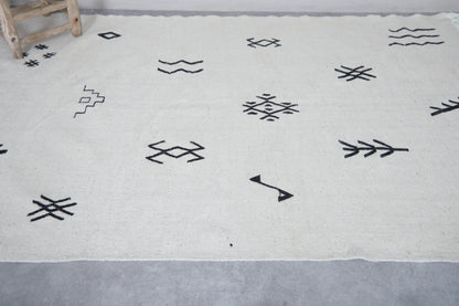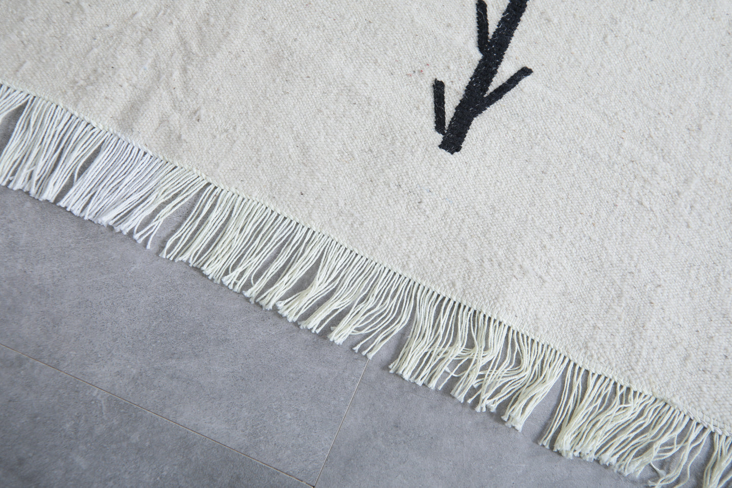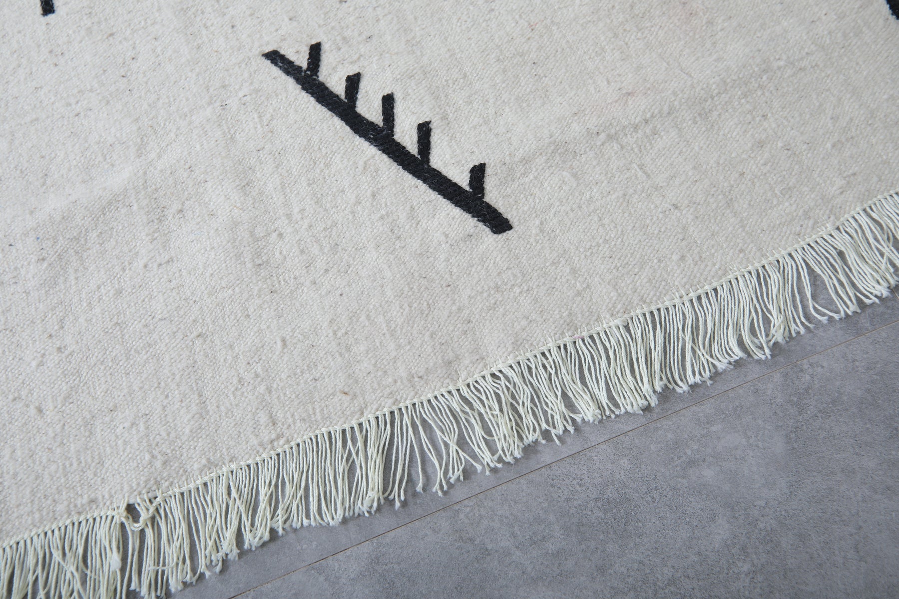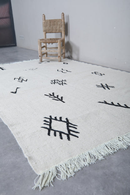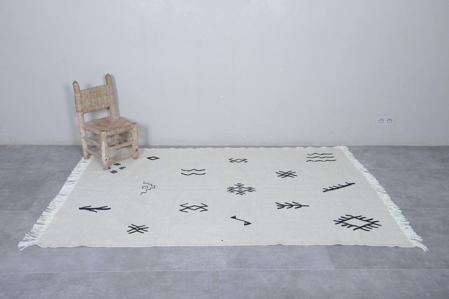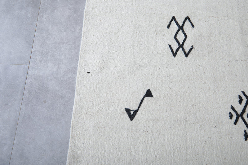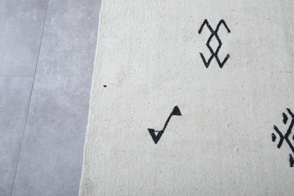 Add a touch of authentic character to a room with this Azilal-style flat-weave Moroccan rug, featuring striking black tribal symbols on a clean white background. Each symbol has a story to tell of heritage and meaning, drawn from inspiration found in traditional Berber motifs. This makes this rug more than just a covering for the floor-it's a statement of culture. Woven from natural wool into a flat, lightweight weave, it features fringed edges and can be used either on its own or layered in modern, boho, or minimalist settings.