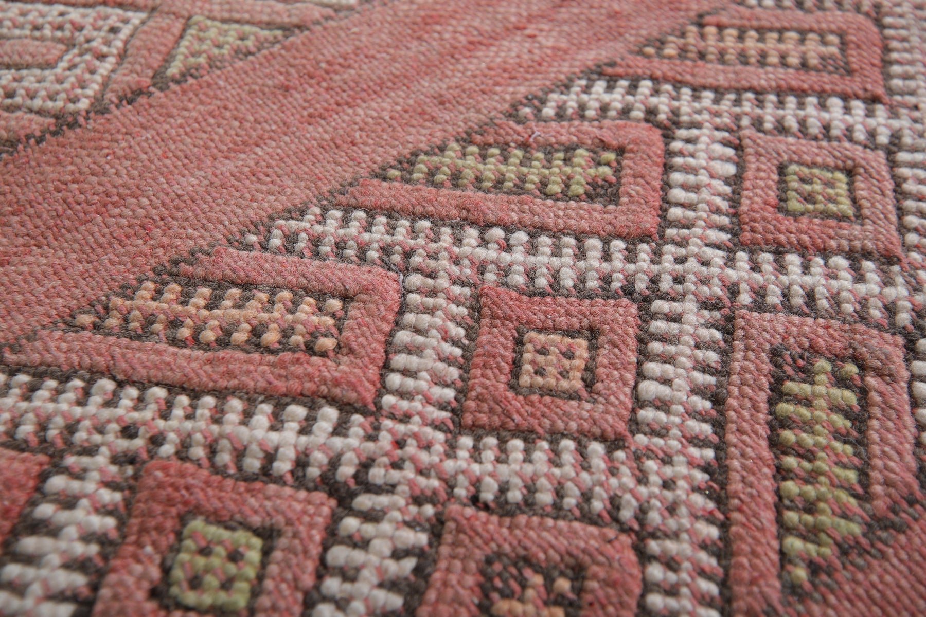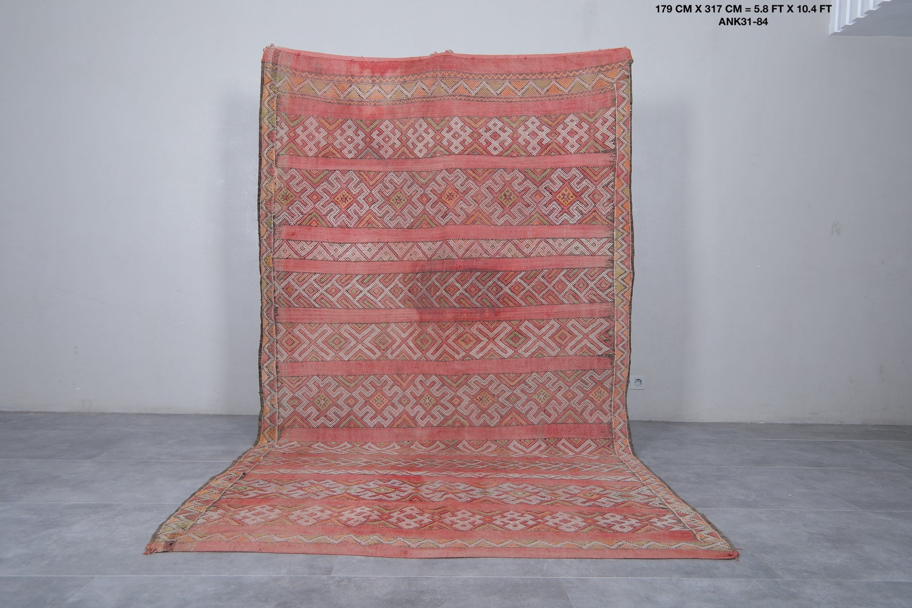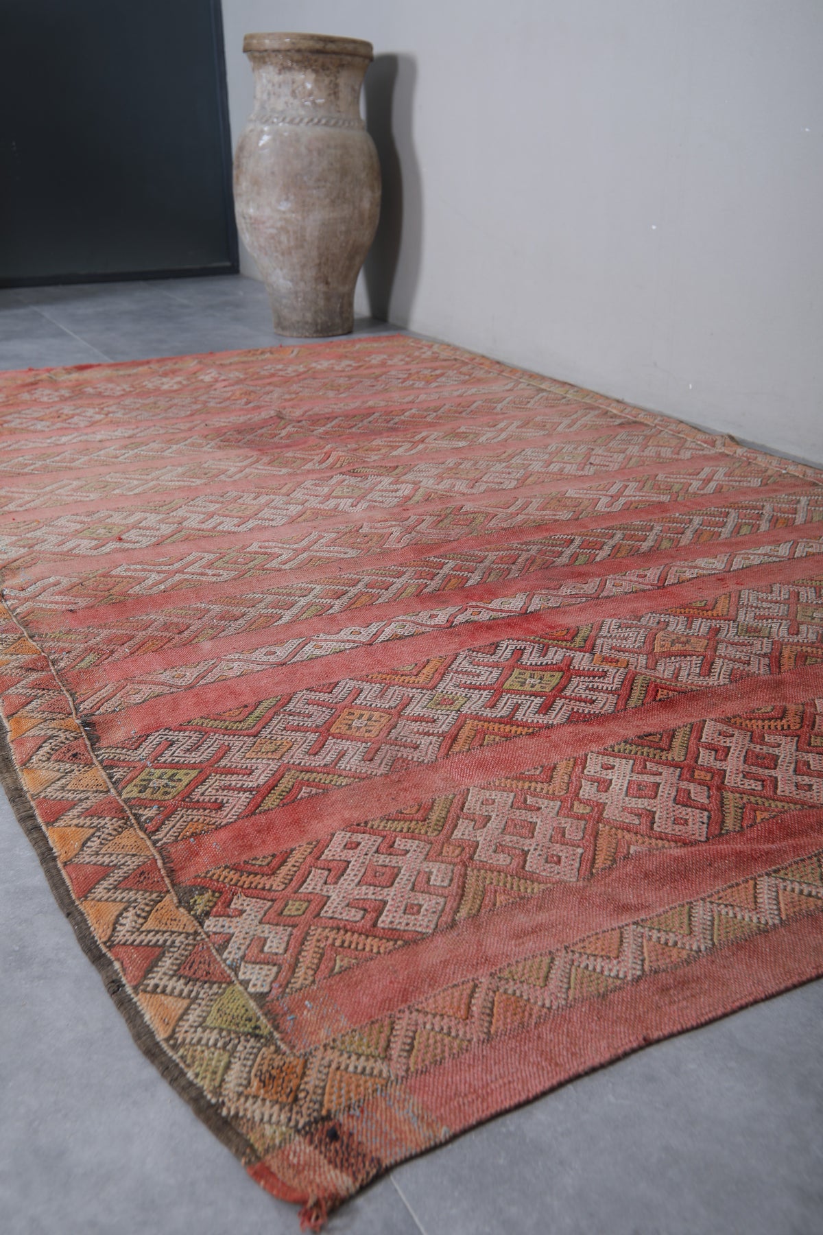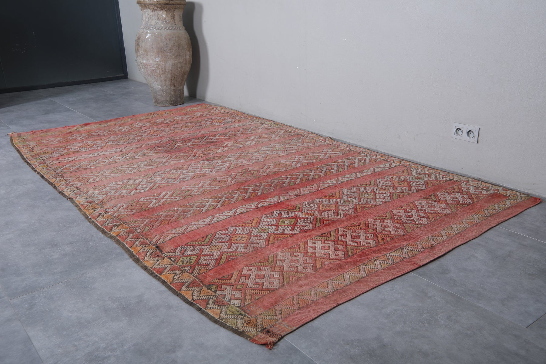 This 5.8 x 10.4 feet vintage Moroccan Berber kilim rug embodies timeless beauty, featuring intricate geometric patterns in soft pink and earthy tones. A blend of traditional craftsmanship and modern versatility, it’s ideal for living rooms, bedrooms, or dining areas.
