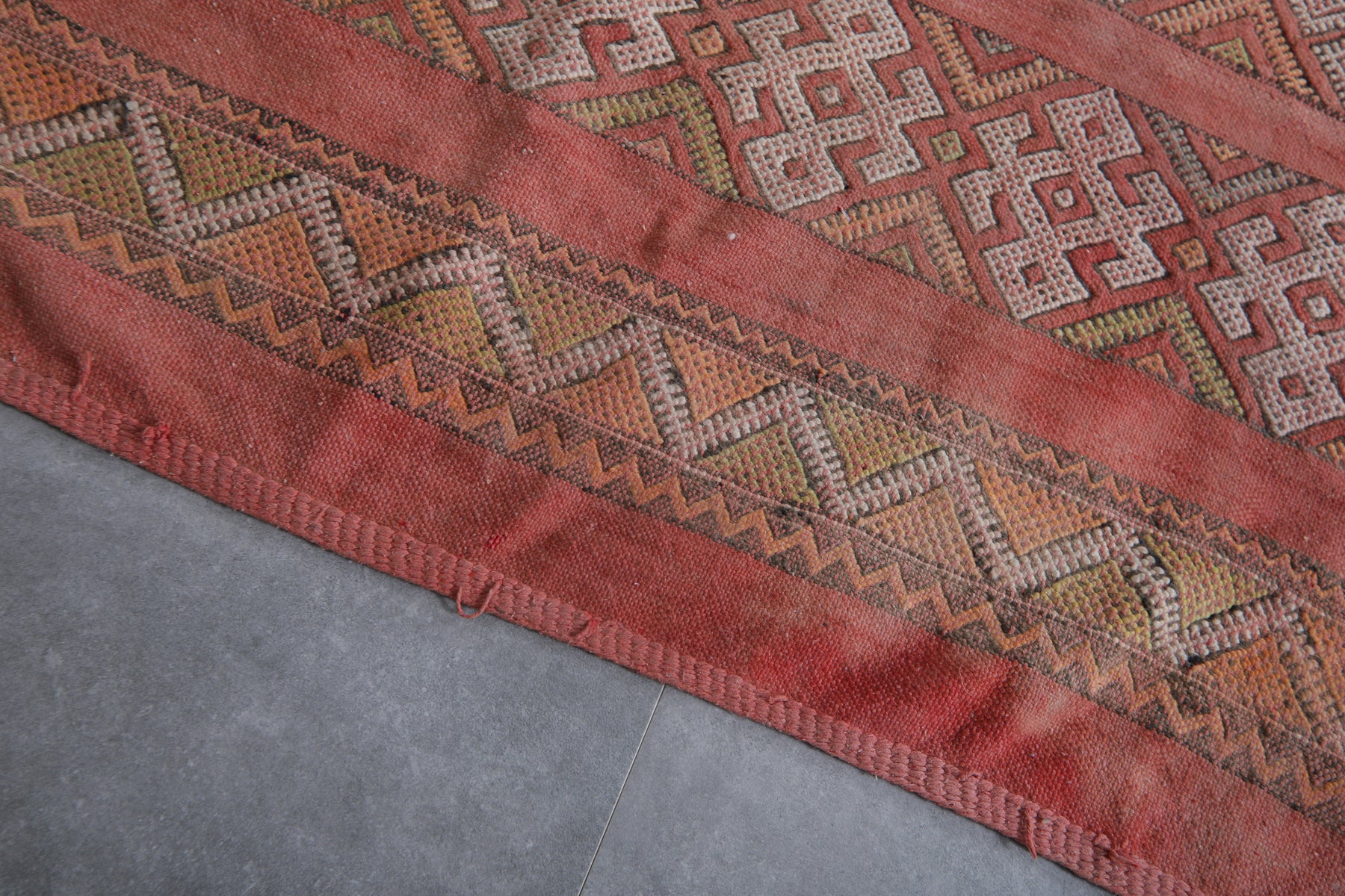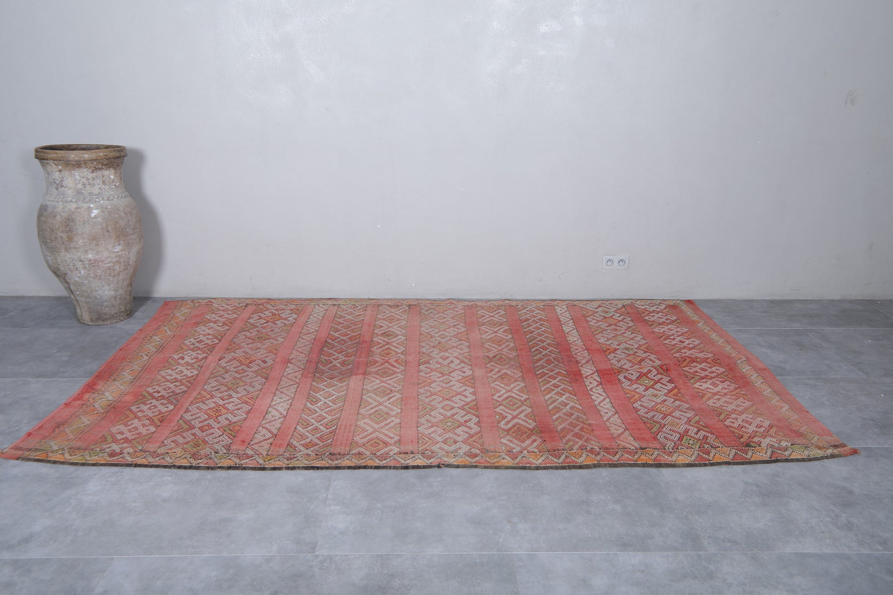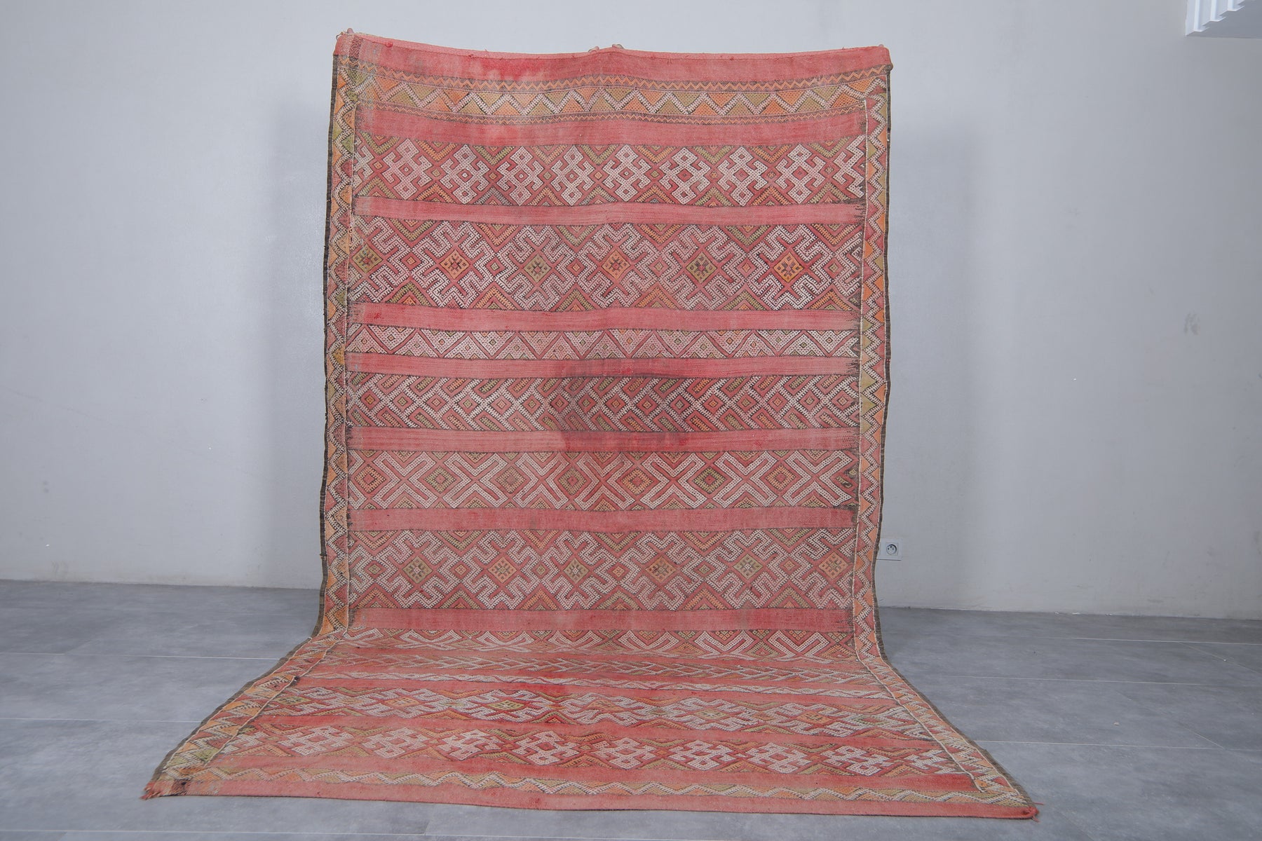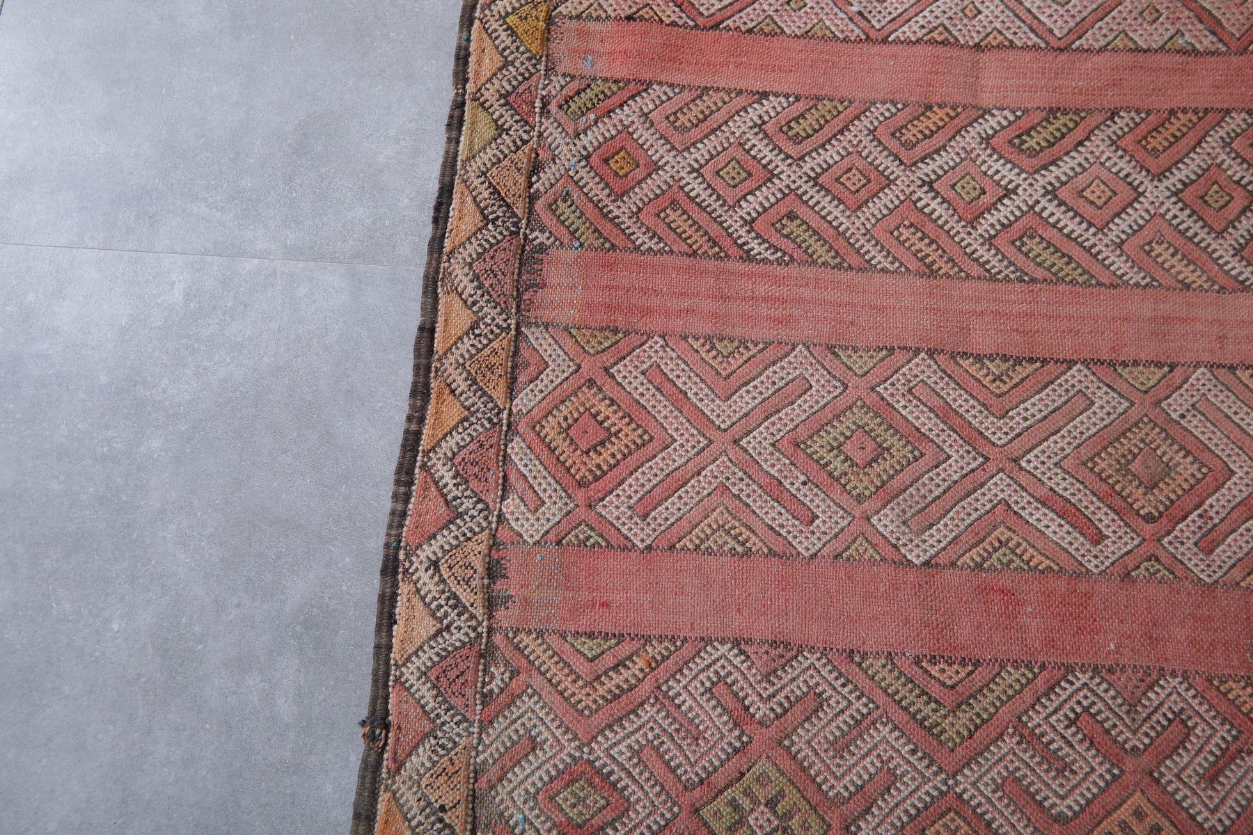 This 5.8 x 10.4 feet vintage Moroccan Berber kilim rug embodies timeless beauty, featuring intricate geometric patterns in soft pink and earthy tones. A blend of traditional craftsmanship and modern versatility, it’s ideal for living rooms, bedrooms, or dining areas.