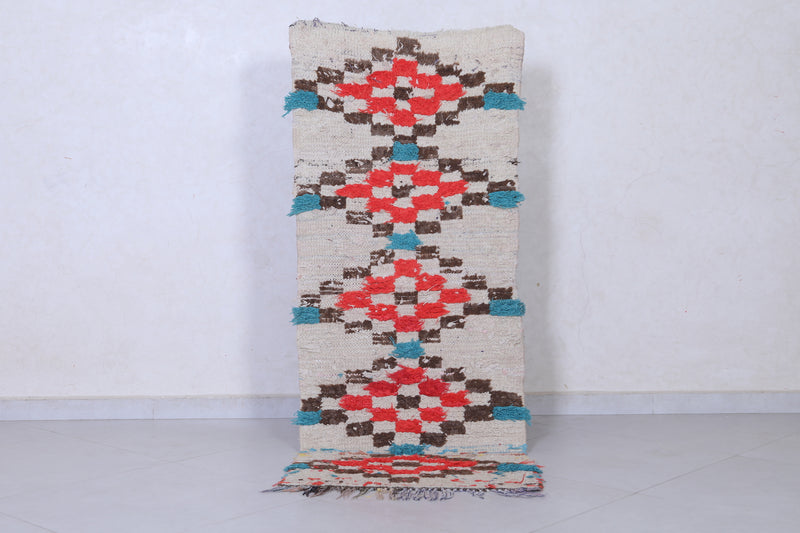 Brighten your home with this Moroccan rug, featuring a striking geometric design in red, blue, and brown on a neutral beige background. Measuring 2.2 x 5.7 ft, this heirloom piece brings a pop of color and character to any space. Perfect for hallways, bedrooms, or living areas, its intricate craftsmanship showcases traditional Moroccan artistry. A unique blend of durability and charm, this rug is a timeless decor choice.