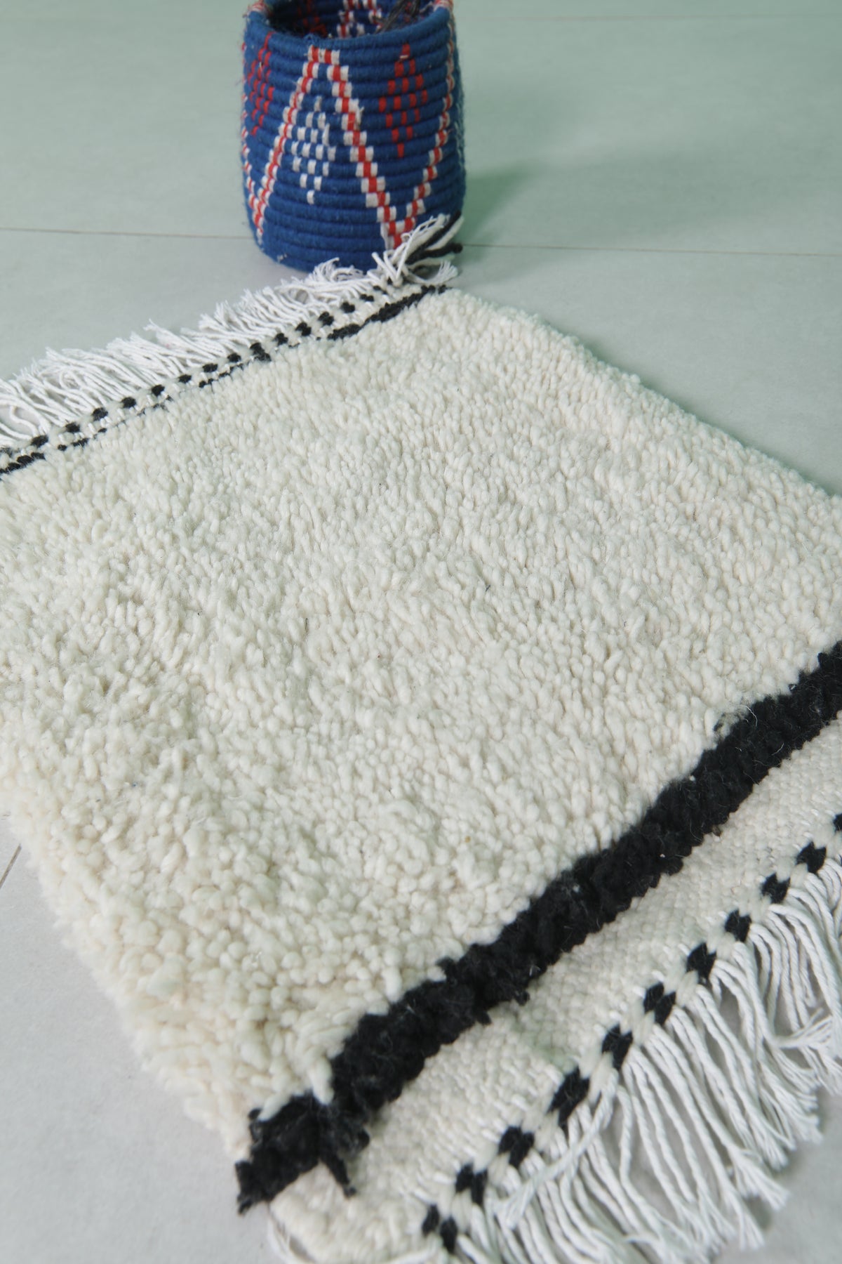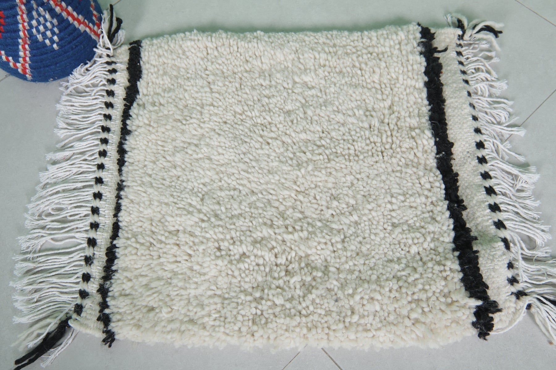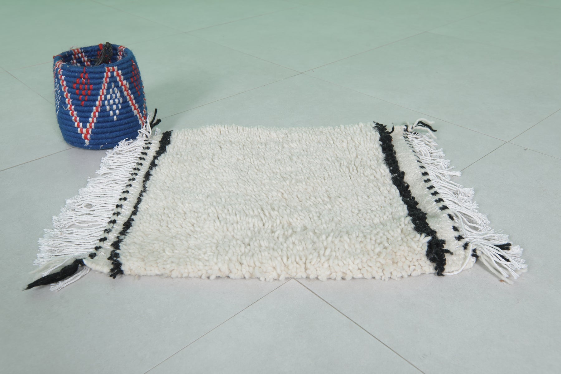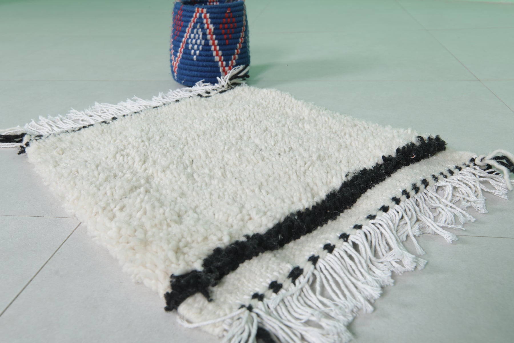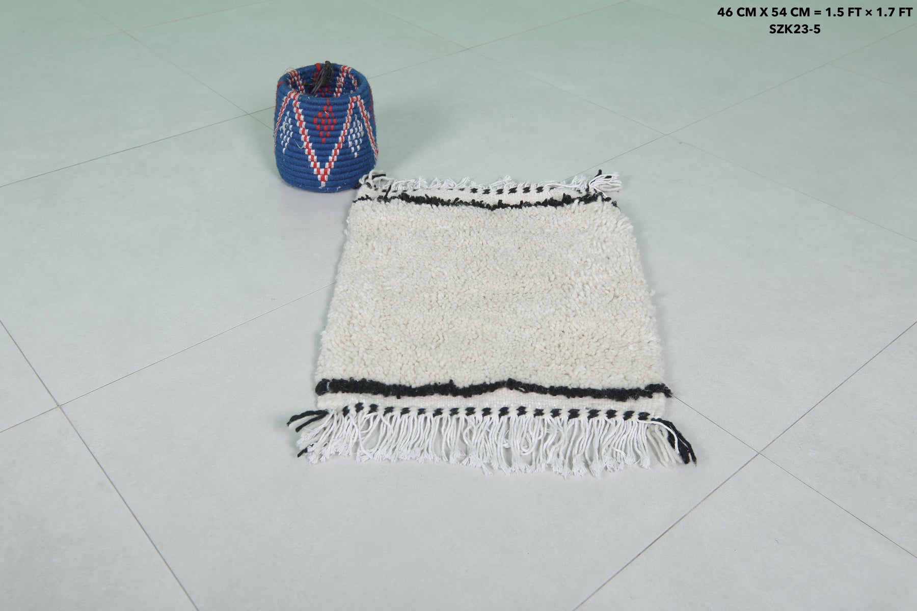 Add a touch of Moroccan craftsmanship to your home with this small handwoven rug, made from premium natural wool. Measuring 1.5 x 1.7 feet (46 CM x 54 CM), this rug features a minimalist black-and-white design with elegant fringe detailing, perfect for accenting small spaces such as tabletops, bathrooms, or decorative corners. Its plush texture ensures softness and comfort, while its durable build guarantees long-lasting use. Compact yet stylish, this rug is an ideal addition to any modern or traditional décor. Bring Moroccan charm to your space with this exquisite handmade piece!