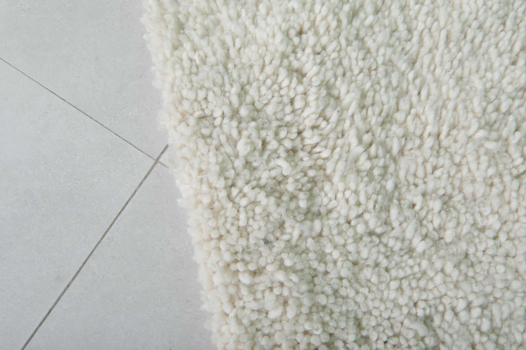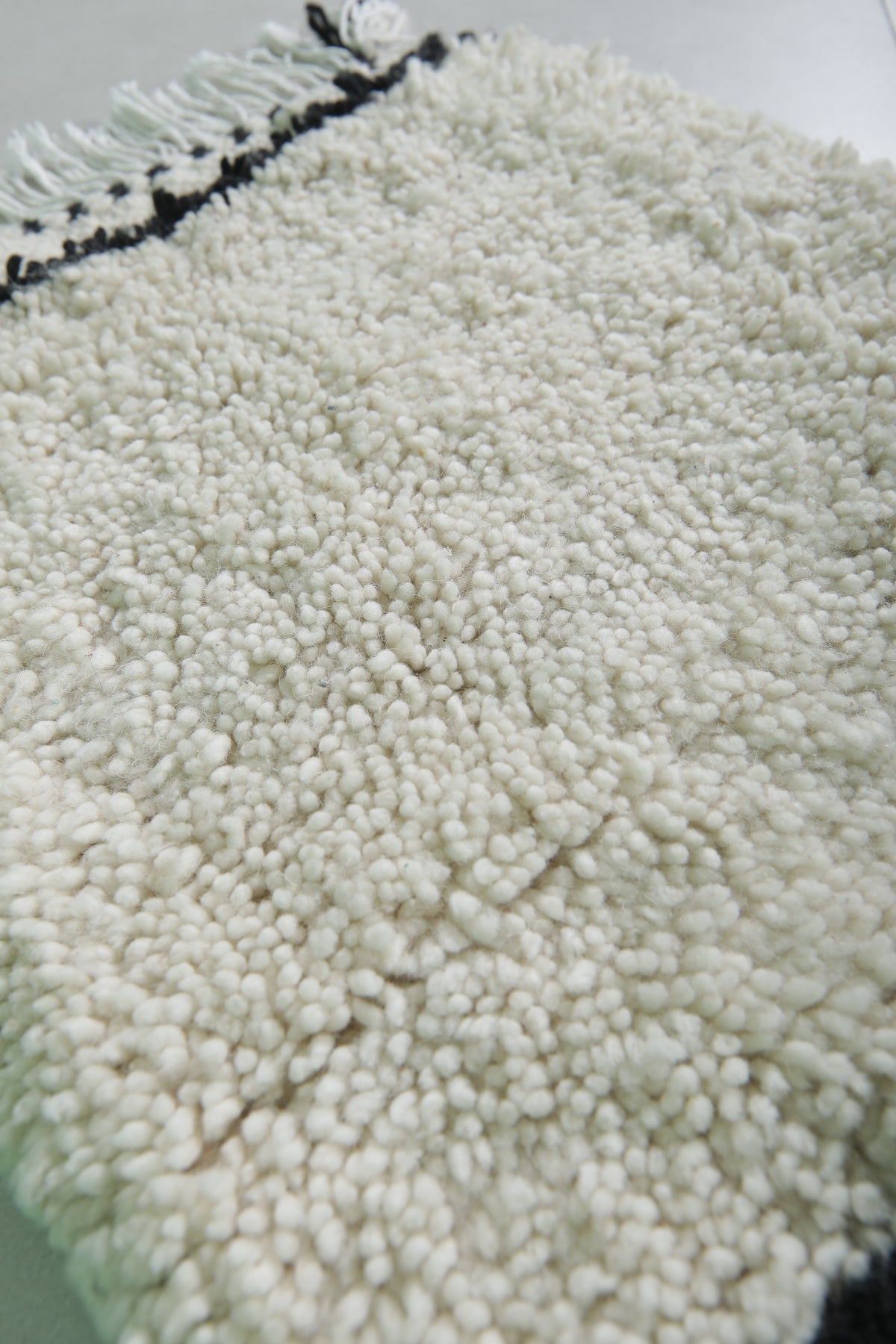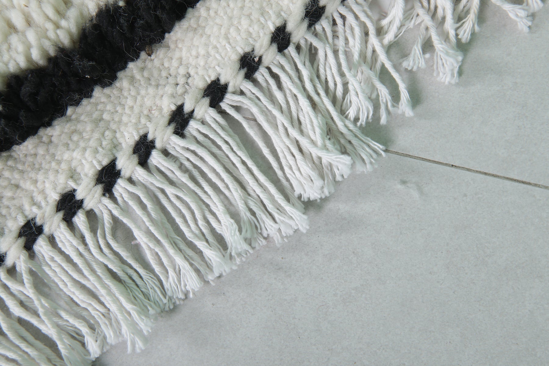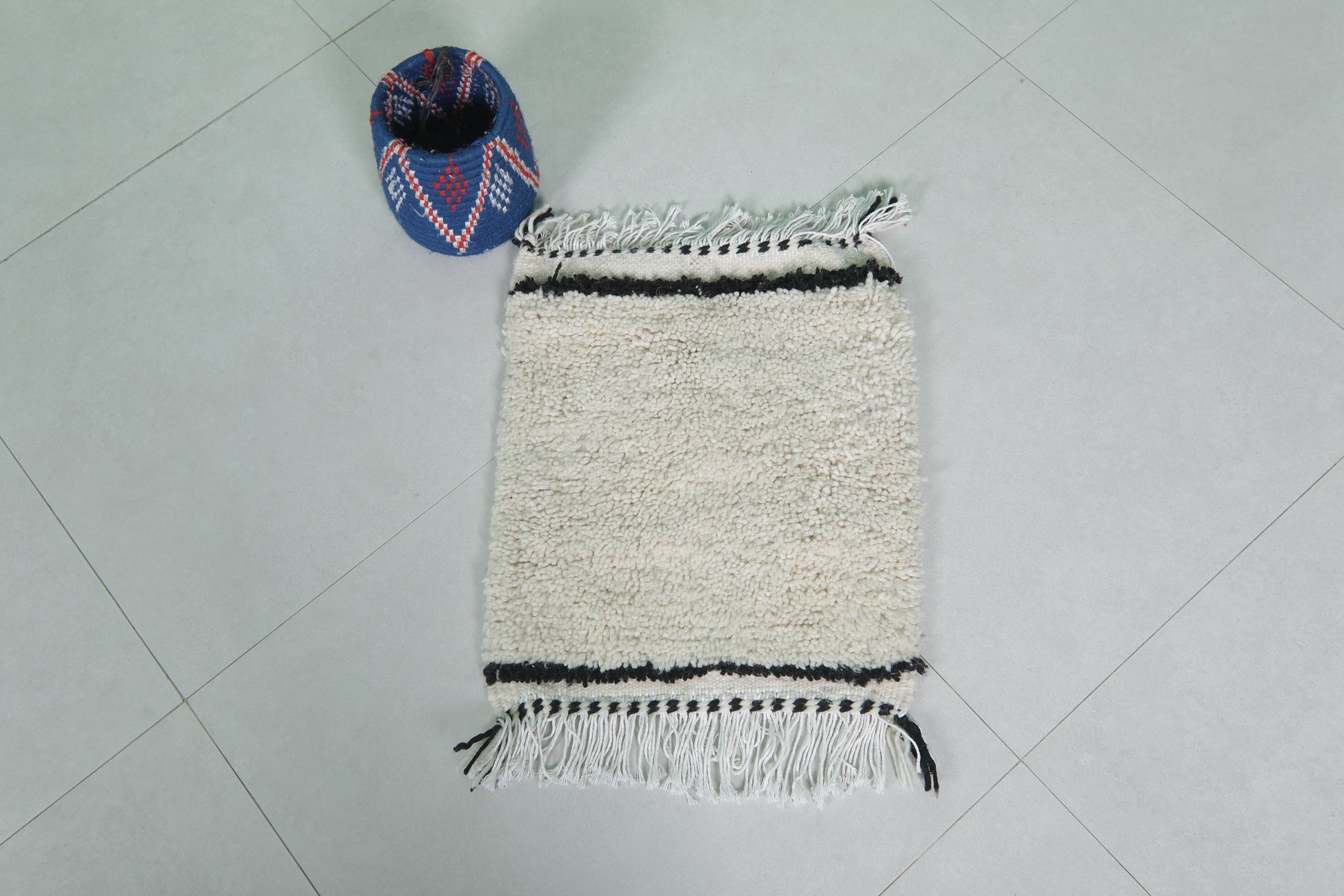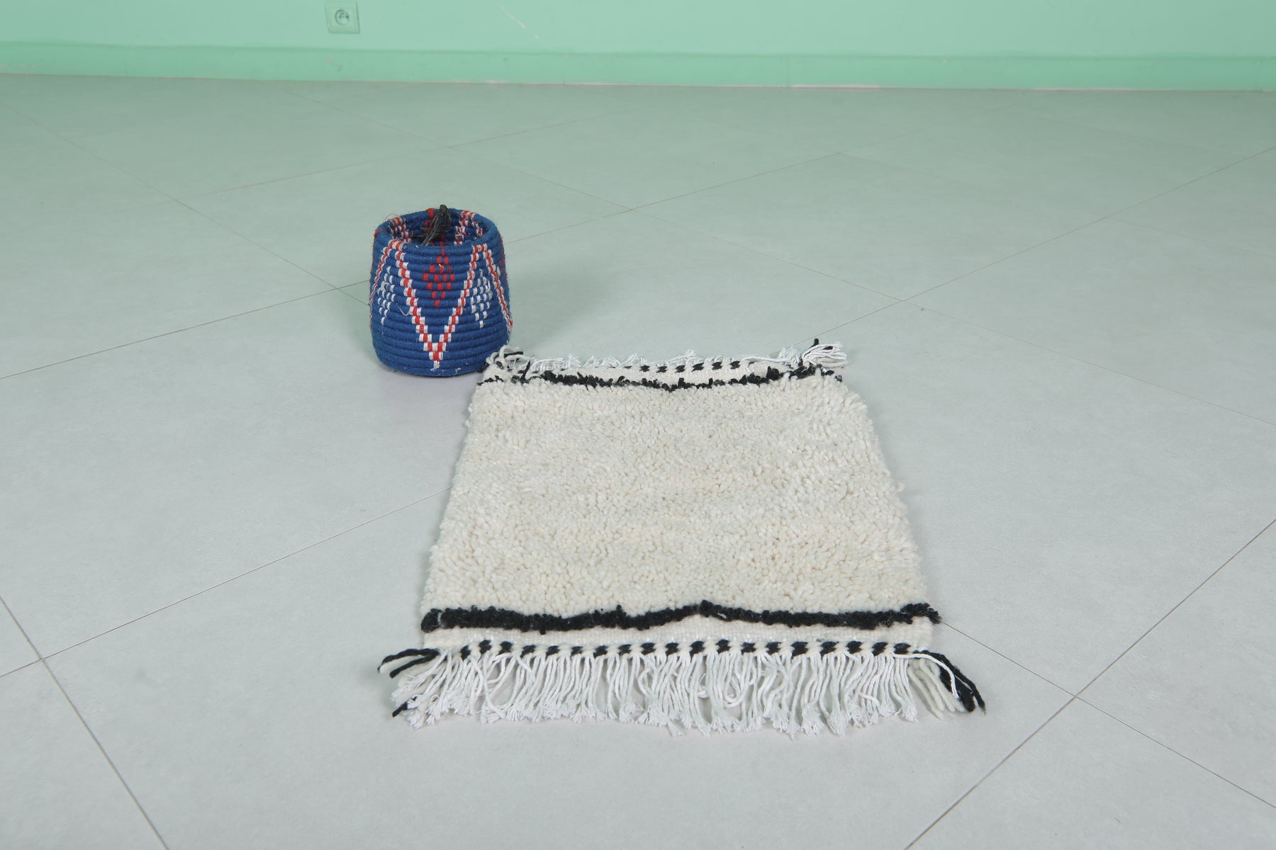 Add a touch of Moroccan craftsmanship to your home with this small handwoven rug, made from premium natural wool. Measuring 1.5 x 1.7 feet (46 CM x 54 CM), this rug features a minimalist black-and-white design with elegant fringe detailing, perfect for accenting small spaces such as tabletops, bathrooms, or decorative corners. Its plush texture ensures softness and comfort, while its durable build guarantees long-lasting use. Compact yet stylish, this rug is an ideal addition to any modern or traditional décor. Bring Moroccan charm to your space with this exquisite handmade piece!