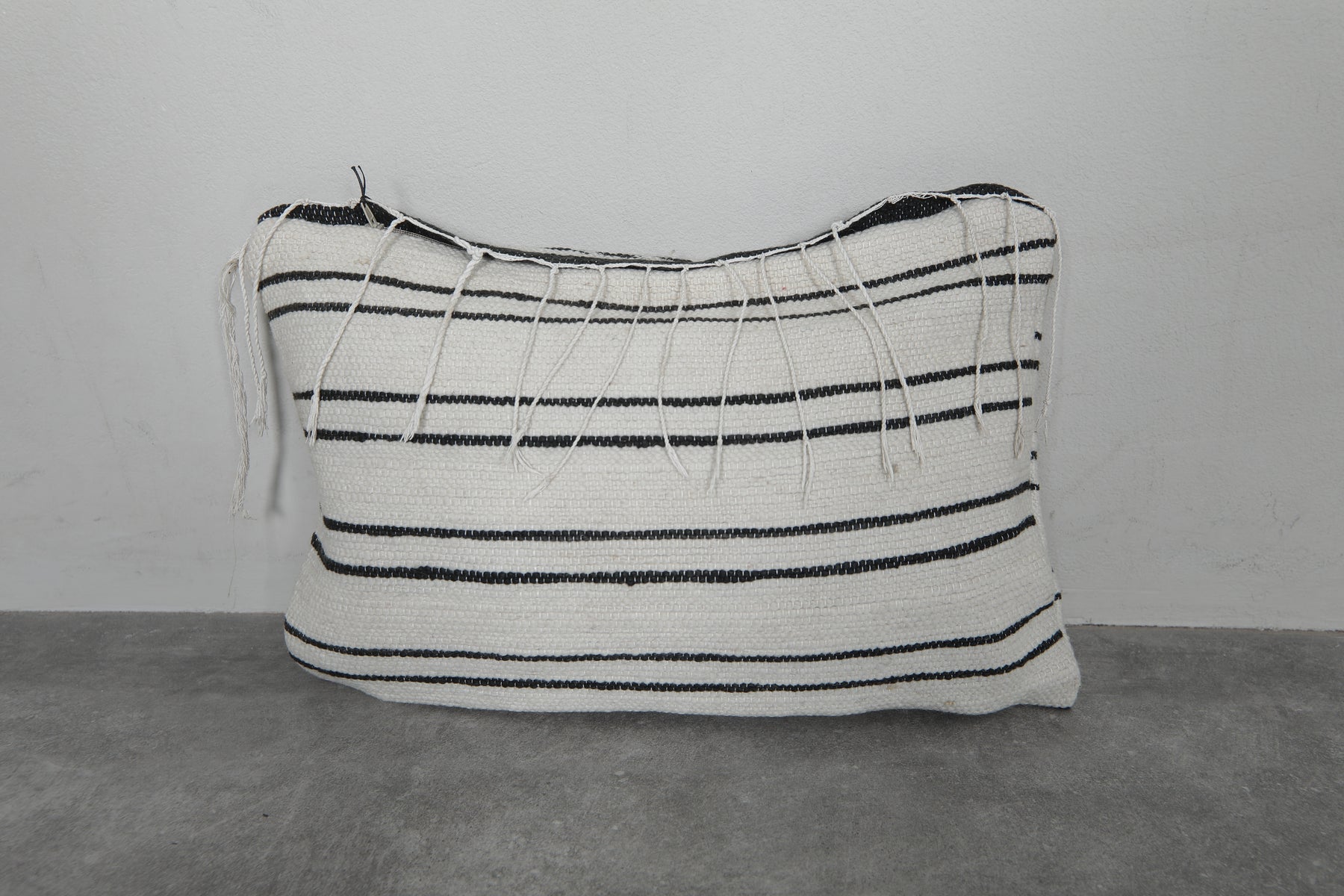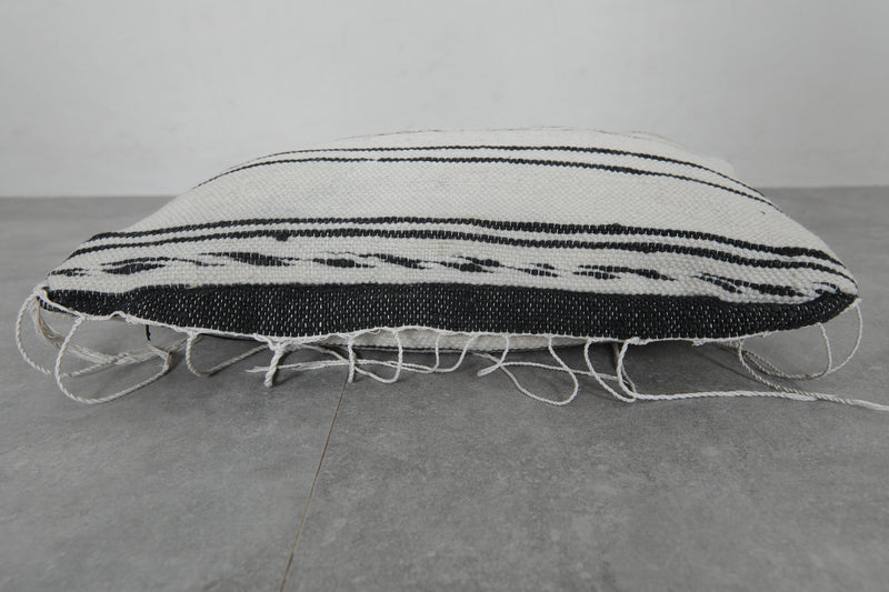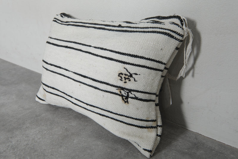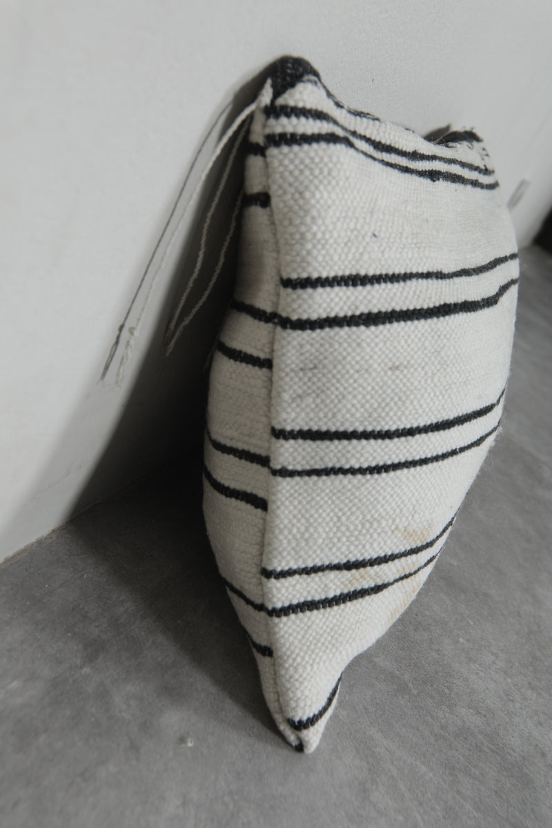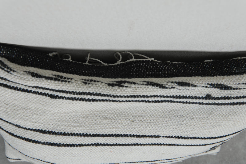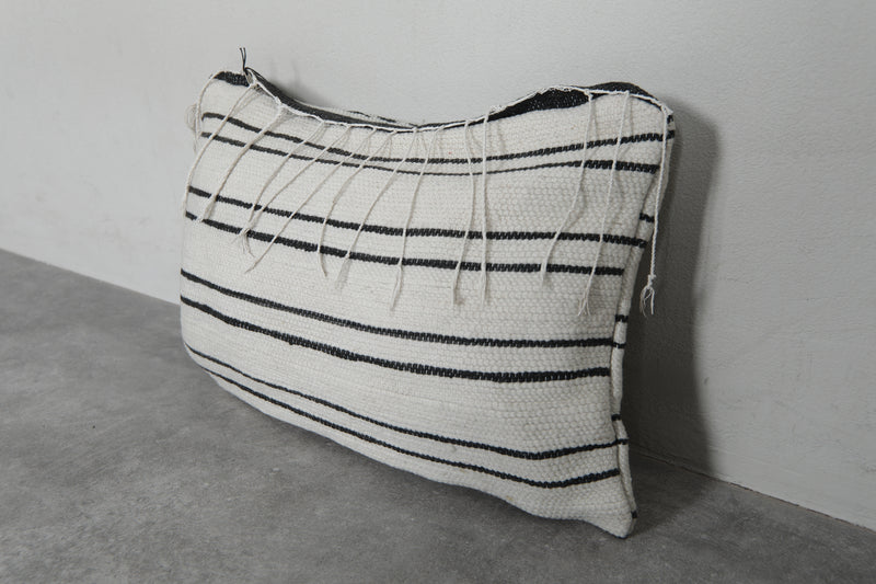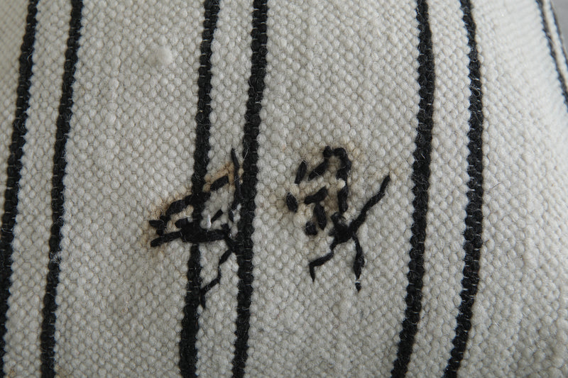 Add timeless elegance to your home with this handwoven Moroccan pillow. Featuring classic black stripes on a creamy white background, it exudes a minimalist charm. Subtle embroidery details enhance its unique appeal, making it perfect for contemporary or traditional decor styles. Size: 14.1 x 19.6 inches.