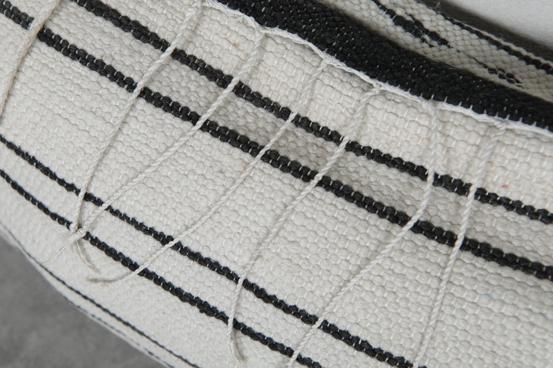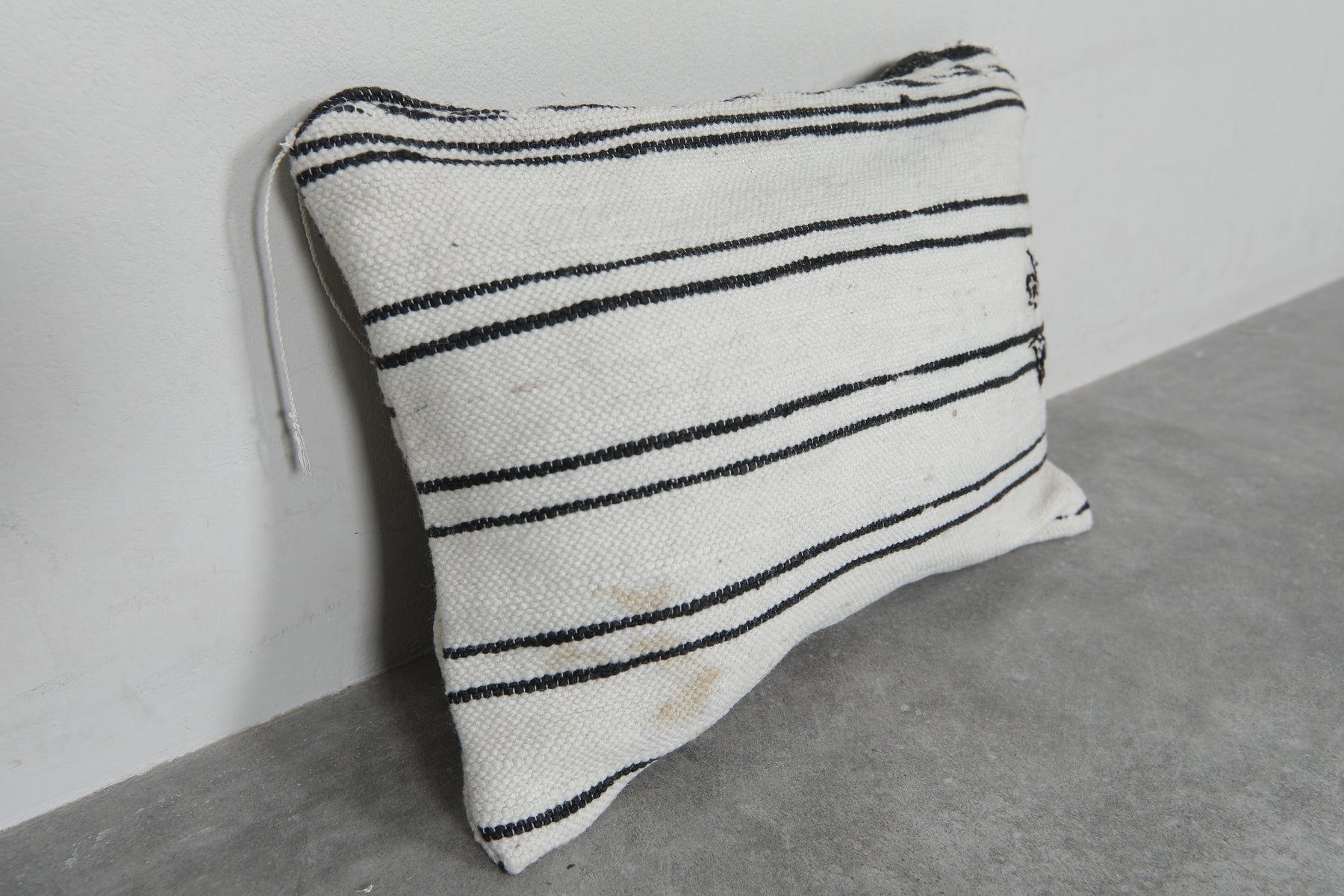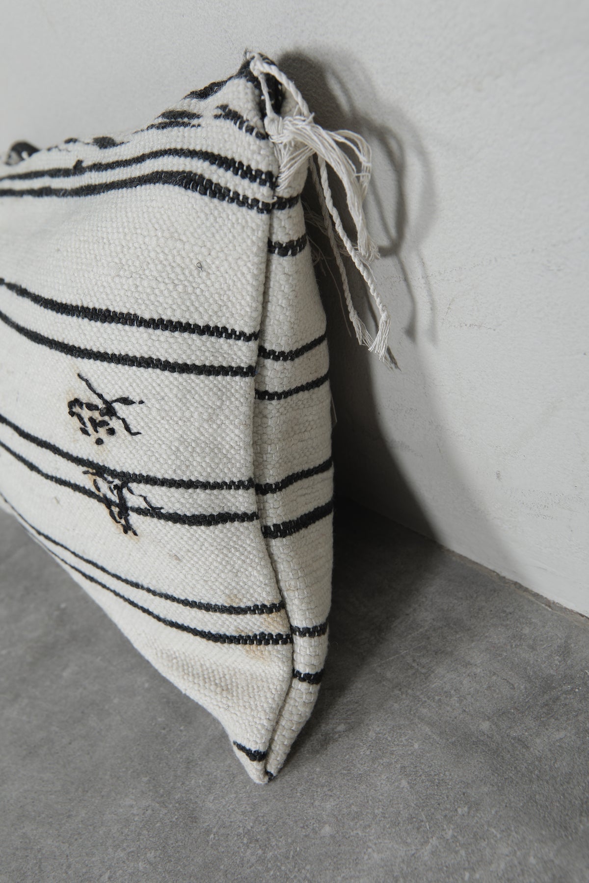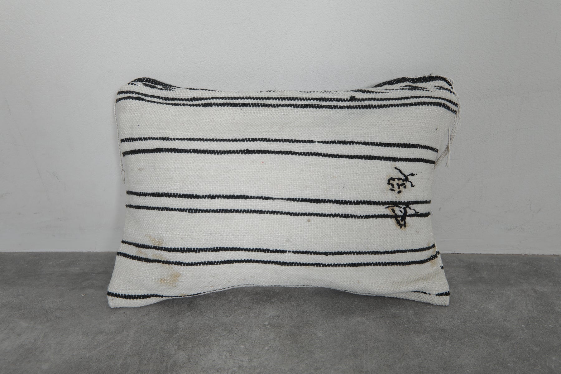 Add timeless elegance to your home with this handwoven Moroccan pillow. Featuring classic black stripes on a creamy white background, it exudes a minimalist charm. Subtle embroidery details enhance its unique appeal, making it perfect for contemporary or traditional decor styles. Size: 14.1 x 19.6 inches.