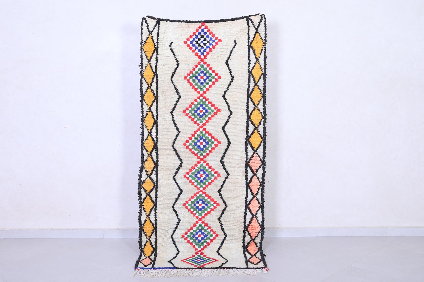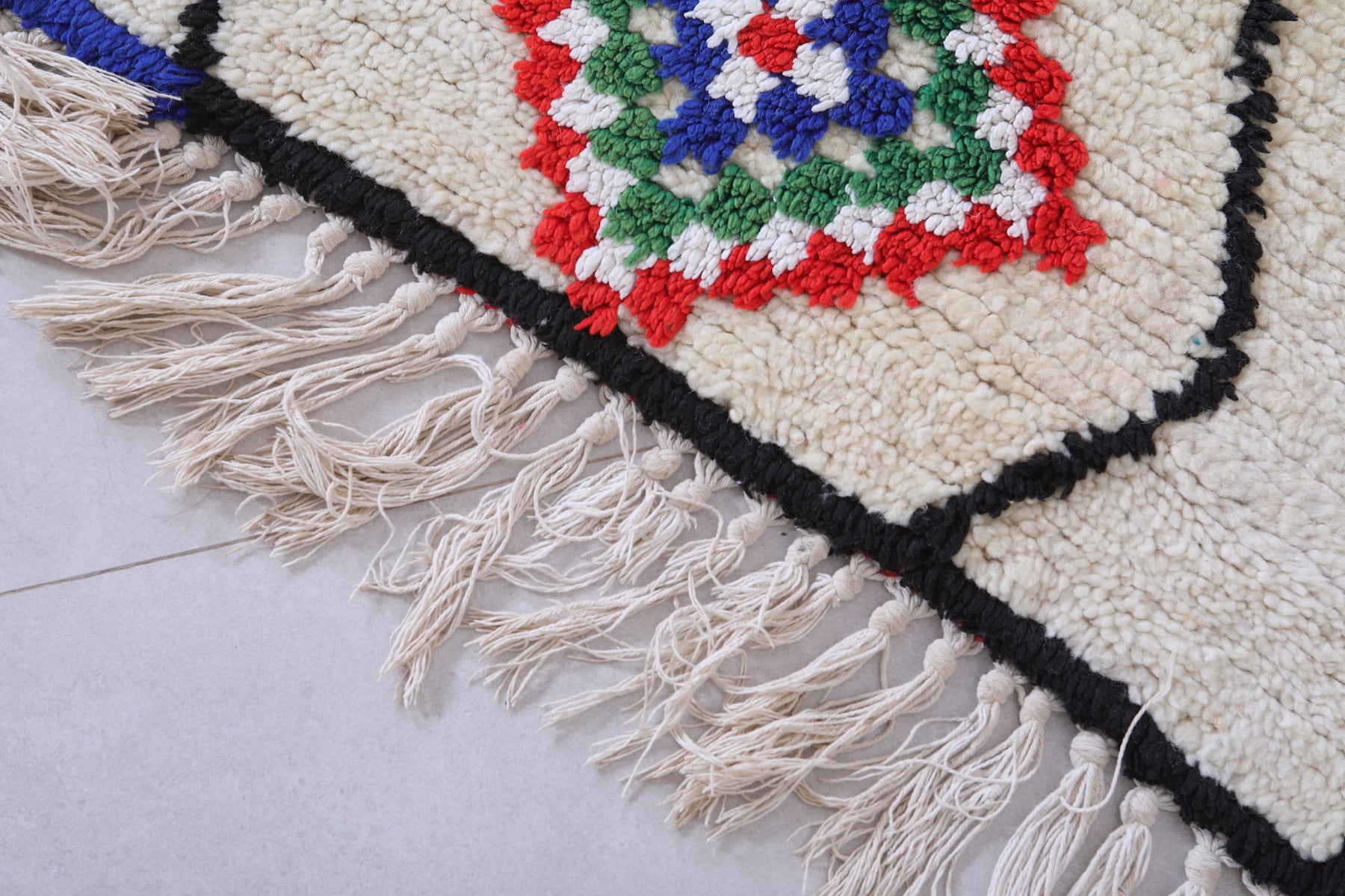 Bring Moroccan heritage to life with this Moroccan Tribal Hallway Rug Runner, measuring 2.9 FT x 6.4 FT. Featuring vivid diamond motifs in red, blue, pink, and green framed by black and yellow borders, this handwoven piece delivers culture, energy, and texture to any narrow space.