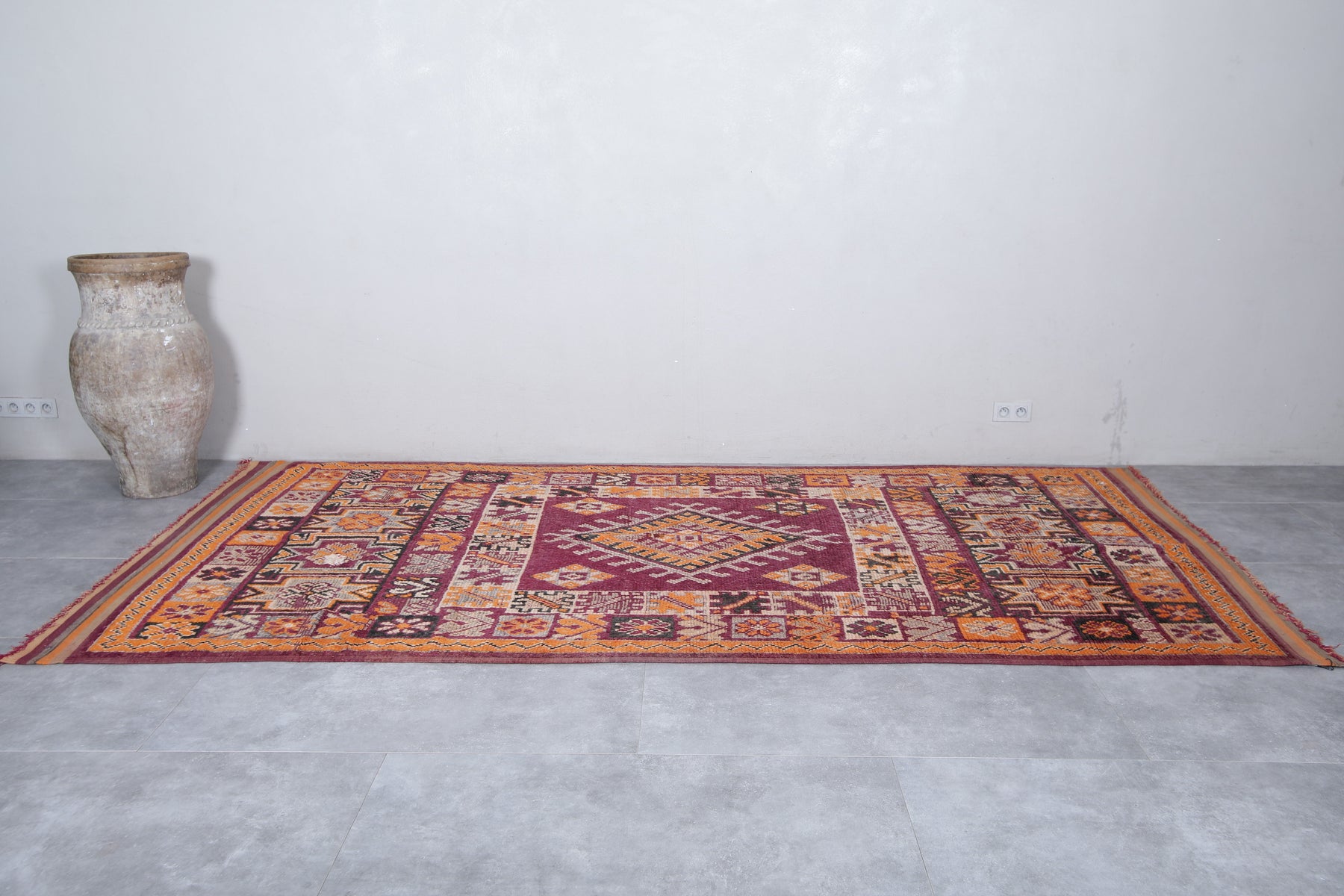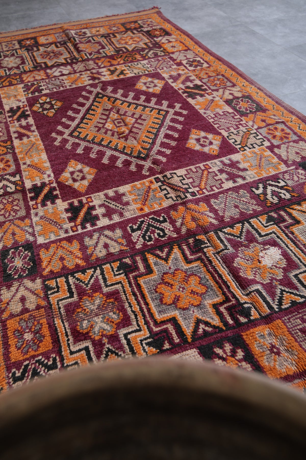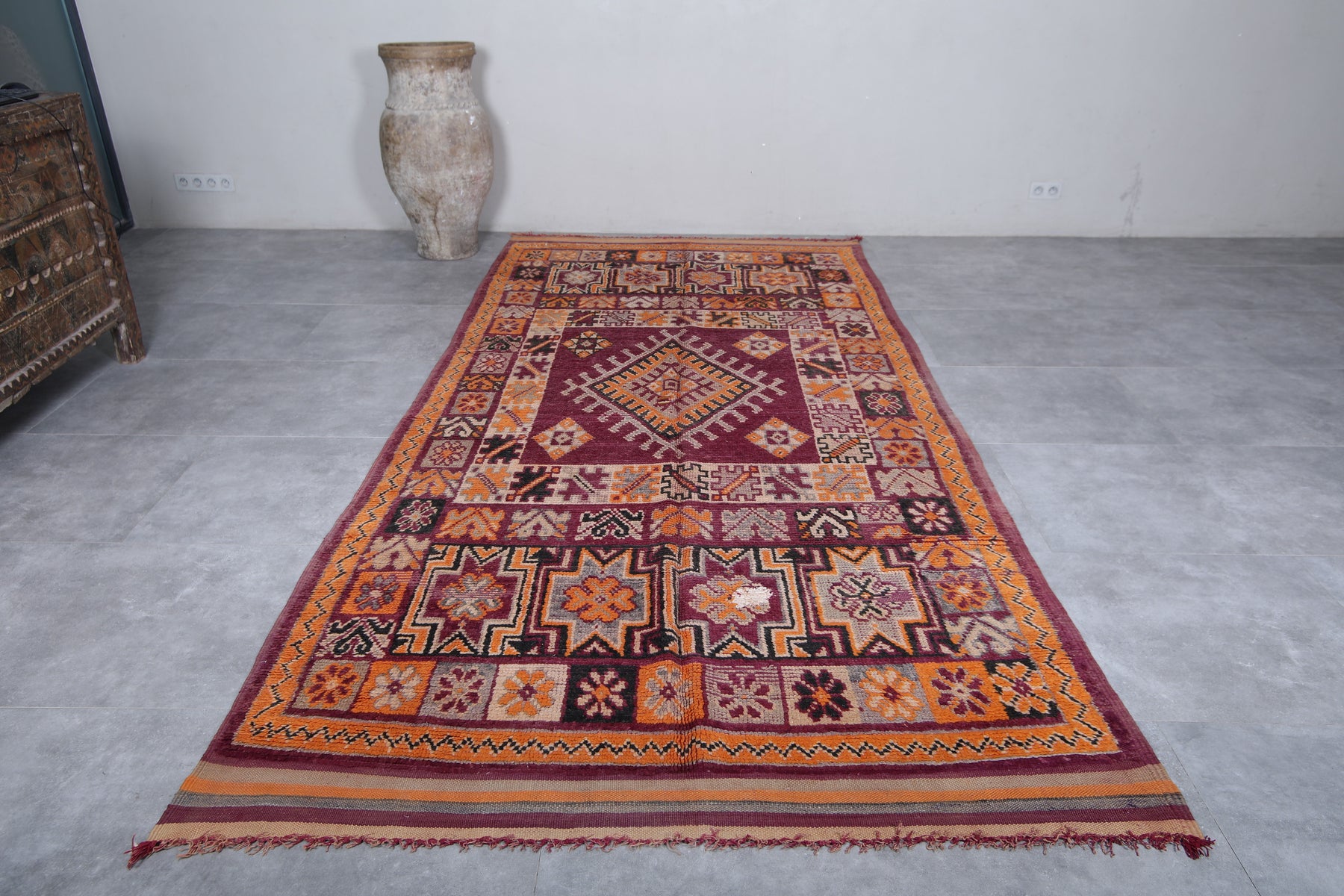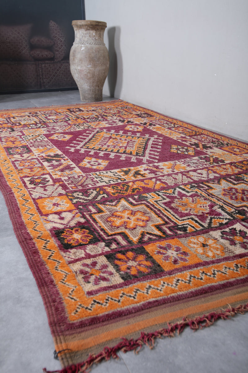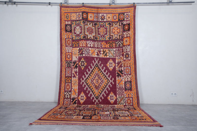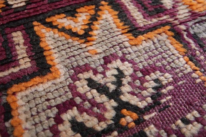 Add a bold touch to your interior with this stunning Moroccan tribal rug, measuring 5.8 FT x 12.2 FT. Handwoven by Berber artisans, this piece showcases intricate geometric patterns and a prominent central diamond motif surrounded by decorative tribal symbols. The vibrant palette of deep red, rich orange, and earthy tones makes this vintage rug a lively statement piece. Perfect for spacious living areas, dining rooms, or open spaces, this unique carpet reflects Morocco’s rich cultural craftsmanship and brings warmth, authenticity, and character to your home decor.