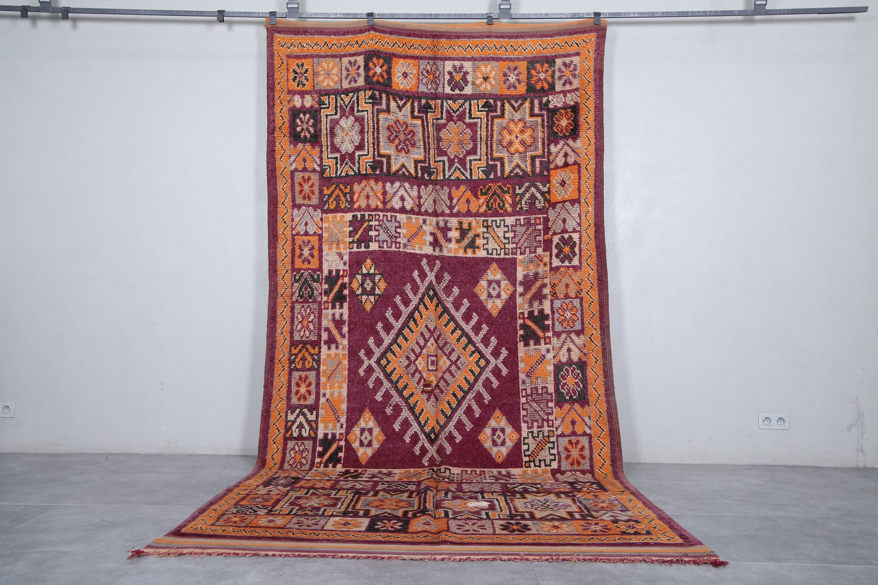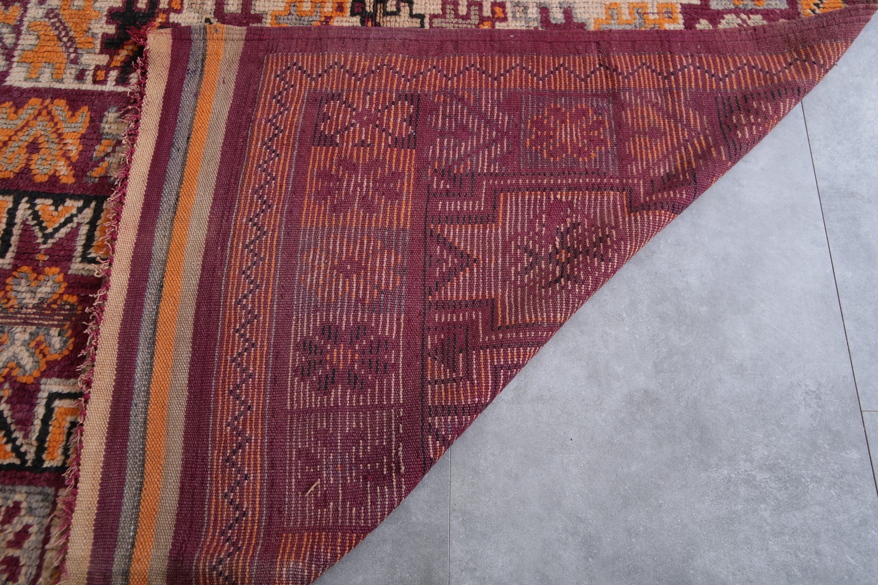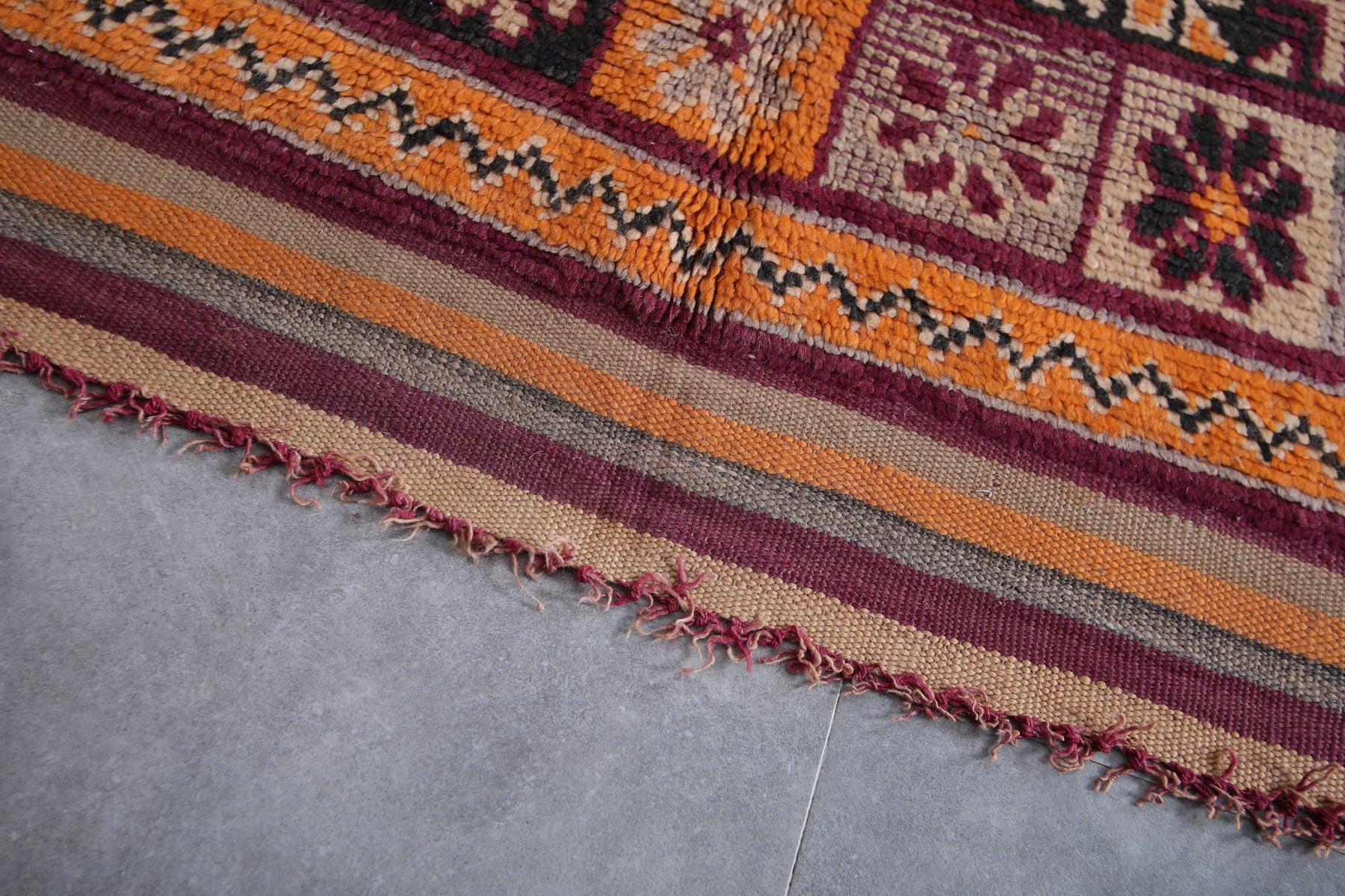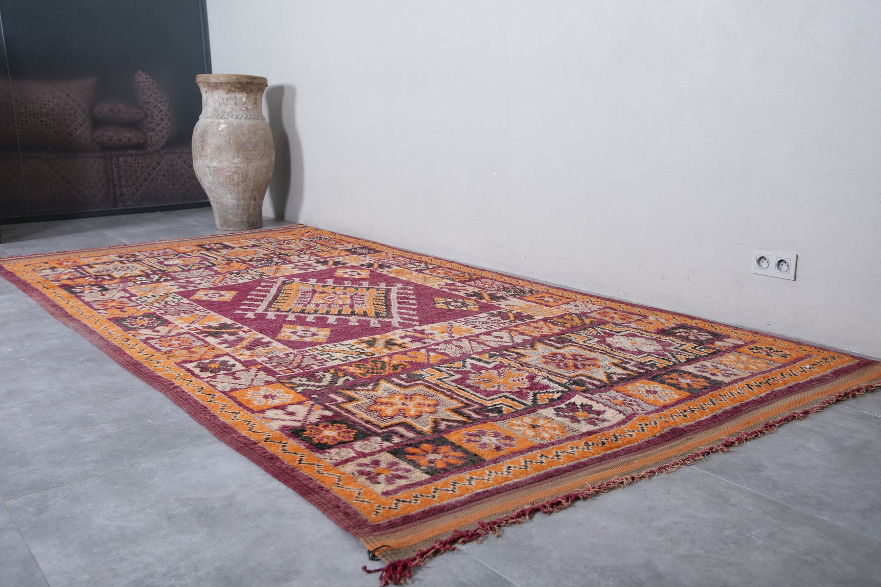 Add a bold touch to your interior with this stunning Moroccan tribal rug, measuring 5.8 FT x 12.2 FT. Handwoven by Berber artisans, this piece showcases intricate geometric patterns and a prominent central diamond motif surrounded by decorative tribal symbols. The vibrant palette of deep red, rich orange, and earthy tones makes this vintage rug a lively statement piece. Perfect for spacious living areas, dining rooms, or open spaces, this unique carpet reflects Morocco’s rich cultural craftsmanship and brings warmth, authenticity, and character to your home decor.