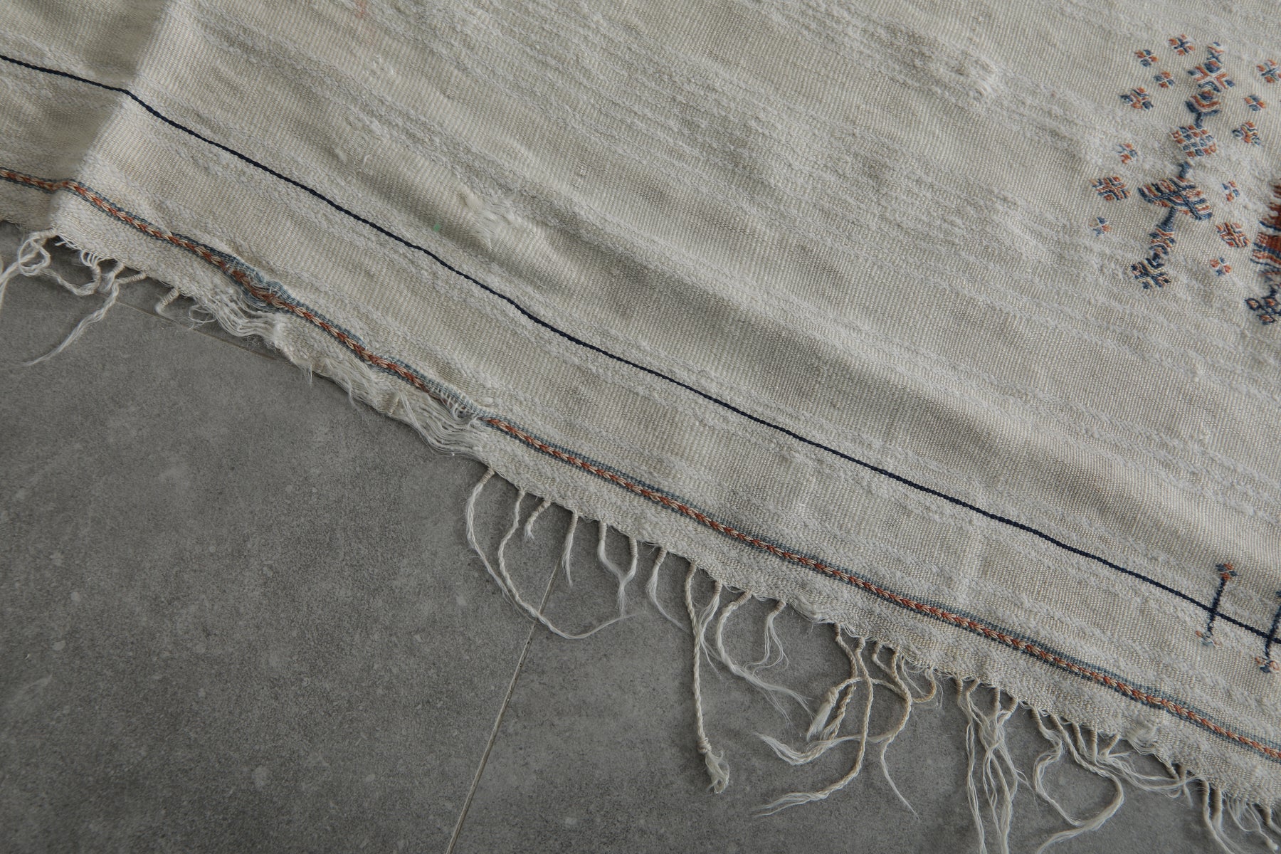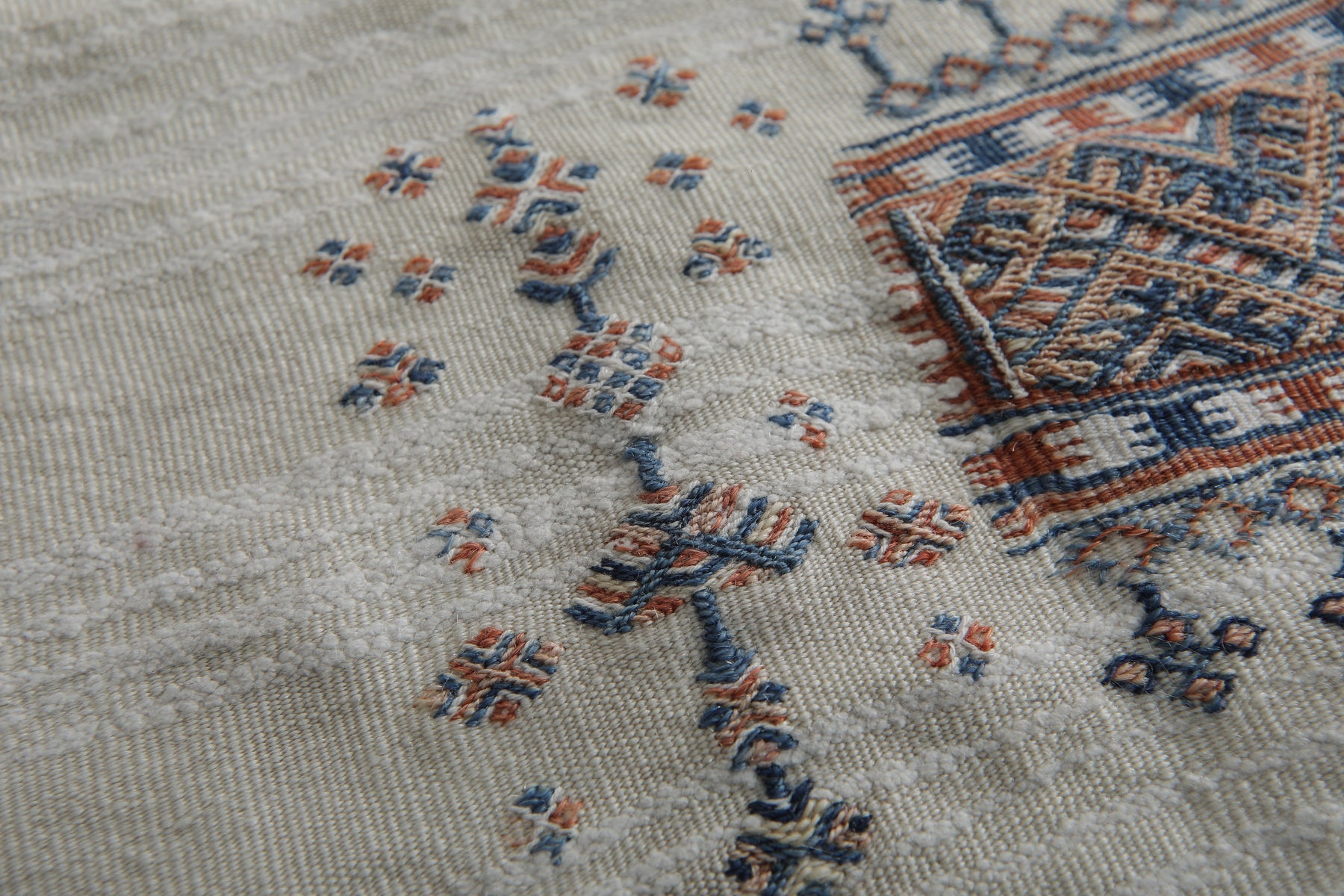 This 4.5 x 11.4 feet Moroccan Vintage Handwoven Kilim features traditional embroidery with intricate patterns and soft natural tones, adding elegance and cultural depth to any space. Handwoven by skilled artisans, this exquisite rug brings a touch of Moroccan charm and sophistication, making it perfect for living rooms, bohemian-inspired interiors, or modern decor.