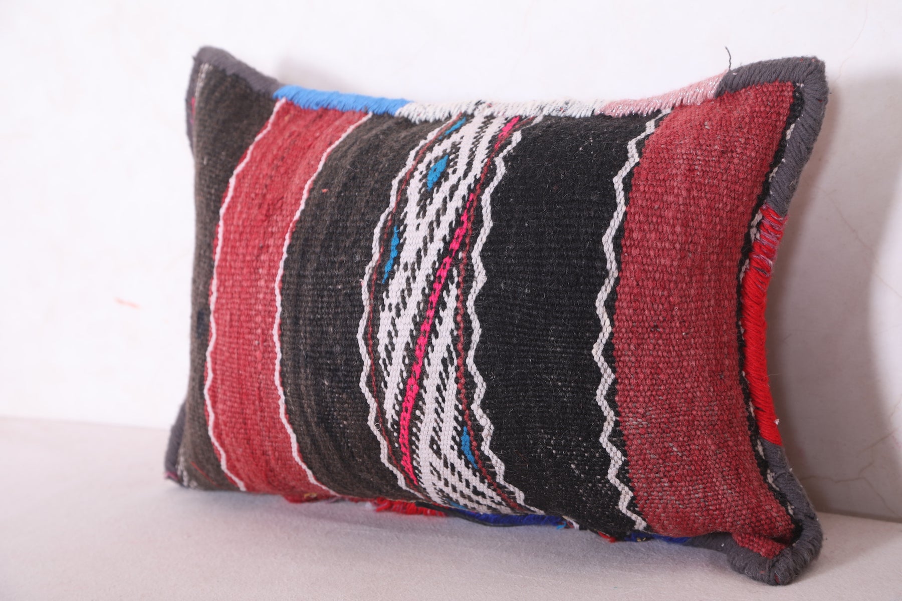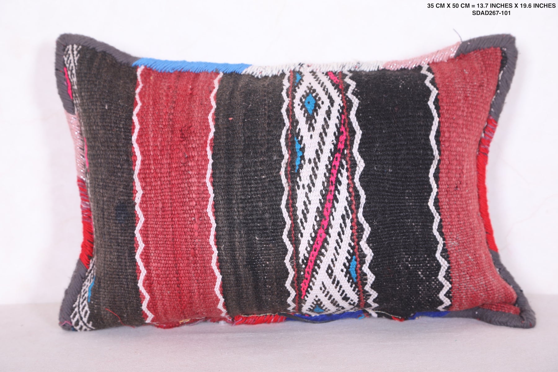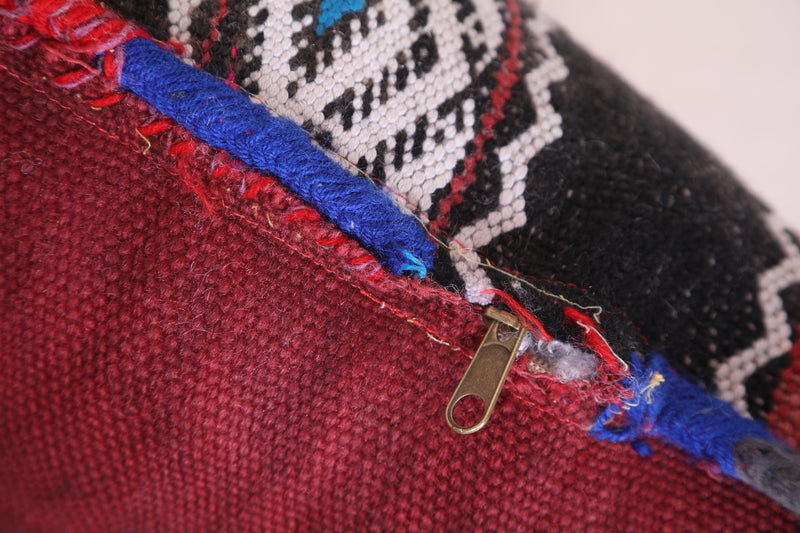 Add bold texture and timeless style to your home with this Moroccan Pillow, sized at 13.7 x 19.6 inches (35 CM x 50 CM). Expertly handcrafted by Moroccan artisans, this pillow features rich stripes in black, red, and white, blending traditional patterns with modern flair. Its unique design and high-quality craftsmanship make it a perfect accent piece for your sofa, bed, or reading nook.