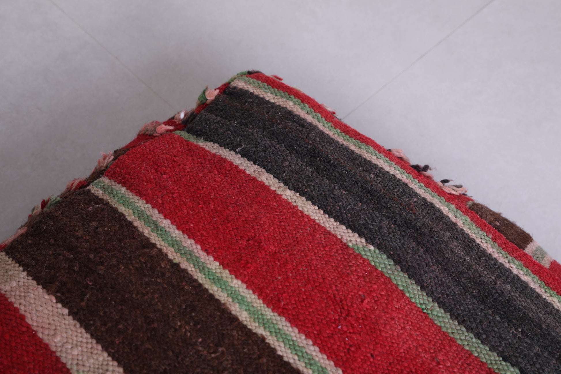 Infuse your space with earthy tones and timeless texture with this multicolored dark Moroccan ottoman pillow. Handcrafted from a repurposed vintage rug, it features rich red, brown, charcoal, and olive green stripes contrasted with raised wool accents. A functional statement piece that combines softness and structure for boho and rustic interiors.