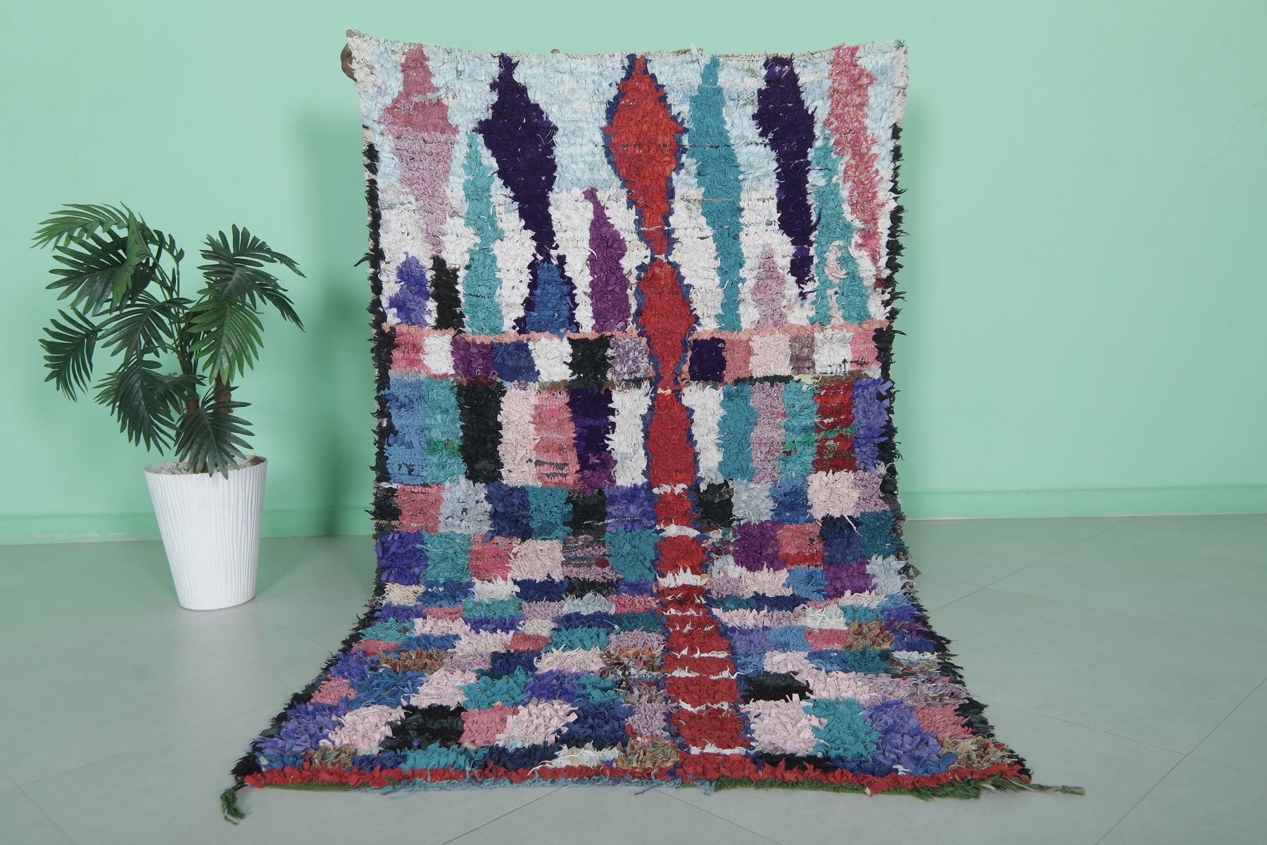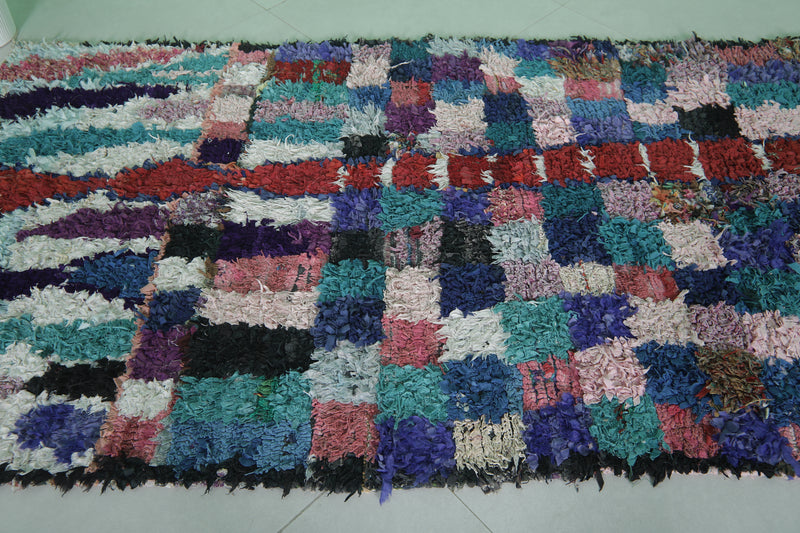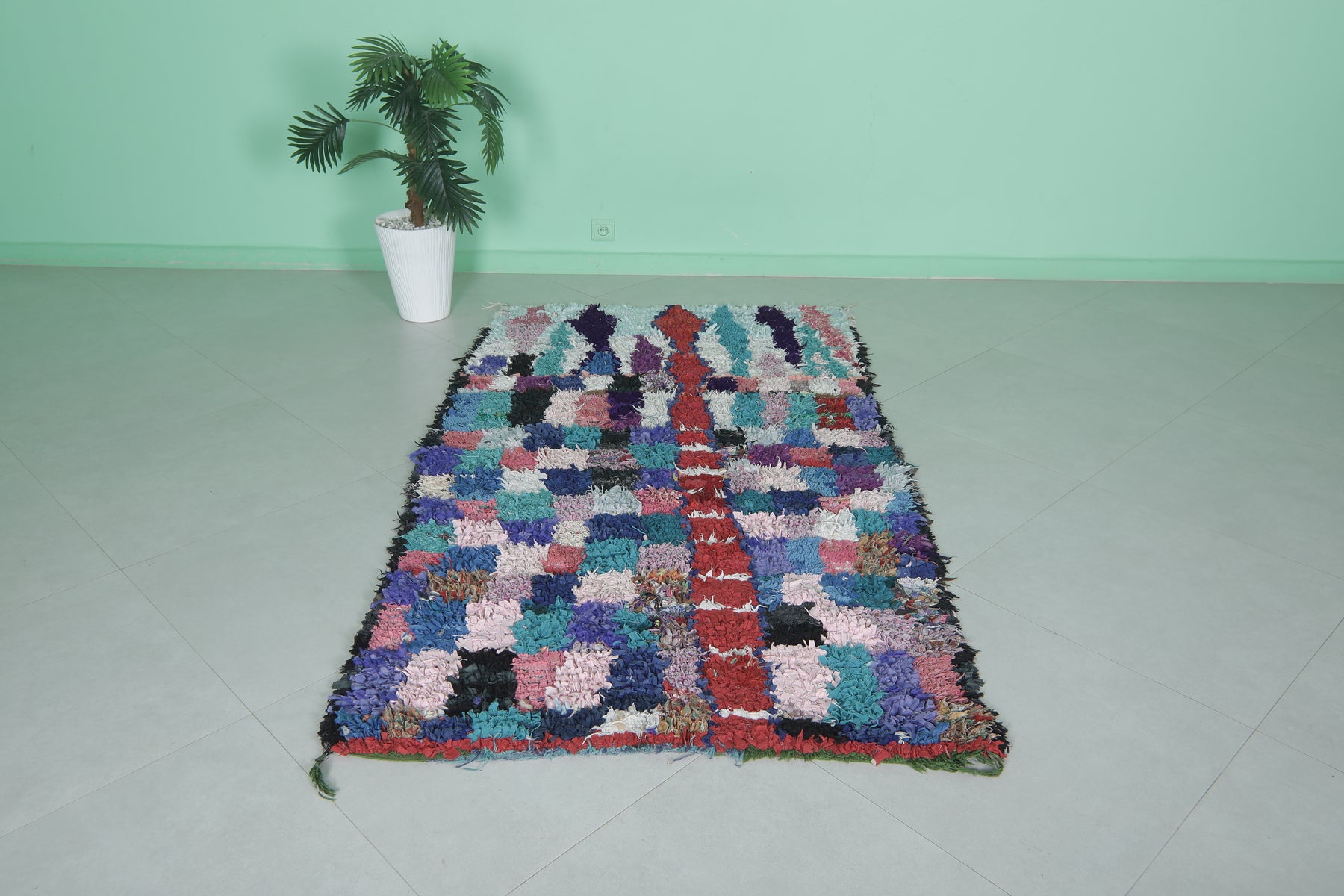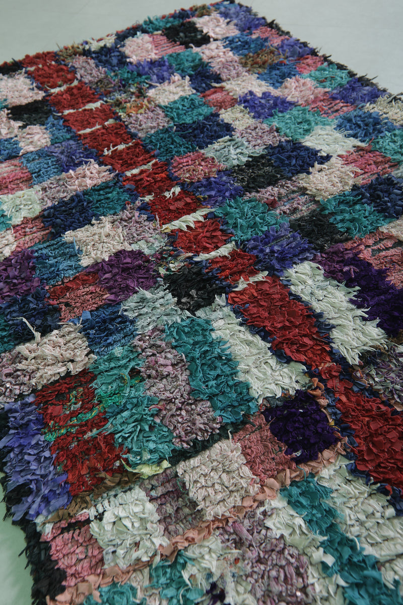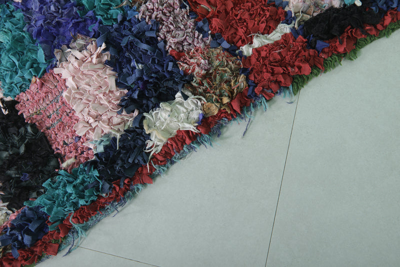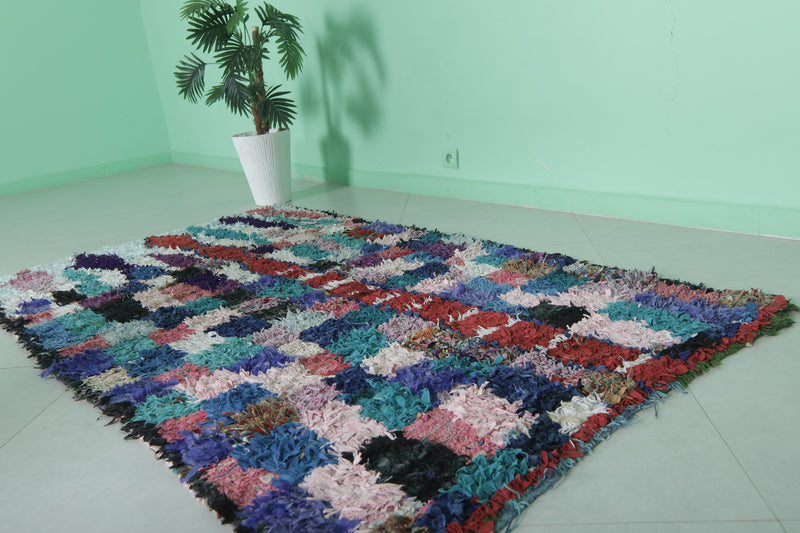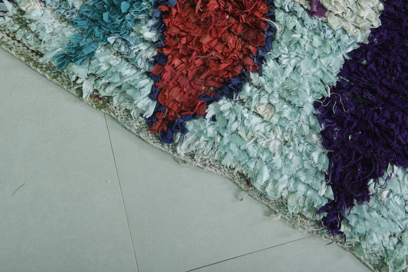 This 3.8 x 6.8 feet multicolored Moroccan rug features a vibrant patchwork design with tones of blue, purple, red, and pink, creating a lively and artistic statement piece. Handwoven by skilled artisans, this rug blends traditional weaving techniques with modern aesthetics, making it perfect for living areas, bedrooms, or offices.