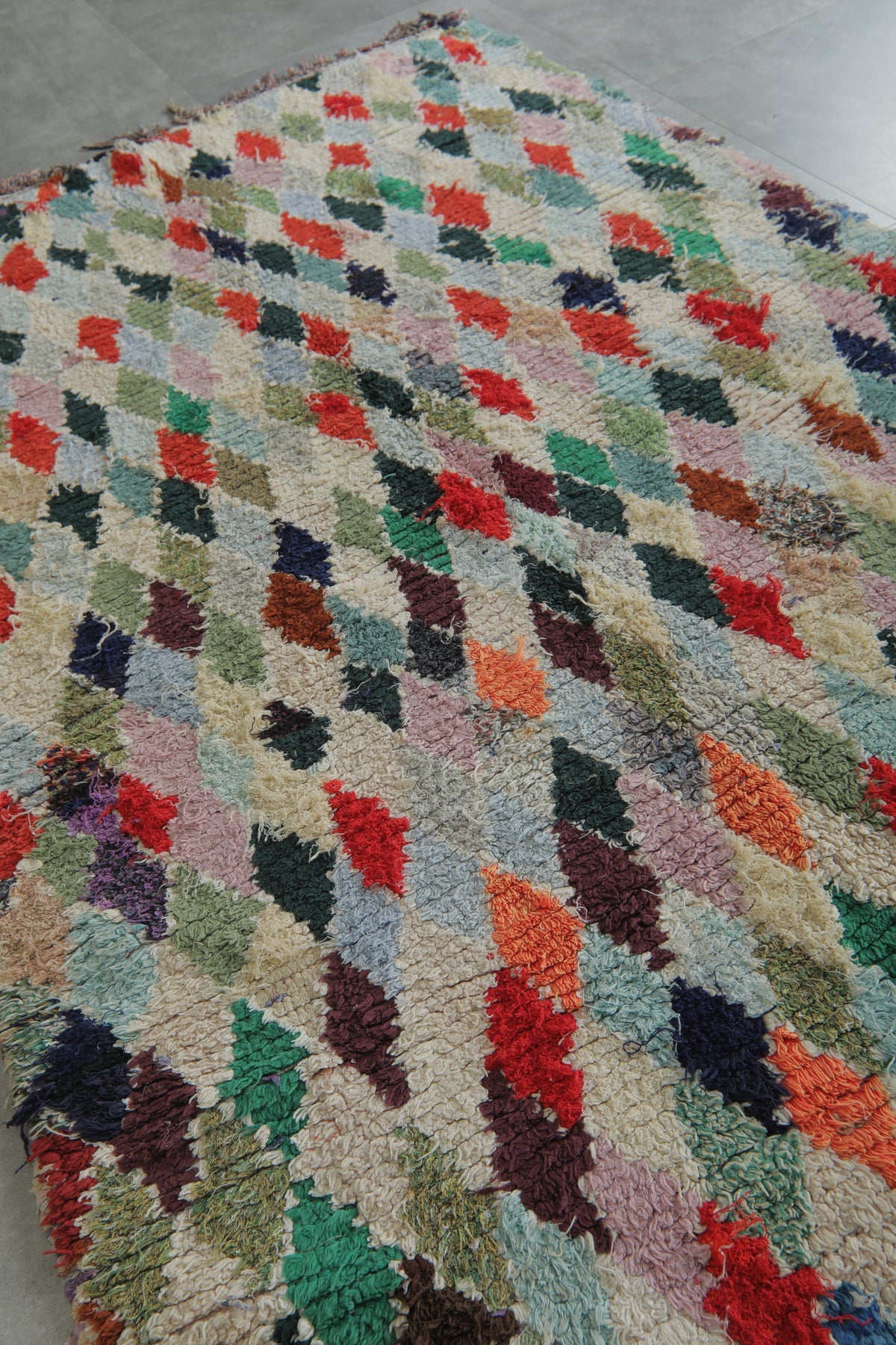 A joyful display of Berber artistry, this vintage Moroccan rug is adorned with a cascading diamond lattice pattern. Vibrant shades of red, forest green, navy blue, lilac, and burnt orange contrast against a soft ivory background, creating an eye-catching yet balanced look perfect for eclectic or modern interiors.
