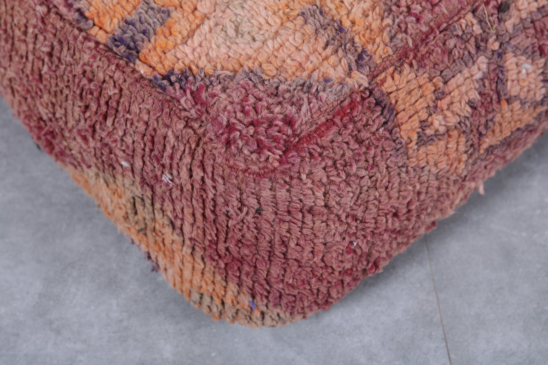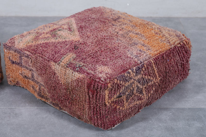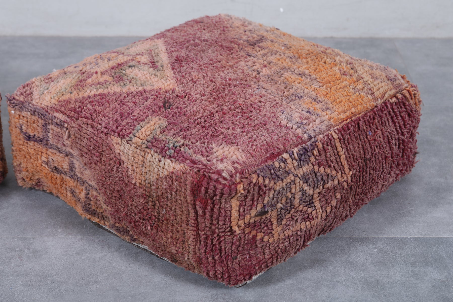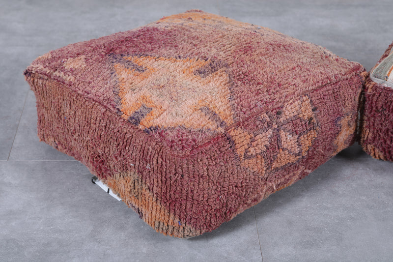 A rich, rustic palette and bold tribal shapes define this pair of vintage Moroccan poufs. Made from repurposed Boucherouite rugs, each ottoman showcases handwoven star and diamond motifs in shades of burnt red, ochre, and soft apricot. The thick pile gives them a cozy and textural charm—perfect for grounding boho, eclectic, or earthy interiors.