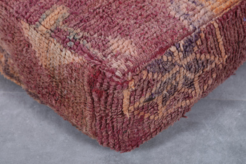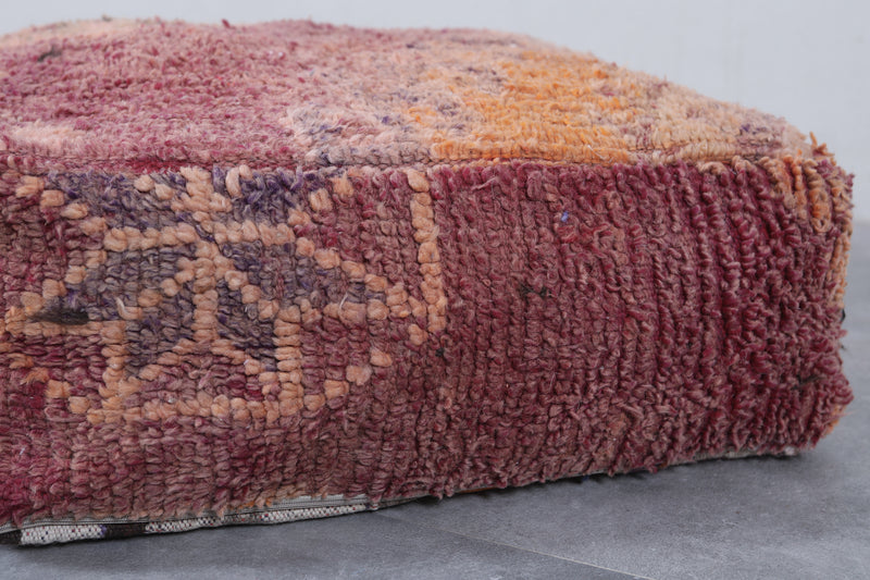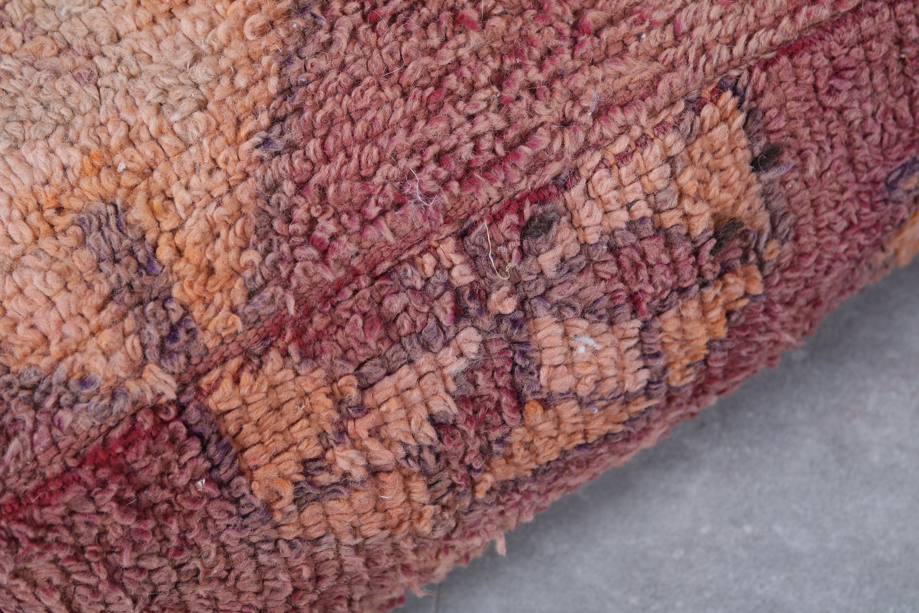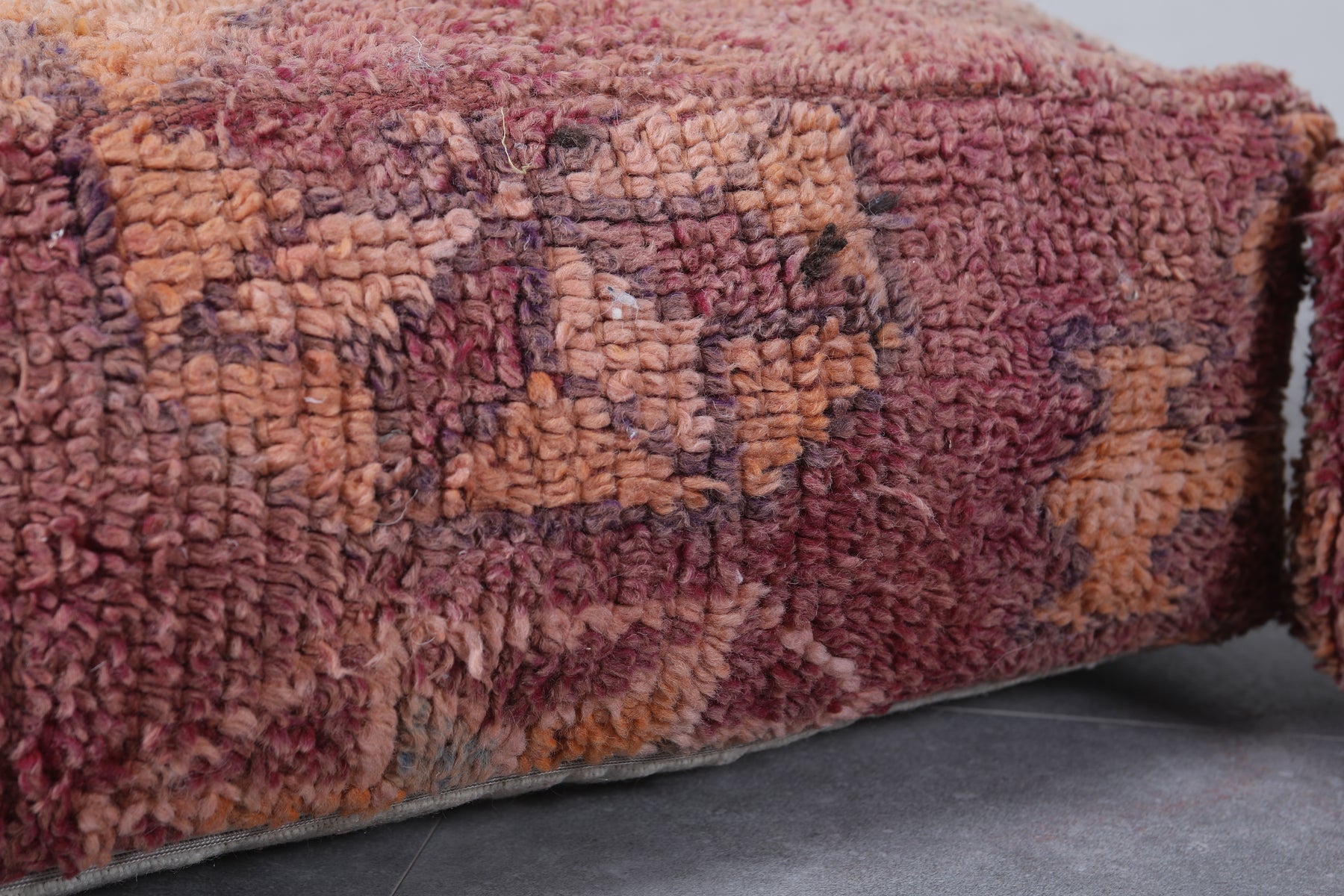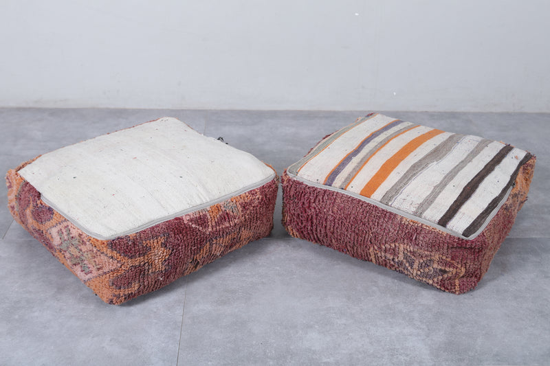 A rich, rustic palette and bold tribal shapes define this pair of vintage Moroccan poufs. Made from repurposed Boucherouite rugs, each ottoman showcases handwoven star and diamond motifs in shades of burnt red, ochre, and soft apricot. The thick pile gives them a cozy and textural charm—perfect for grounding boho, eclectic, or earthy interiors.