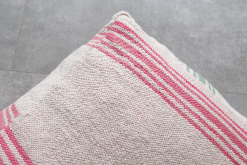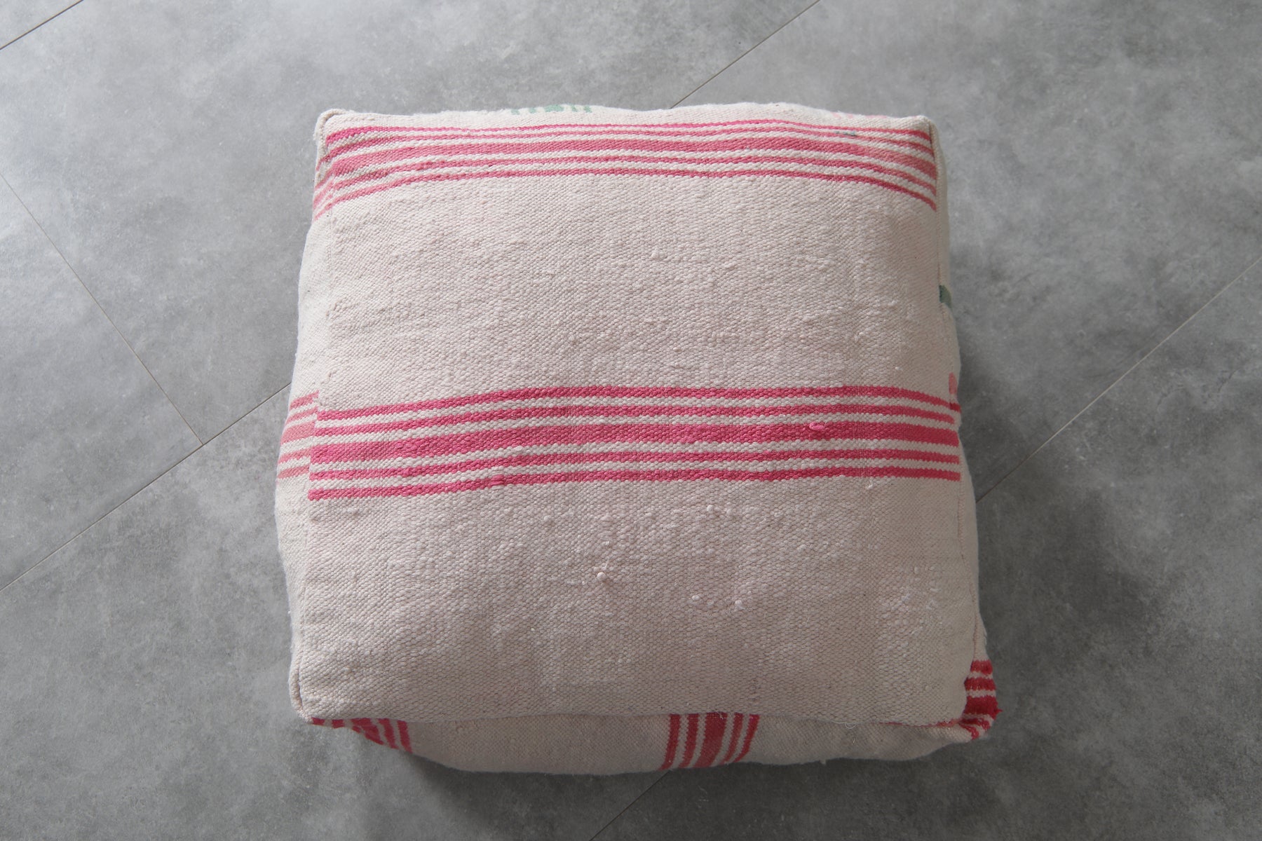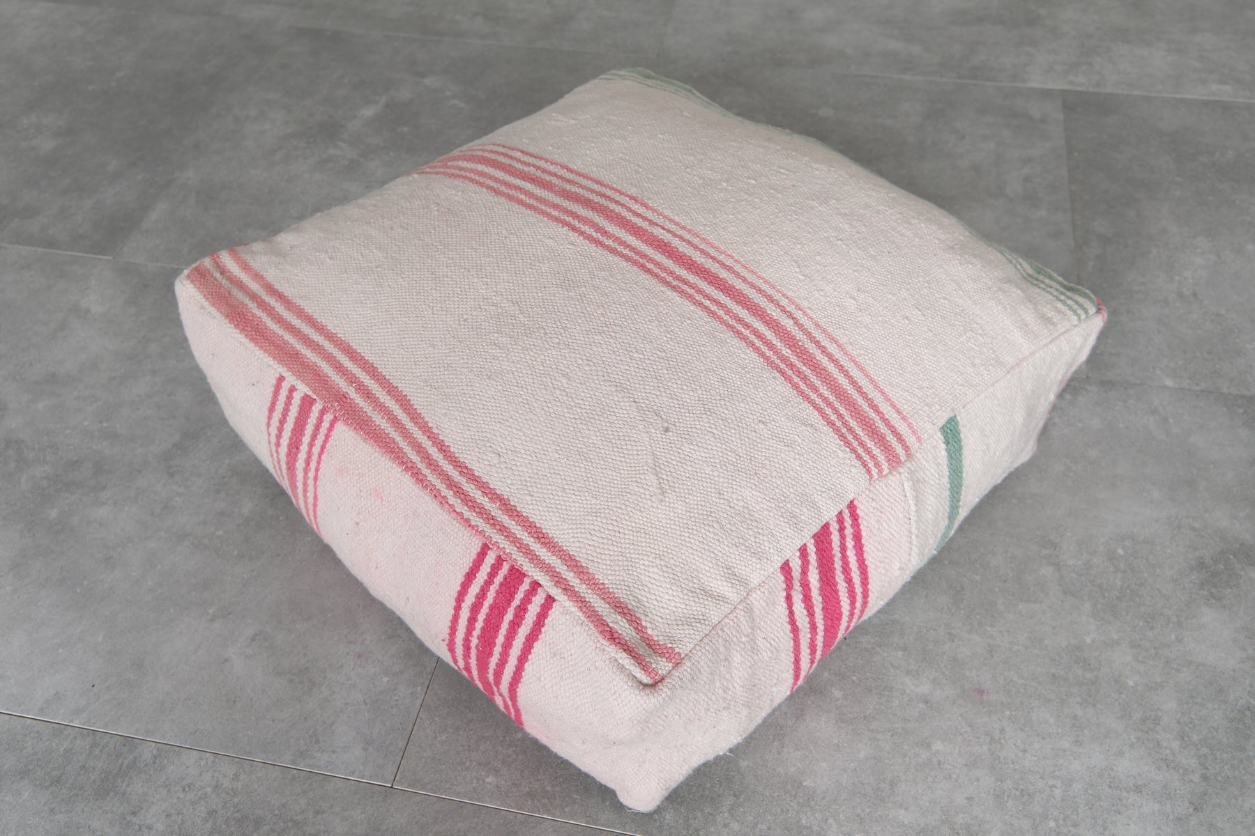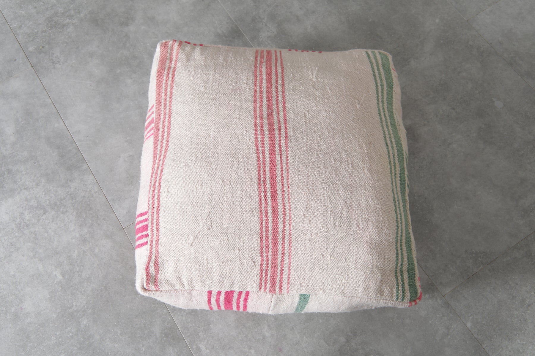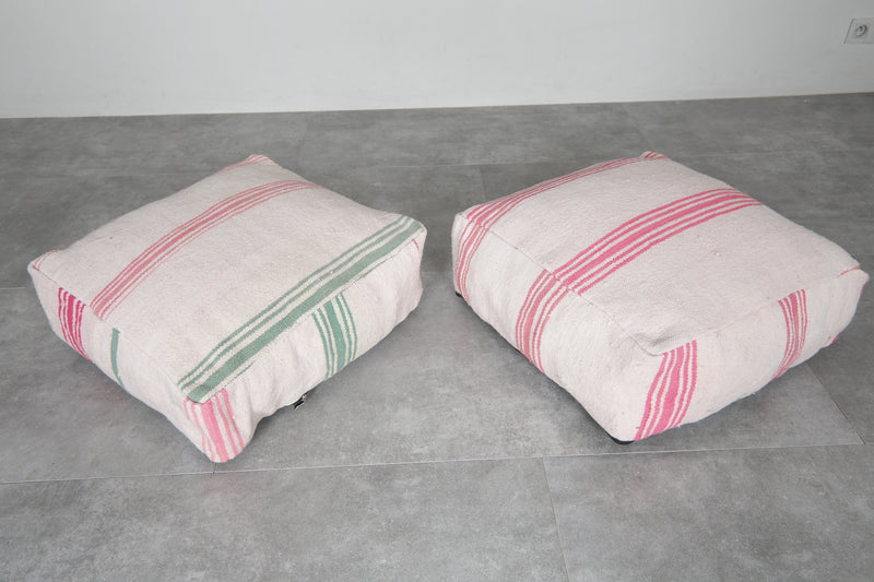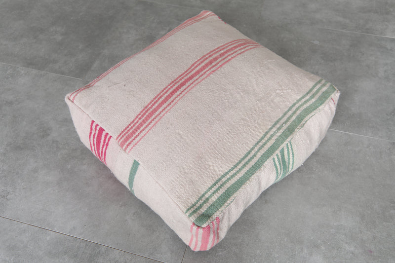 Bring a soft touch of Moroccan charm into your home with this set of two vintage striped ottoman poufs. Handcrafted from traditional textiles, these poufs showcase a clean ivory base accented with vibrant red and green stripes. Whether used for casual seating, footrests, or as accent pieces, their minimalist yet nostalgic design fits beautifully into modern, boho, or cottage-inspired interiors.