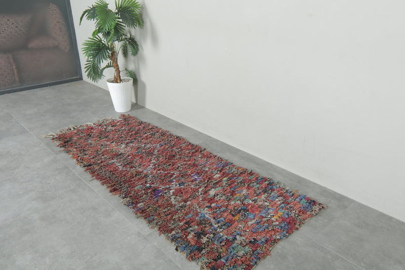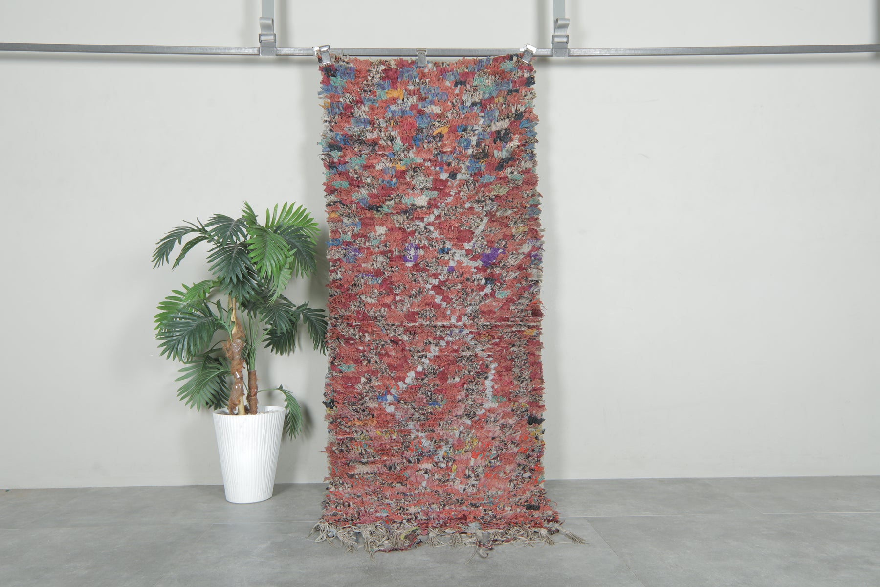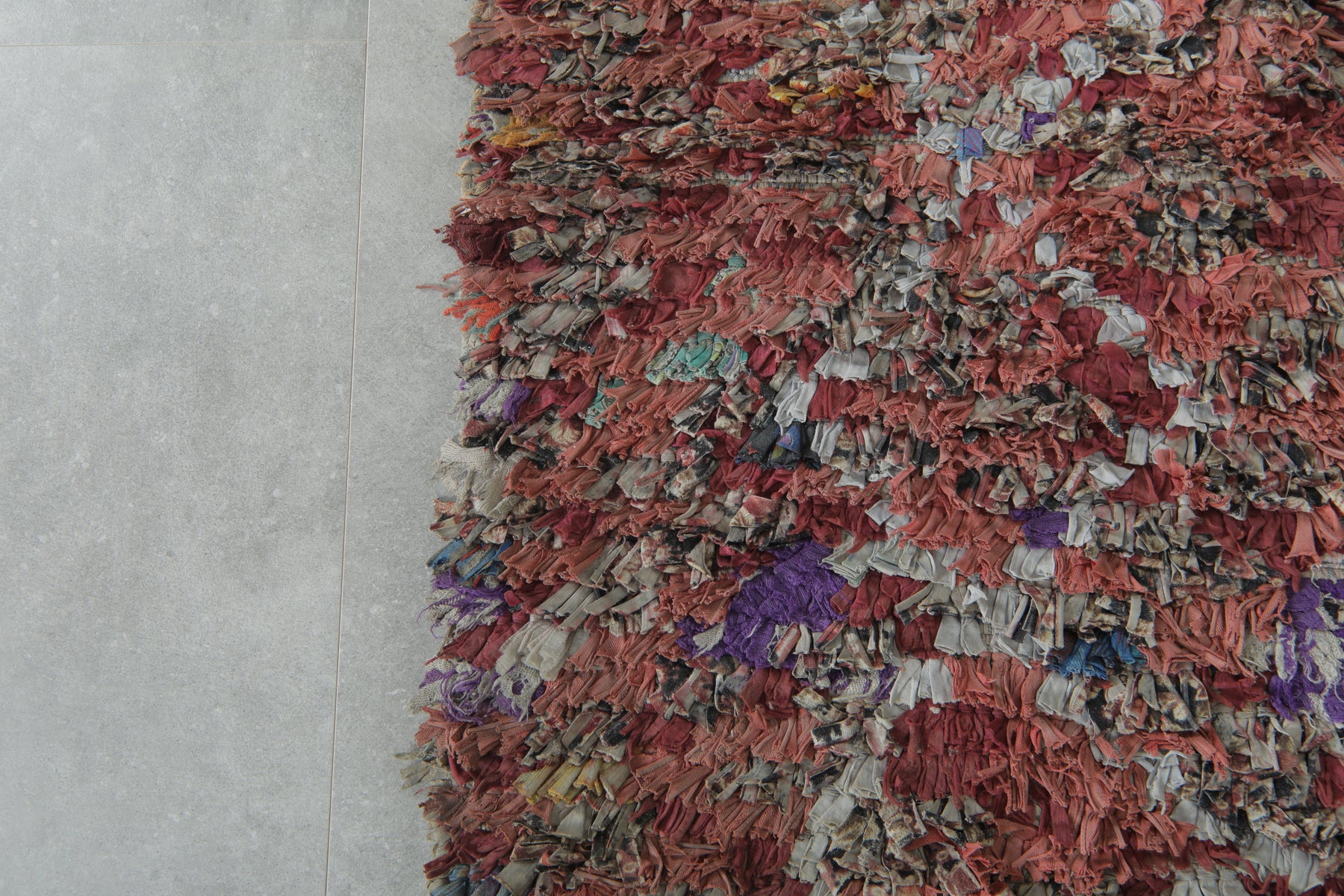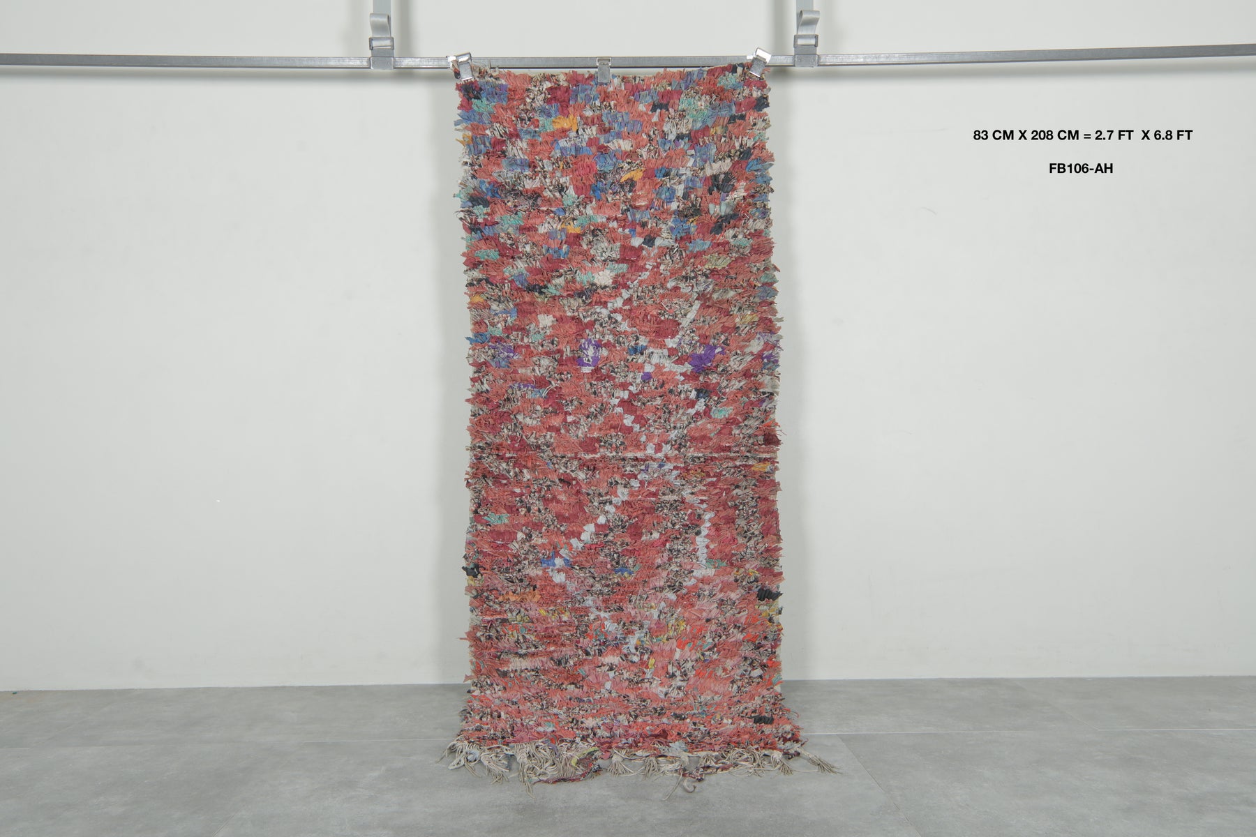 Infuse your hallway or narrow space with rich earthy warmth using this vintage Moroccan runner. Woven from upcycled textiles, the rug features a dominant coral-red hue with scattered pops of teal, violet, white, and orange. Its freeform pattern and shaggy texture create an inviting, organic vibe—perfect for boho and eclectic interiors.