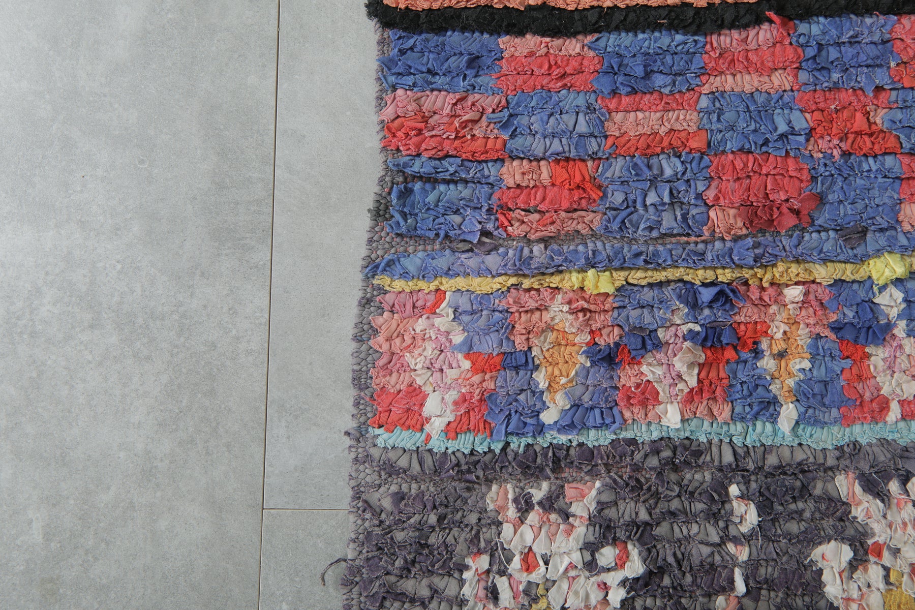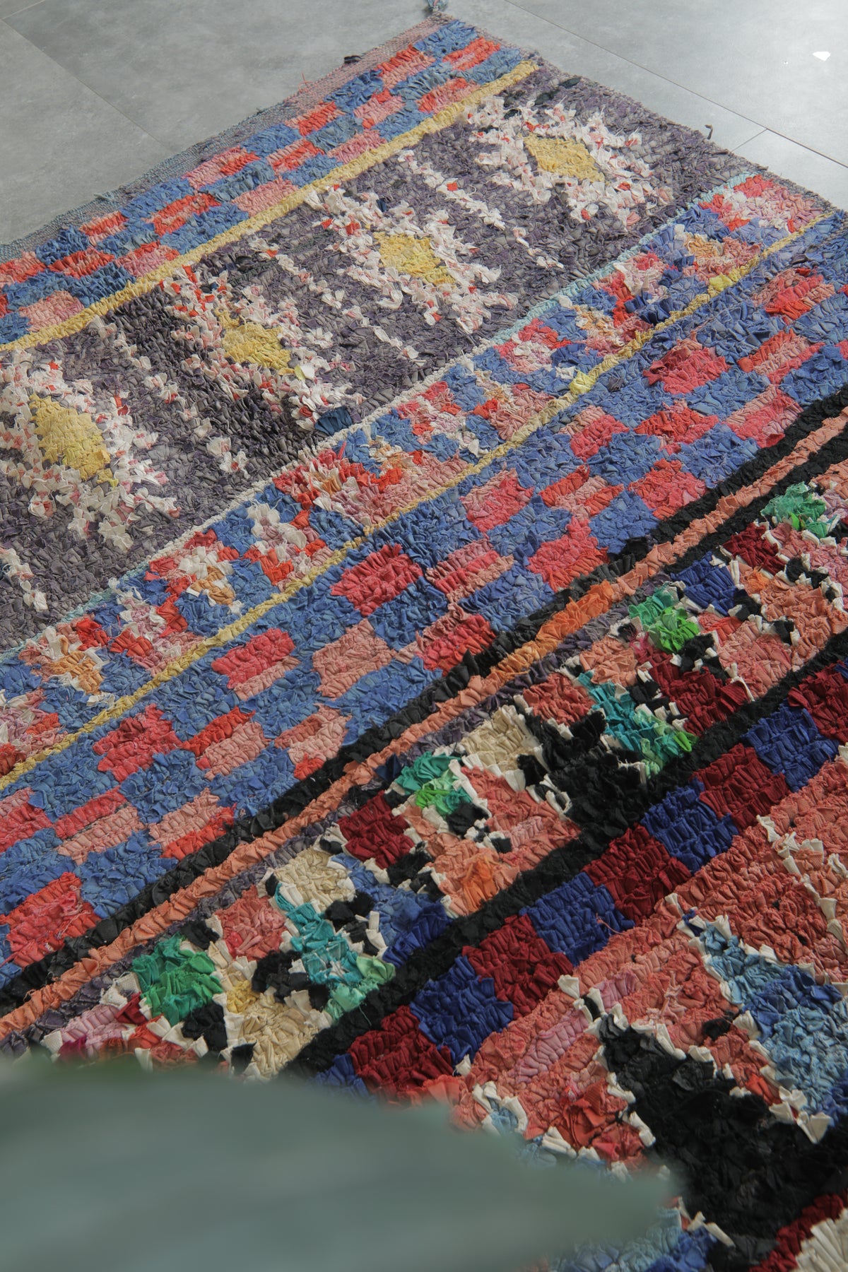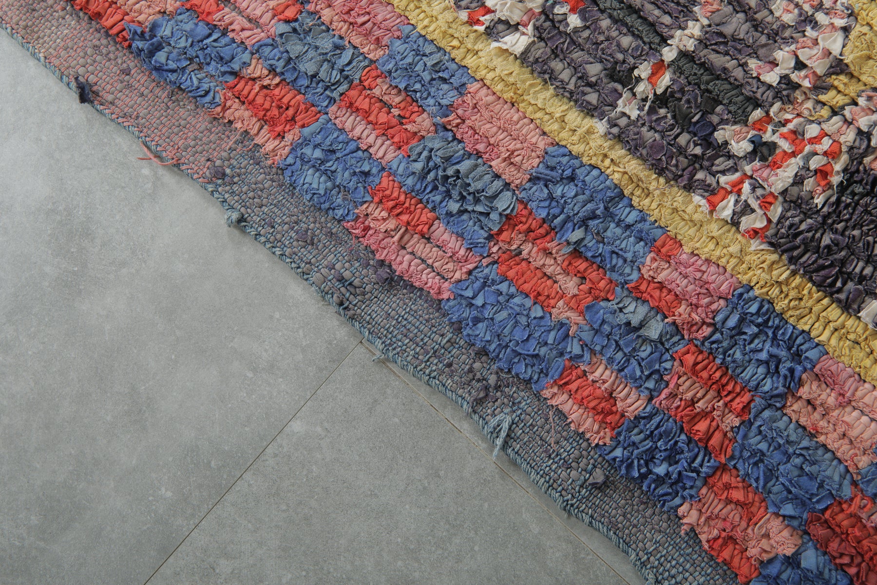 A bold mix of tradition and artistic freedom, this 4.6 x 5.2 ft Moroccan Boucherouite rug is a true celebration of pattern and rhythm. Featuring stacked tribal stripes in rich tones—sunny yellow, denim blue, fire red, and soft lilac—it’s a visual journey through color, culture, and texture. Perfect for anyone who loves maximalism, folk art, or eclectic interior styling.