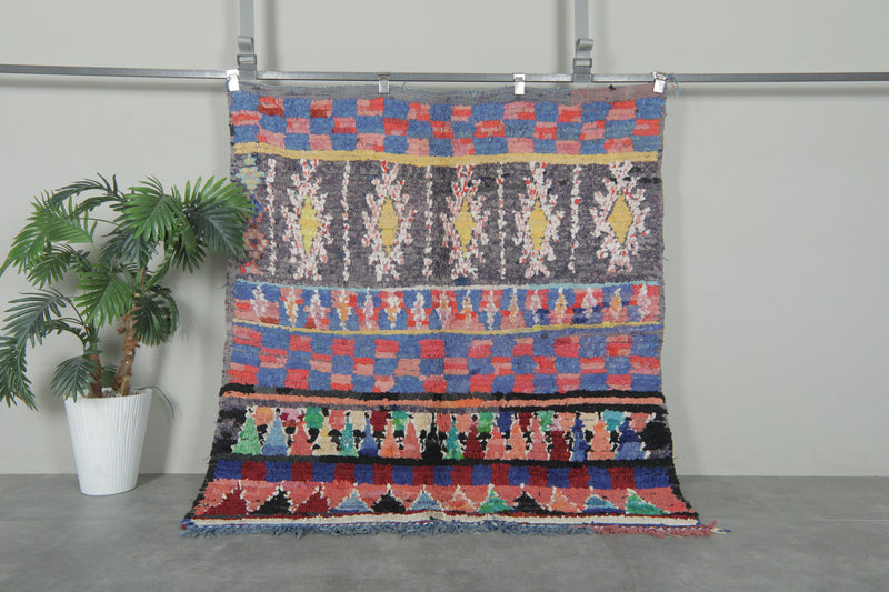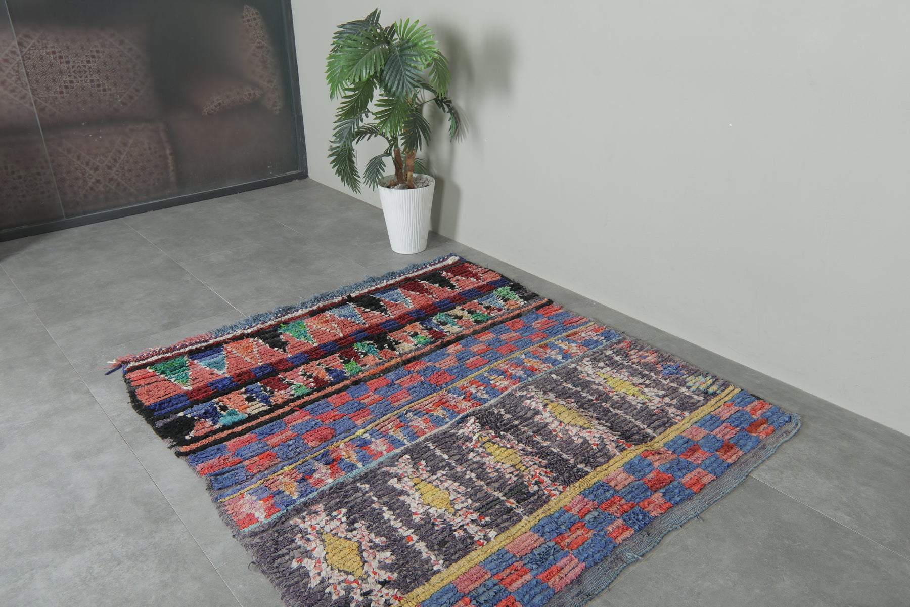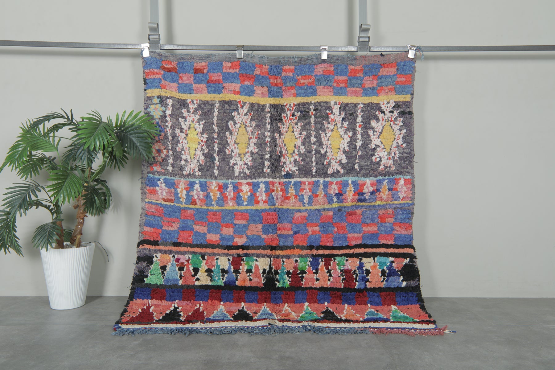 A bold mix of tradition and artistic freedom, this 4.6 x 5.2 ft Moroccan Boucherouite rug is a true celebration of pattern and rhythm. Featuring stacked tribal stripes in rich tones—sunny yellow, denim blue, fire red, and soft lilac—it’s a visual journey through color, culture, and texture. Perfect for anyone who loves maximalism, folk art, or eclectic interior styling.