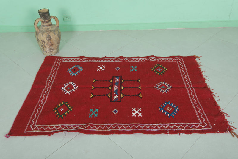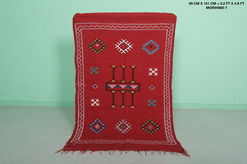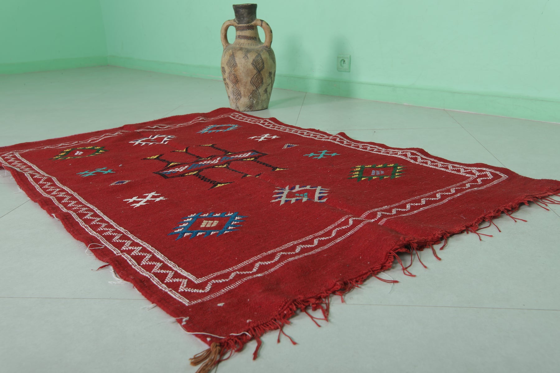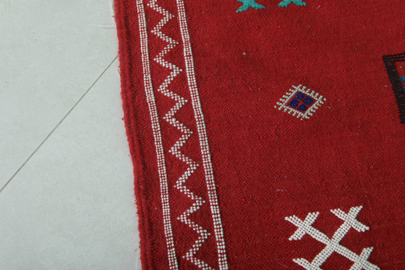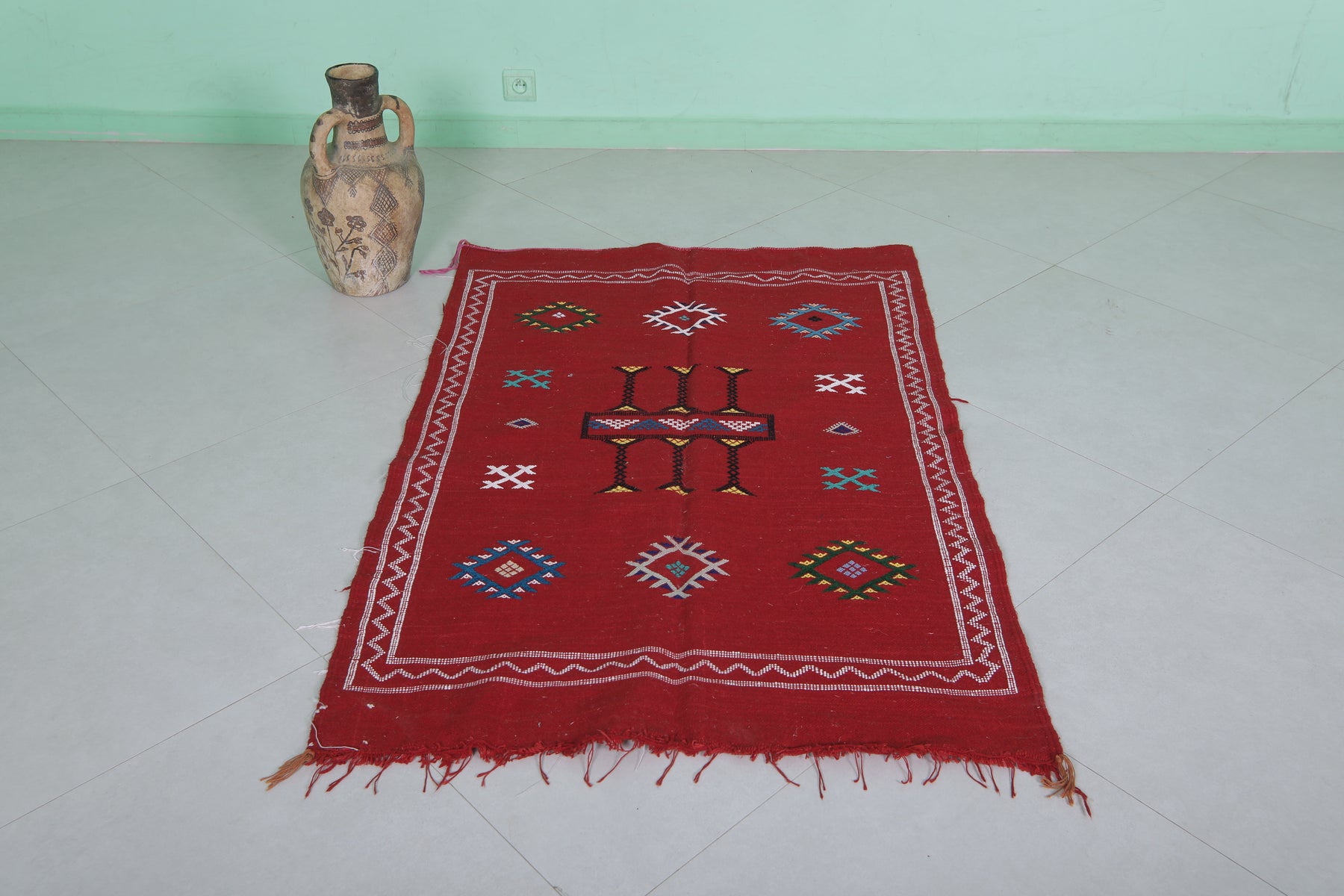 Red Handwoven Moroccan Kilim - 3.2 FT X 4.9 FT | Vibrant Berber Rug