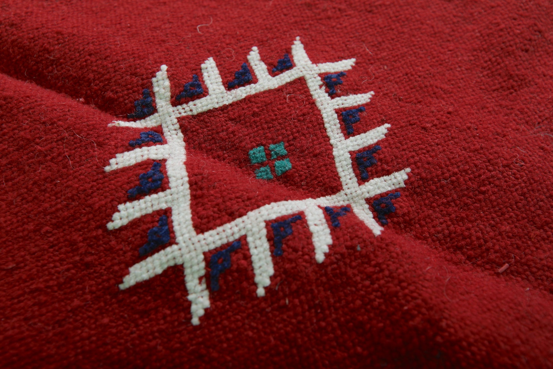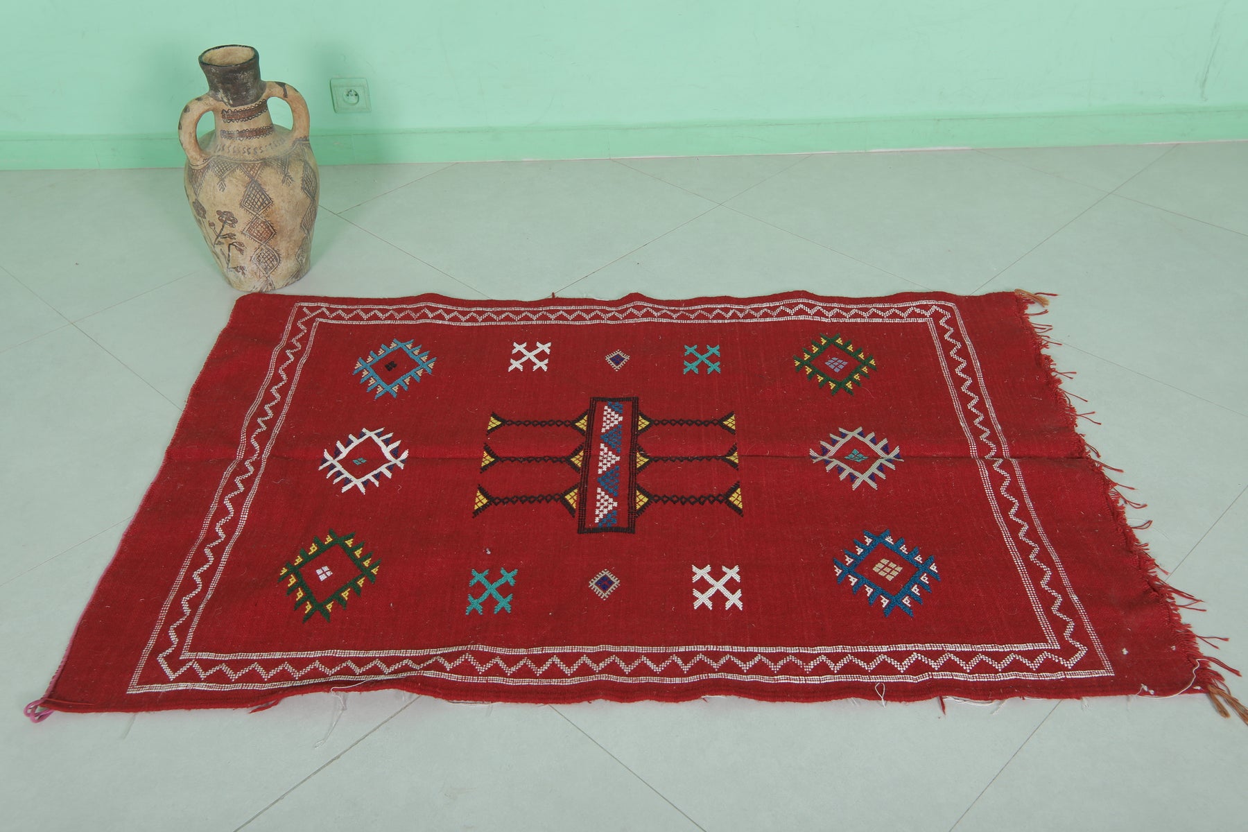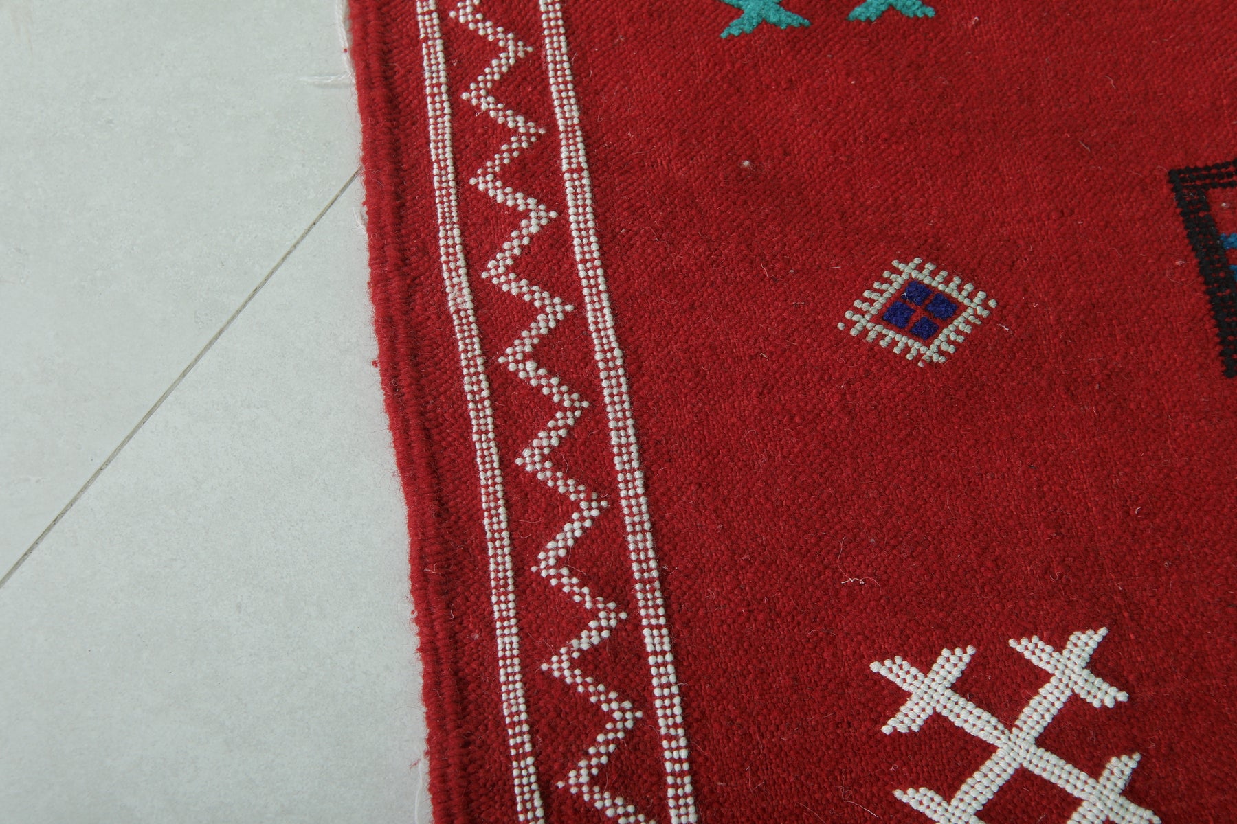 This 3.2 x 4.9 feet Red Handwoven Moroccan Kilim rug features a deep red base with bold Berber motifs in vibrant contrasting colors. Compact yet eye-catching, it's ideal for small living rooms, bedrooms, or entryways, bringing cultural flair and warmth to any space.