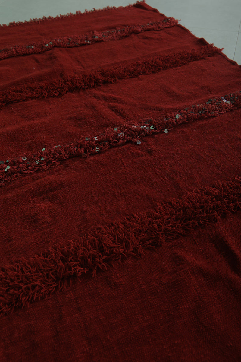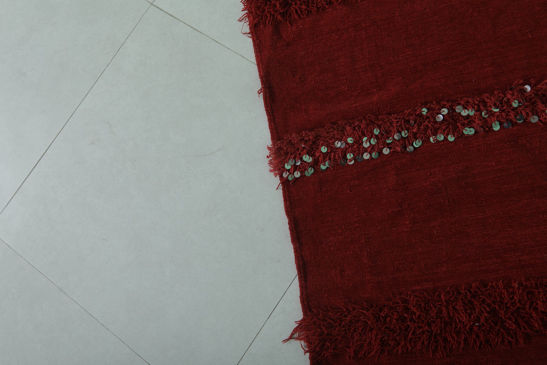 Enhance your space with this Red Moroccan Kilim Rug (3.6 x 6.3 FT), a minimalist yet powerful piece featuring rich crimson tones and subtle texture variations woven into a flat, artisanal design.