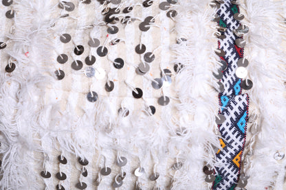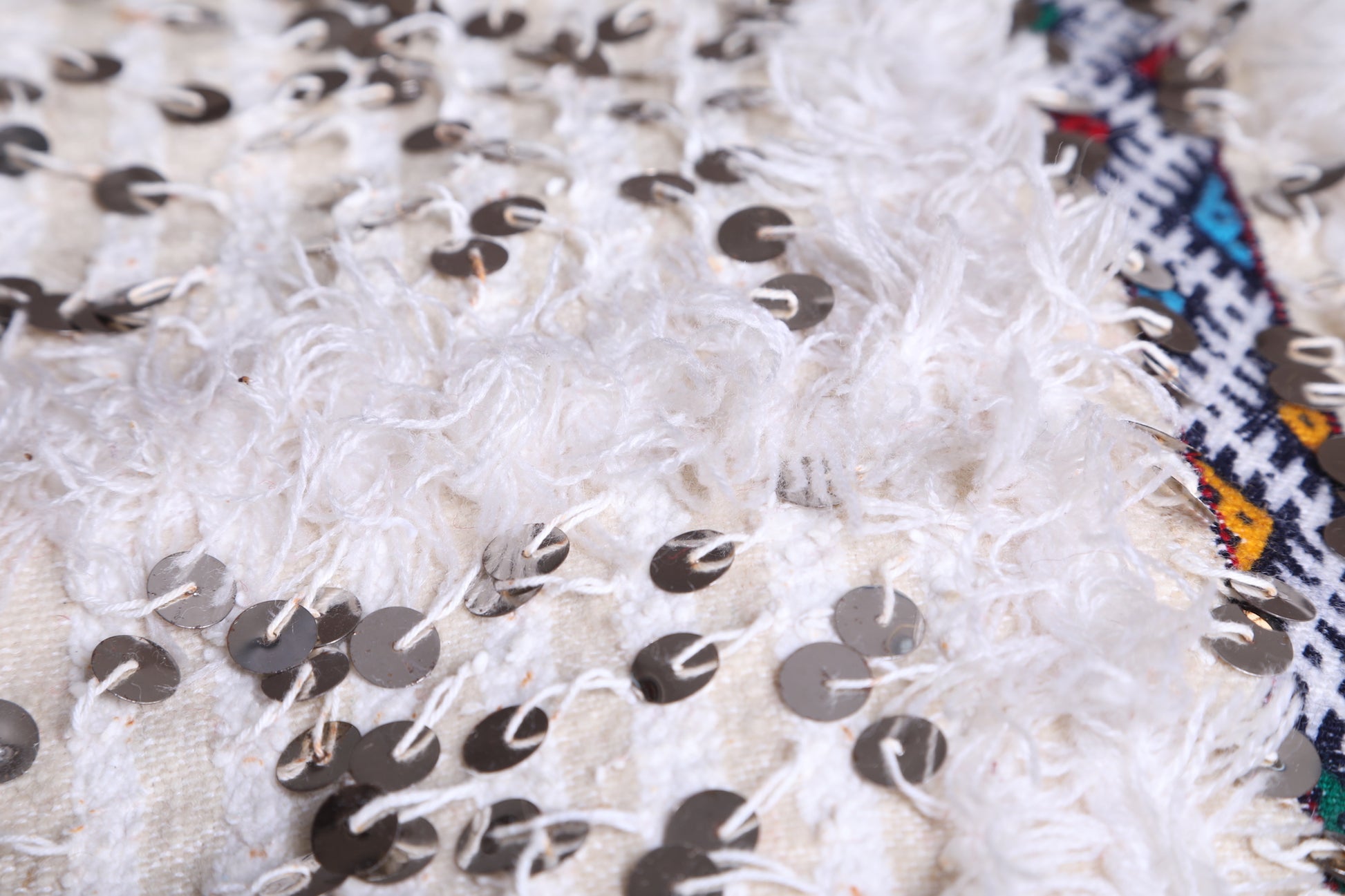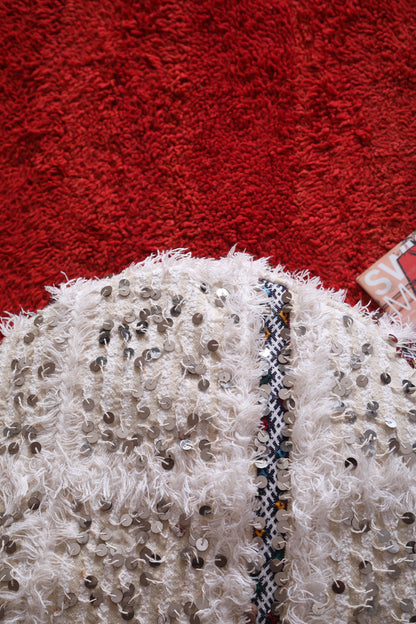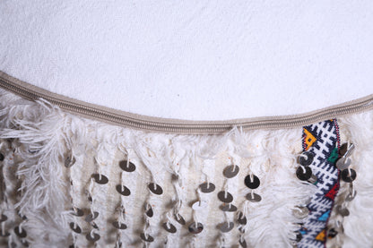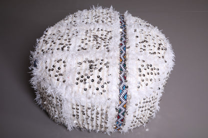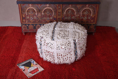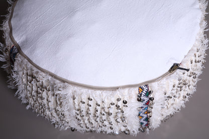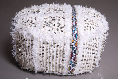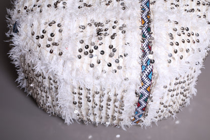 Add a touch of Moroccan magic to your interior with this round handwoven kilim pouf, crafted from an authentic vintage Handira wedding blanket. Densely decorated with silver sequins and intricate textures, this pouf makes a bold statement while offering cozy functionality. Its rounded shape softens any space and works beautifully as a stylish seat, a boho footrest, or a statement accent.