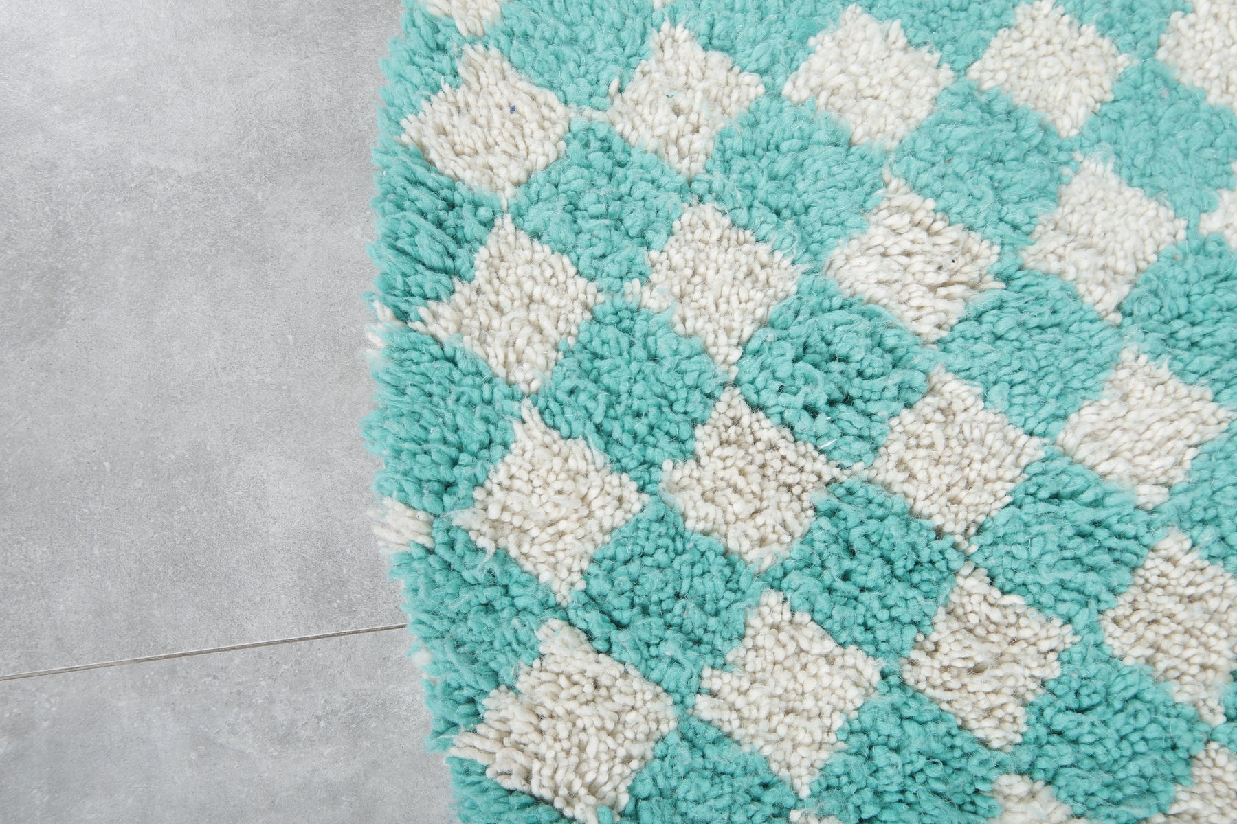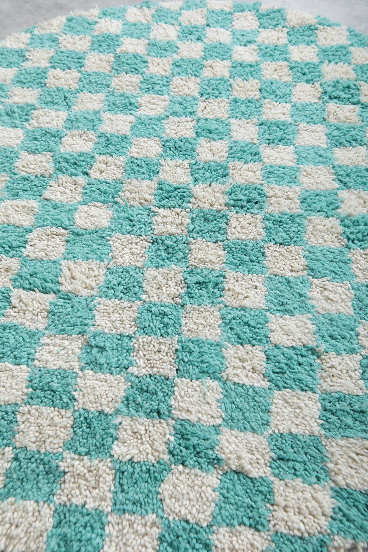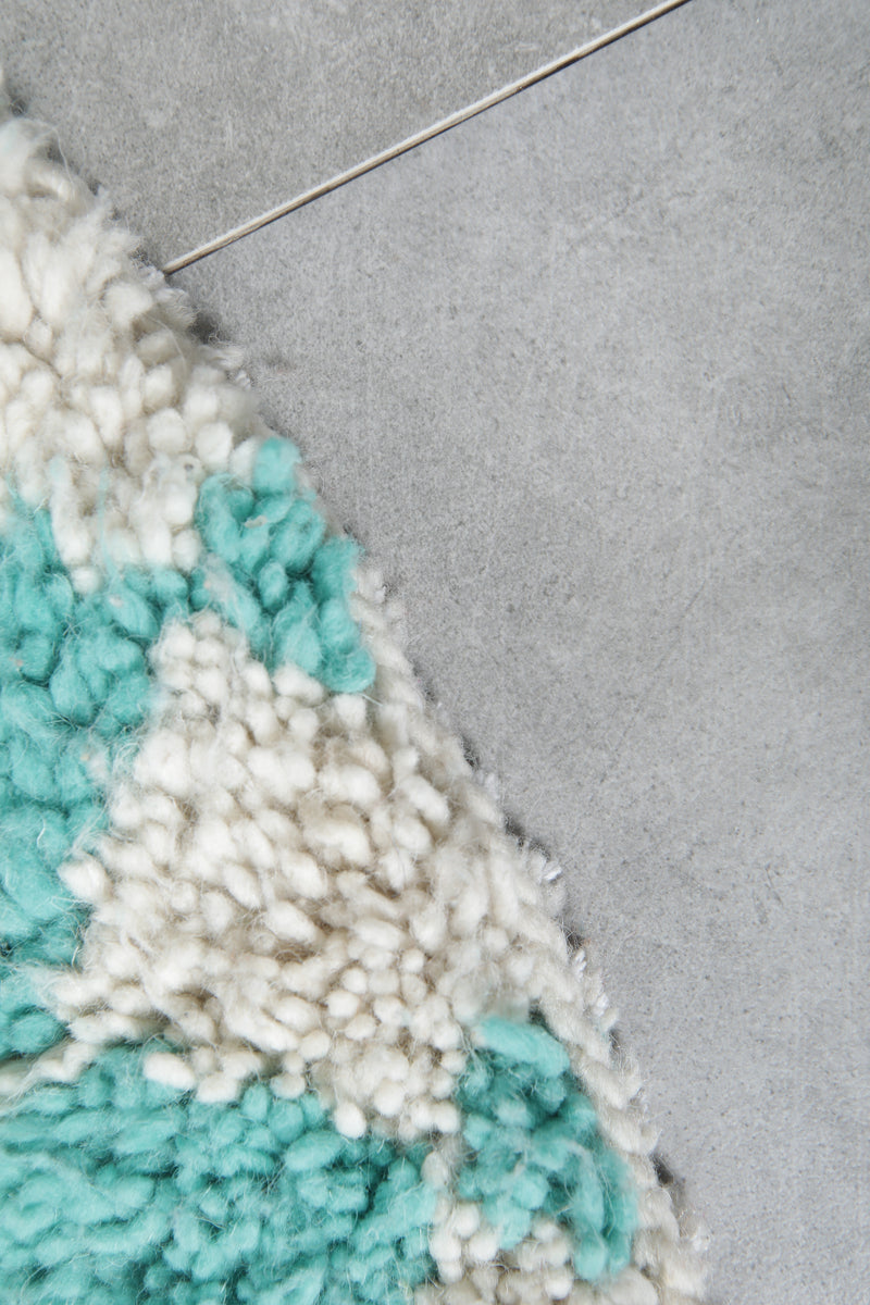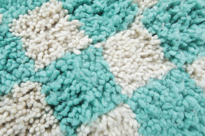 This Moroccan Round Checkered Rug adds a refreshing pop of color with its aqua green and white pattern. A bold, playful accent ideal for small spaces needing a splash of charm.