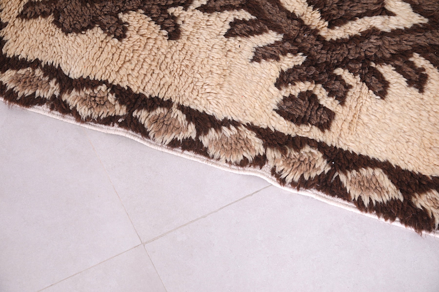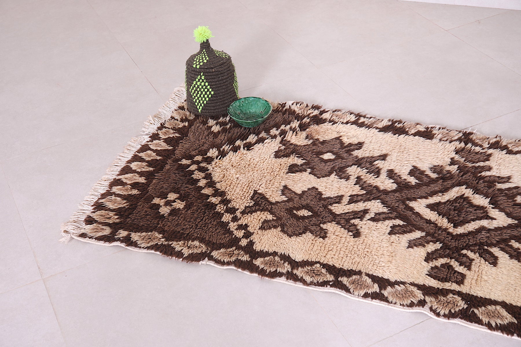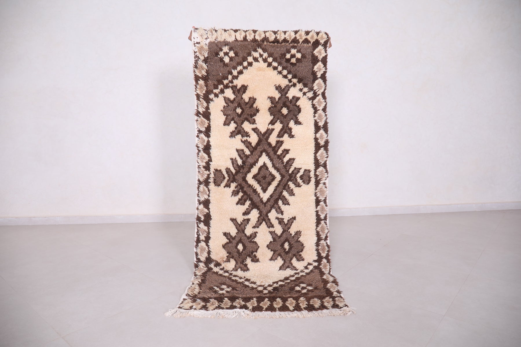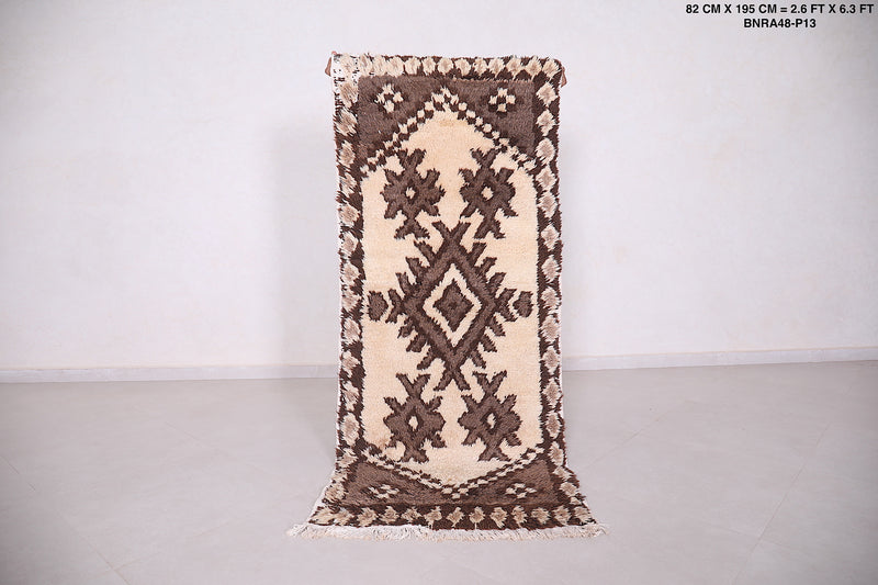 Bring warmth and tradition to your space with this Runner Moroccan Rug in Beige, sized at 2.6 x 6.3 feet. Handwoven in Morocco, this rug features a neutral cream base highlighted by bold tribal motifs in rich brown tones. Its cozy texture and timeless design make it an excellent addition to hallways, entryways, or beside a bed.