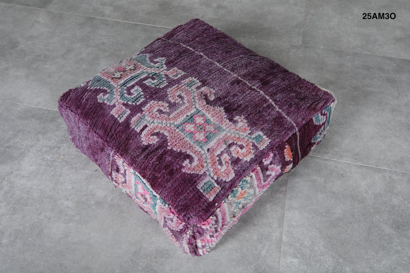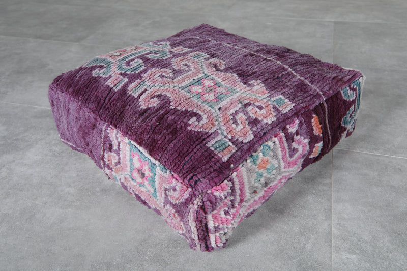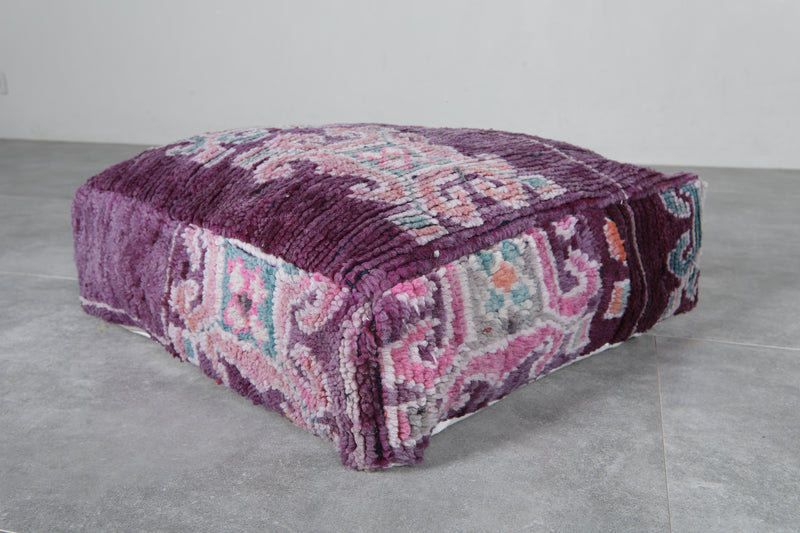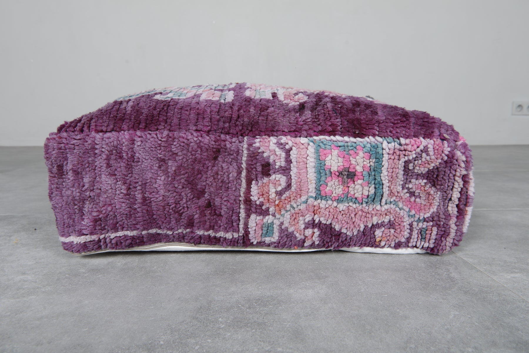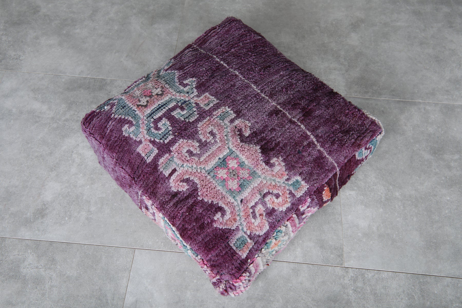 Elevate your space with this stunning Moroccan wool pouf in rich plum tones. The intricate Berber motifs, woven in soft pink, muted teal, and hints of ivory, create a captivating contrast against the deep purple base. This one-of-a-kind floor cushion blends tradition with modern elegance, offering a cozy seating option or a unique decorative accent. Whether placed in a bohemian, eclectic, or contemporary setting, its timeless design and plush texture bring warmth and authenticity to any interior.