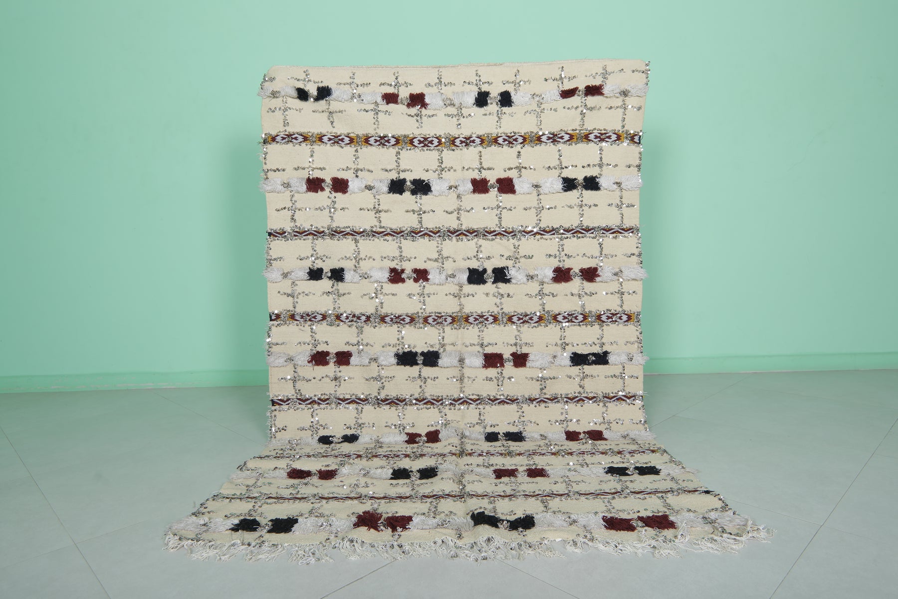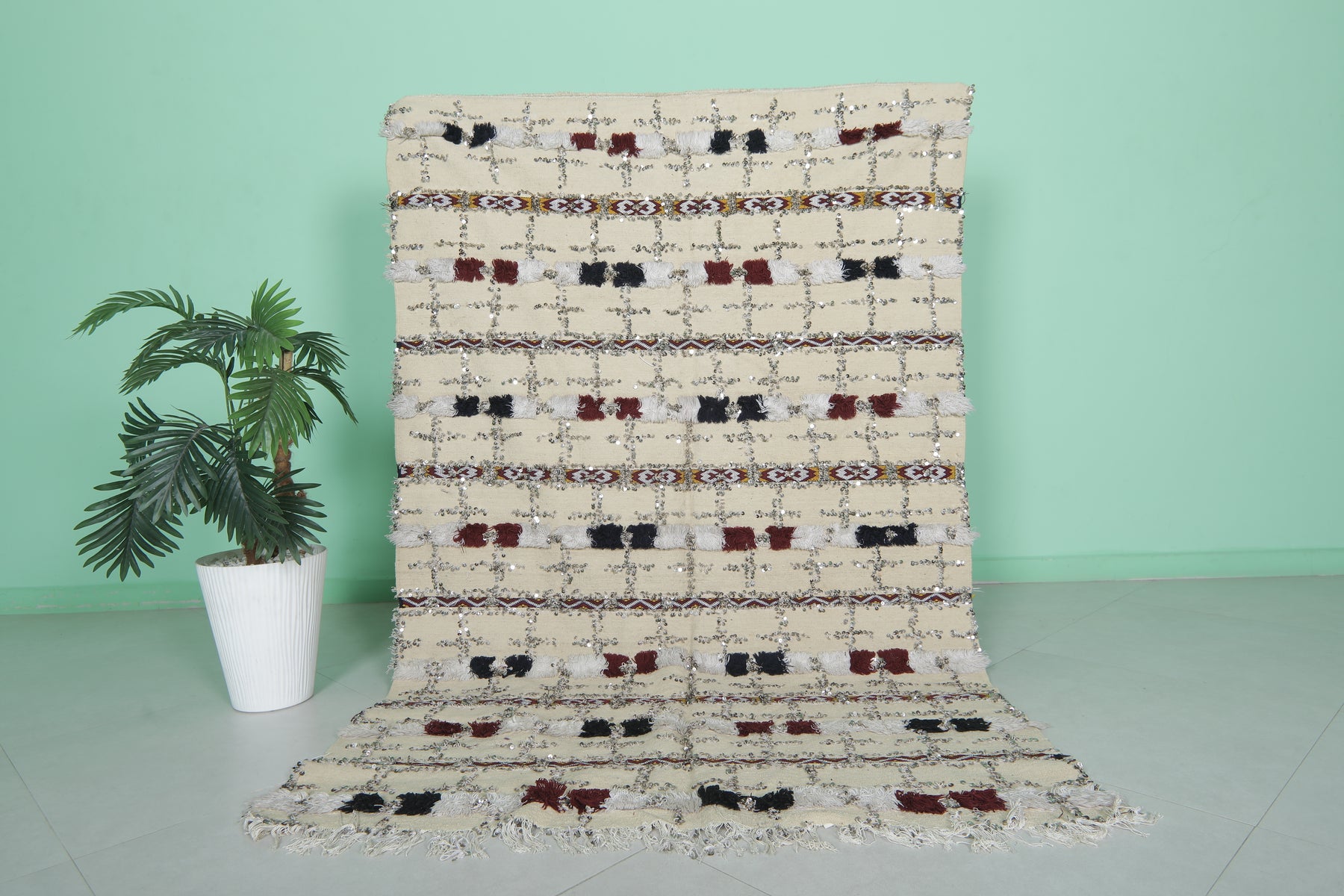 Add shimmer and heritage to your space with this Sequins Wedding Berber Blanket, measuring 4.2 FT x 6.4 FT. Handwoven in Morocco, this piece is perfect as a decorative throw, wall hanging, or statement rug.