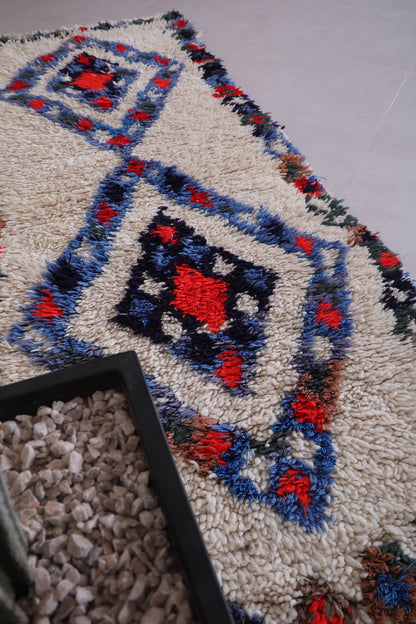Elevate your space with this bold and luxurious Shaggy Moroccan Runner Rug, sized at 2.9 x 7.7 feet. Handmade in Morocco, this statement rug features striking diamond medallions in red, blue, and black on a soft ivory backdrop. The high-pile shag texture delivers exceptional comfort underfoot, while the symmetrical tribal design adds structure and visual interest. Perfect for long hallways, spacious entryways, or as a standout piece in open-plan interiors, this rug brings a vibrant touch of Moroccan artistry to any setting.