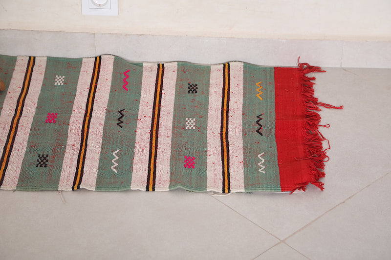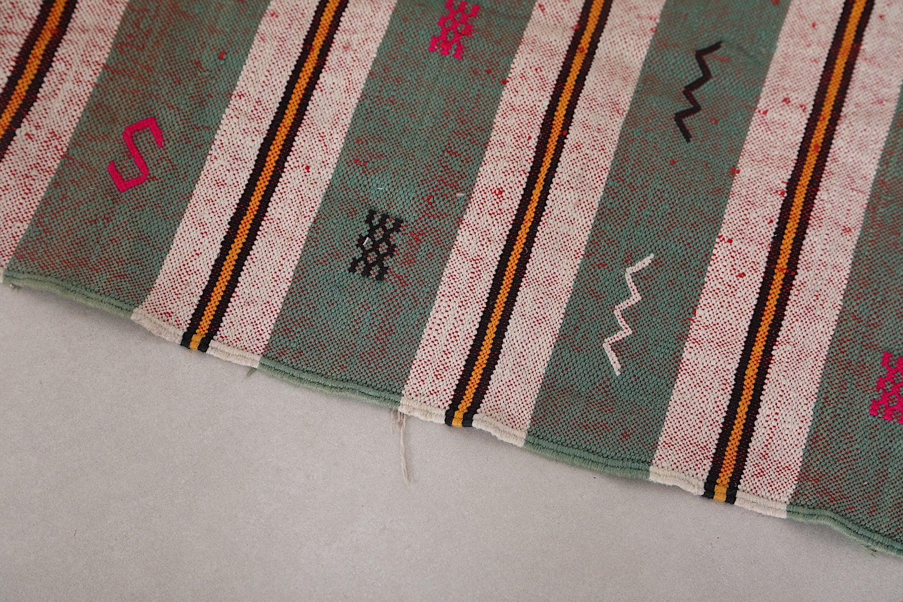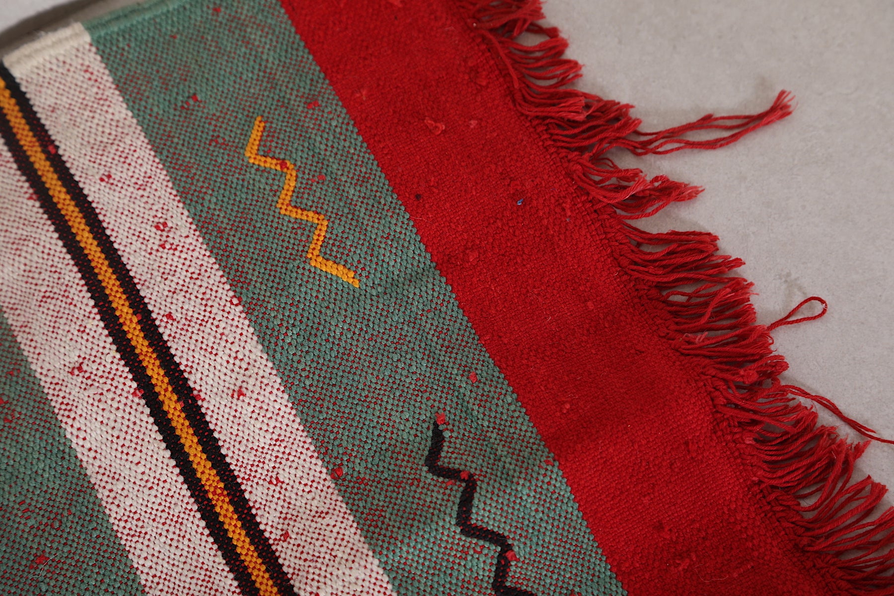 This 1.7 x 3.2 feet Moroccan rug is a vibrant and playful addition to any space. Handwoven with intricate detail, it features bold green, white, and red hues accented by embroidered geometric symbols in pink, yellow, and black. Its compact size makes it ideal for entryways, bedside areas, or as a decorative statement piece. The handcrafted design brings warmth, personality, and a unique artistic touch to your home.