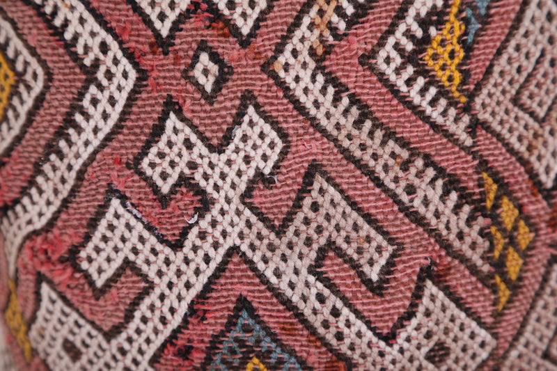 Crafted from vintage wool and cotton textiles, the pillow features earthy tones of red, cream, and soft pink woven into intricate geometric and tribal patterns, capturing the essence of authentic Berber craftsmanship. Each pillow is unique, ensuring your decor includes a one-of-a-kind treasure.