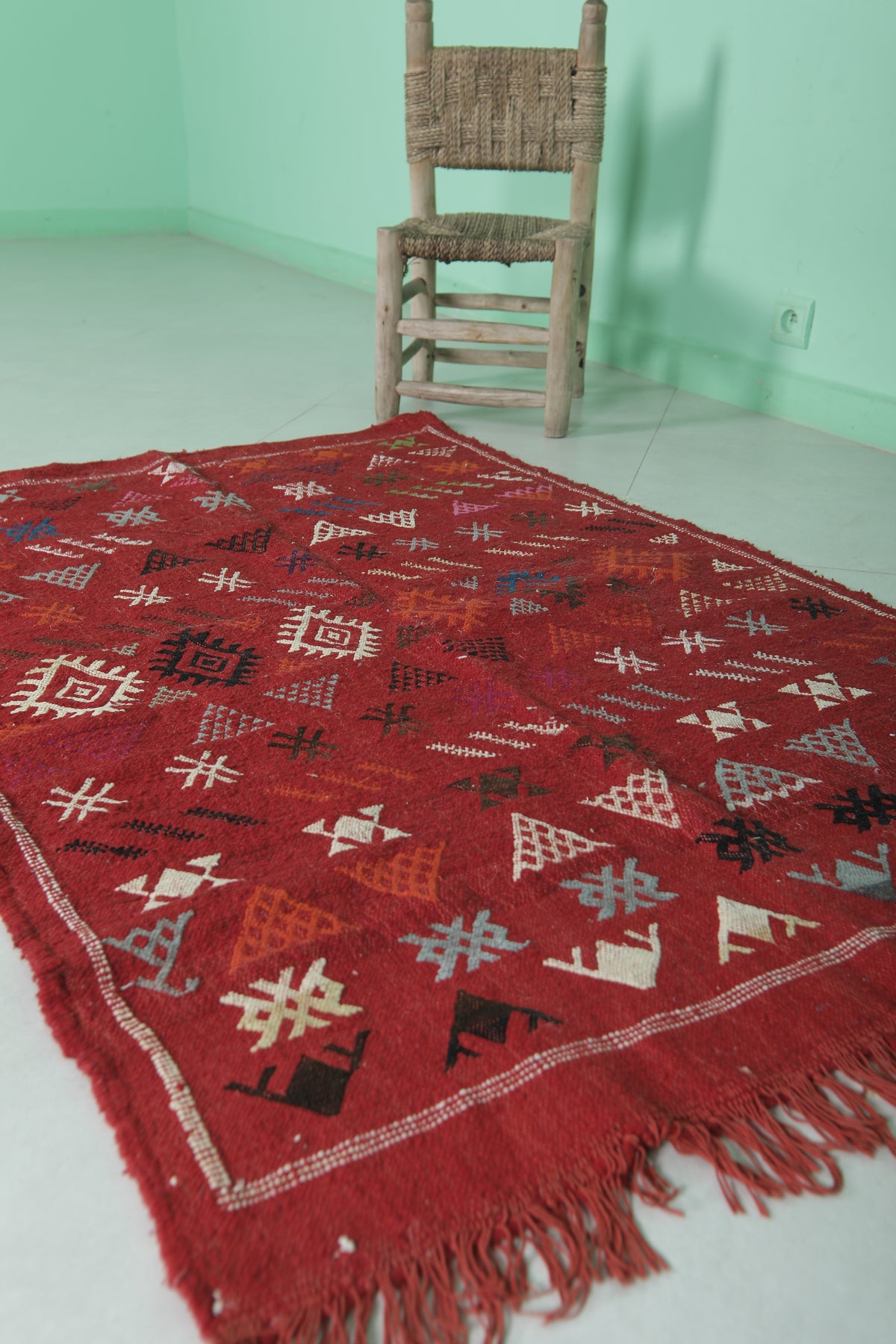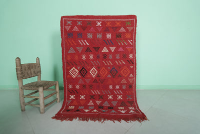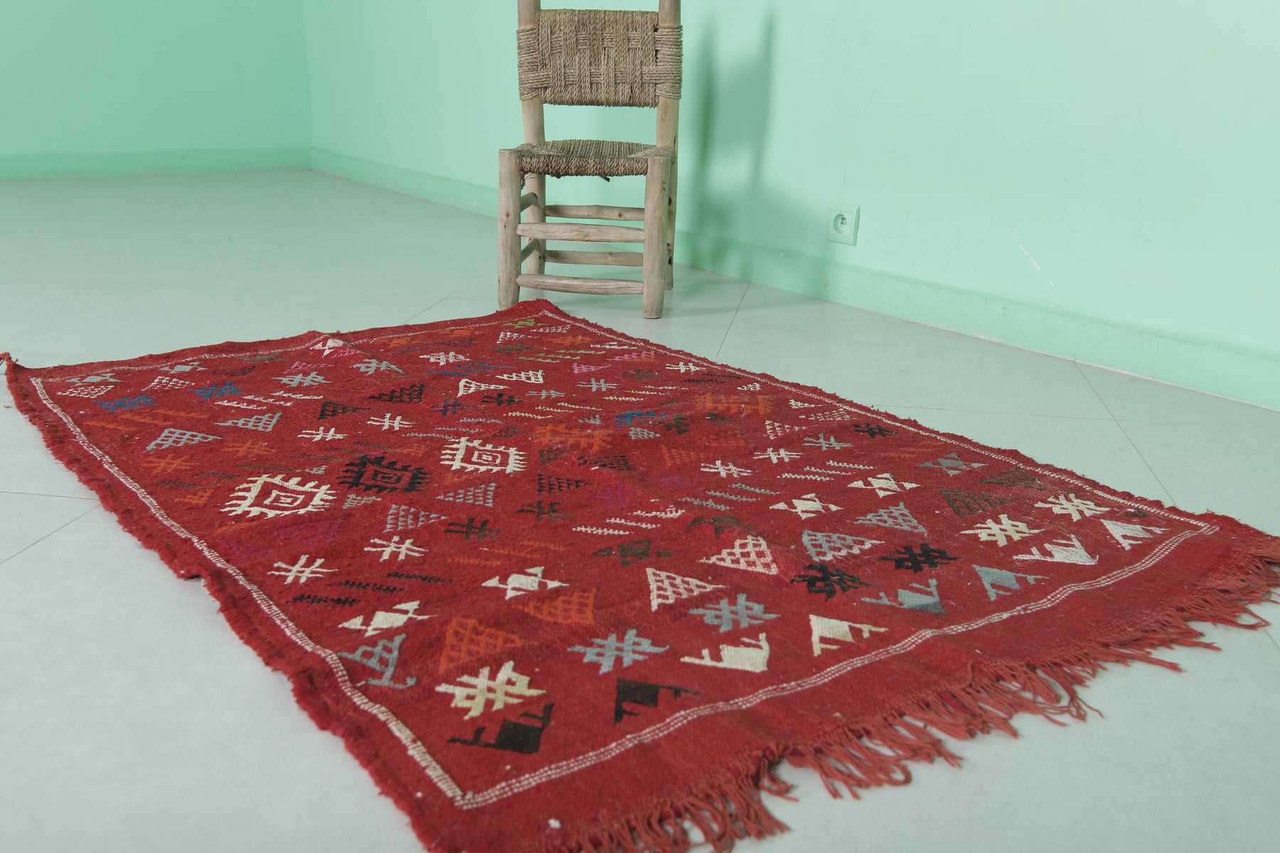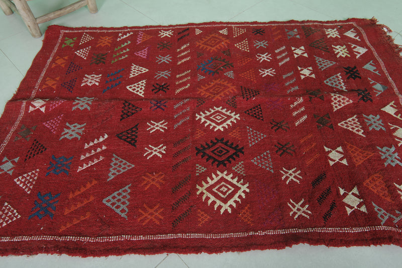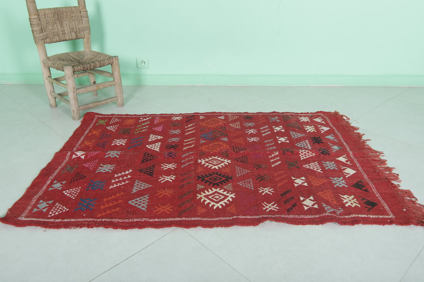 Small Red Moroccan Rug - 3.2 FT × 4.7 FT | Handwoven Kilim