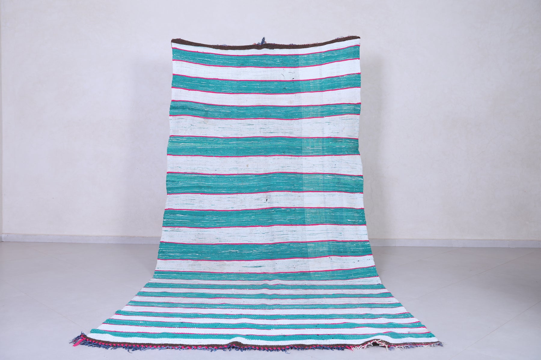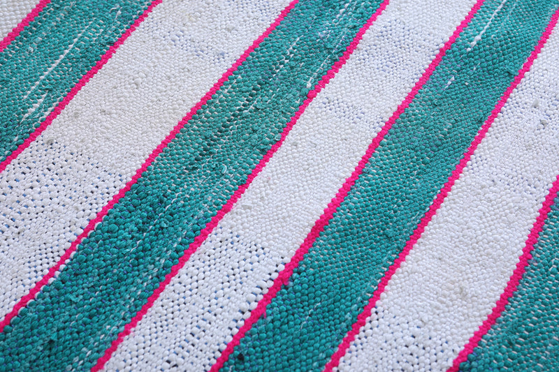 Make a bold and breezy statement with this Striped Moroccan Kilim Rug (5.4 x 11.1 FT), featuring alternating bands of turquoise, lavender, and ivory for a clean, coastal vibe.