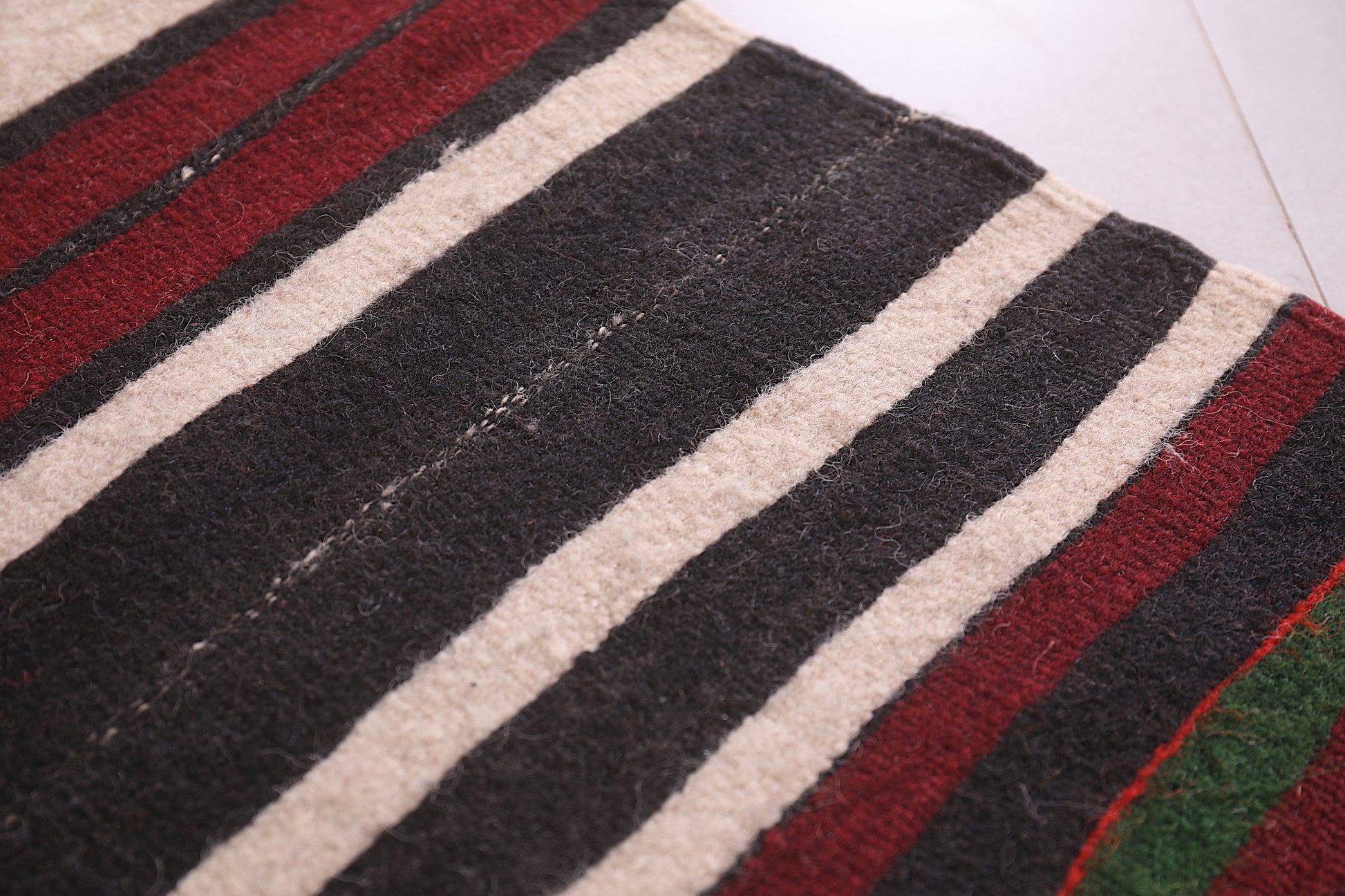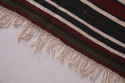 This 3.5 x 5.2 feet Moroccan striped rug features a sophisticated blend of bold black, deep red, and cream stripes, creating a timeless and elegant design. Handwoven with care, this rug is versatile and stylish, making it an ideal addition to modern, rustic, or bohemian interiors. Its classic pattern adds warmth and character to any space.