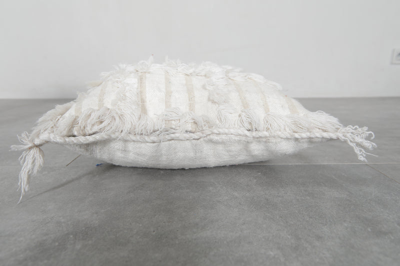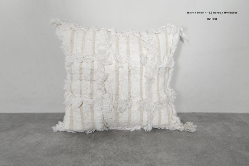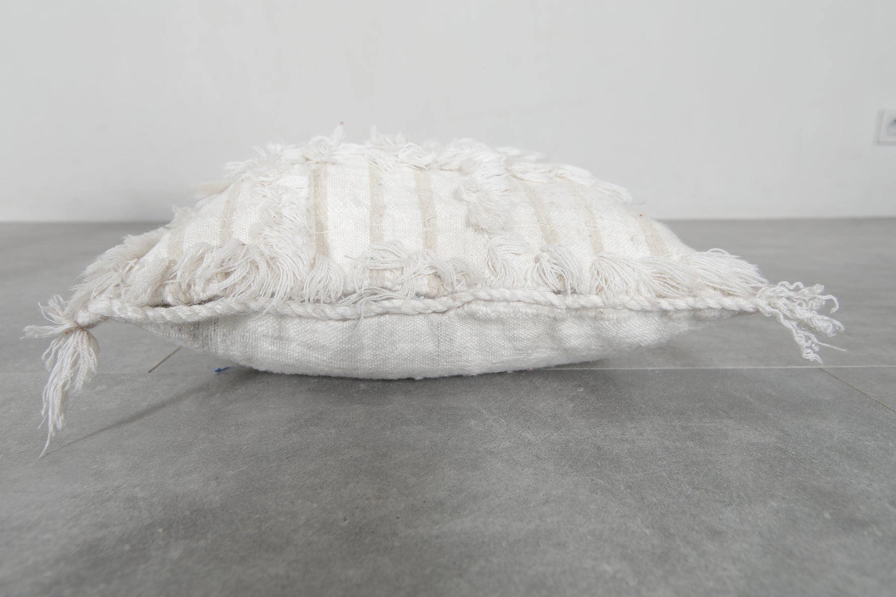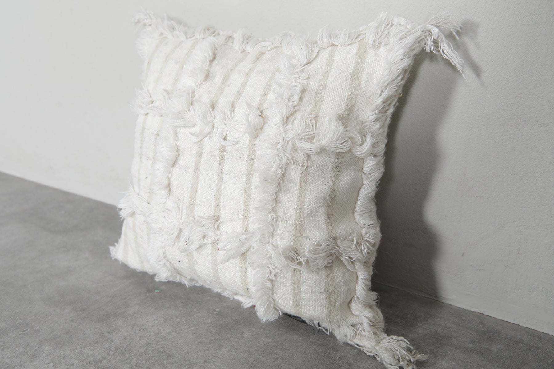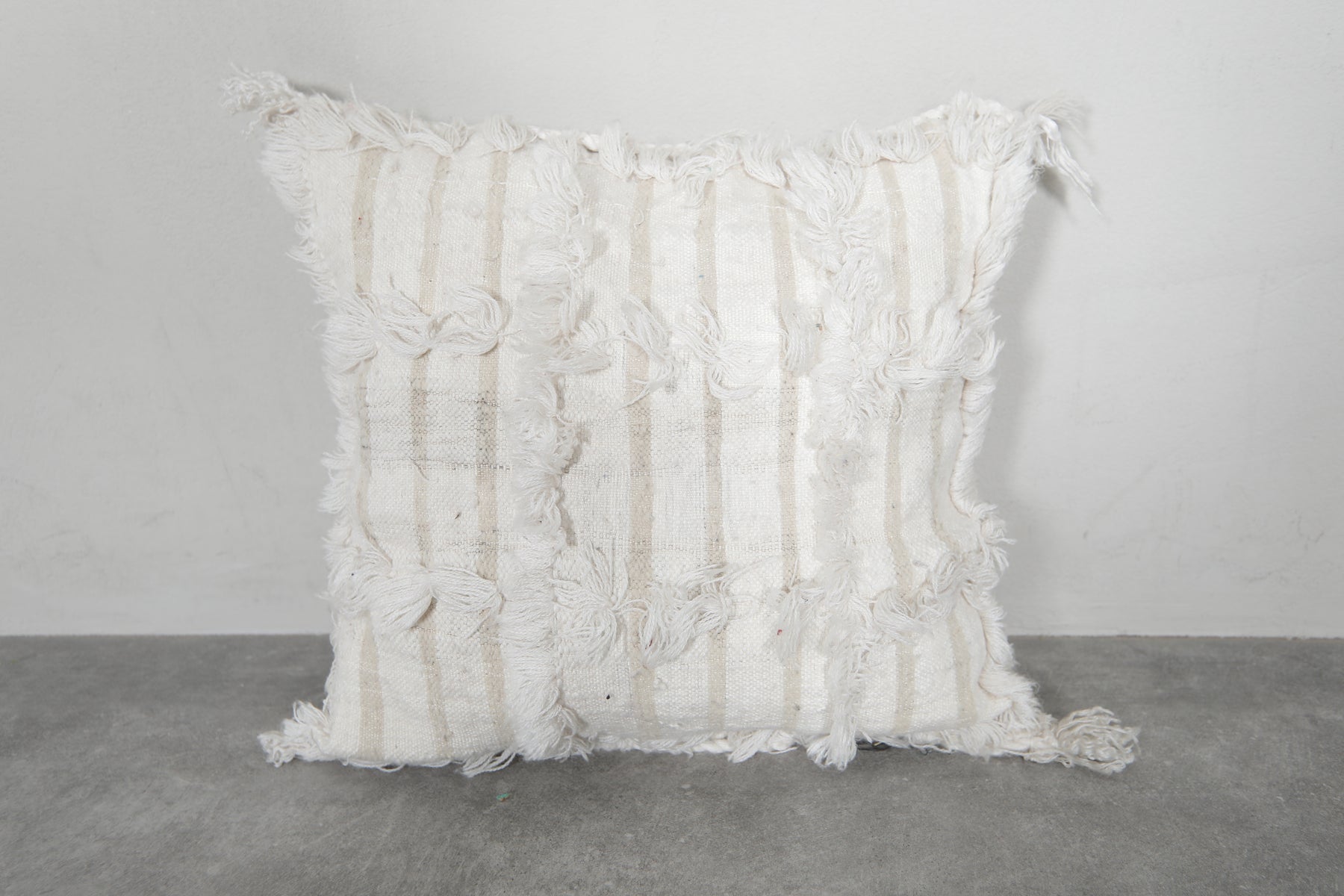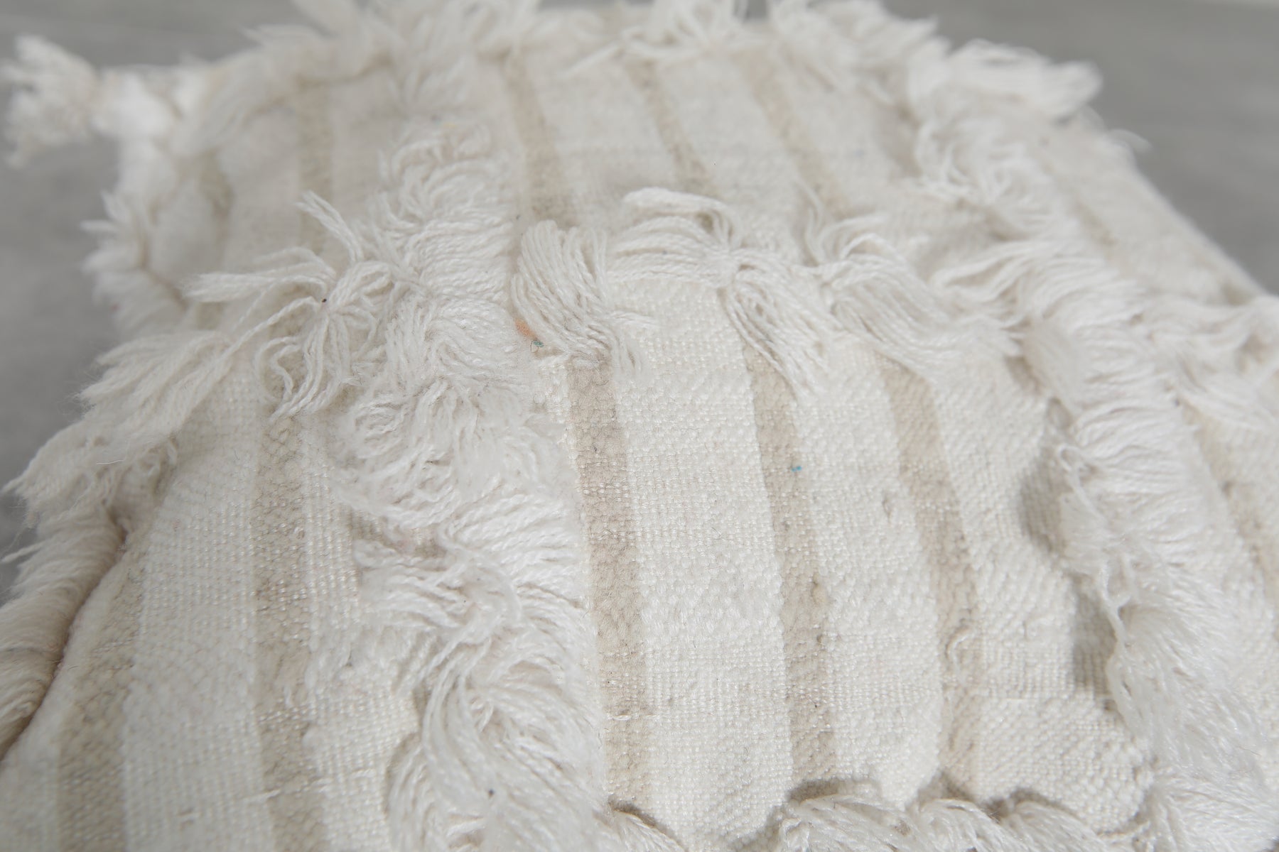 Enhance your space with this handwoven Moroccan pillow featuring soft cream tones and delicate striped patterns. Accented with textured fringes, it adds a cozy, bohemian vibe to any room. Perfect for sofas, chairs, or beds, this versatile piece combines comfort and style. Dimensions: 18.8 x 19.6 inches.