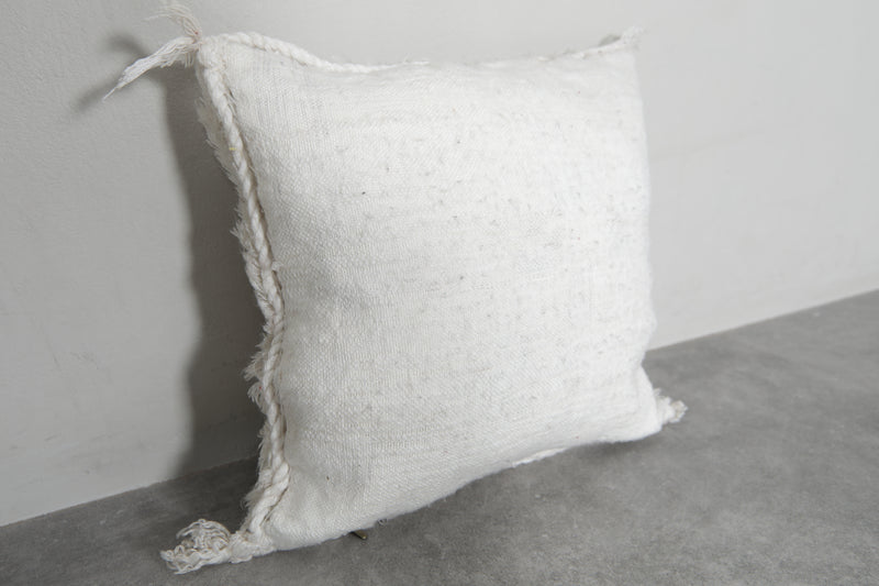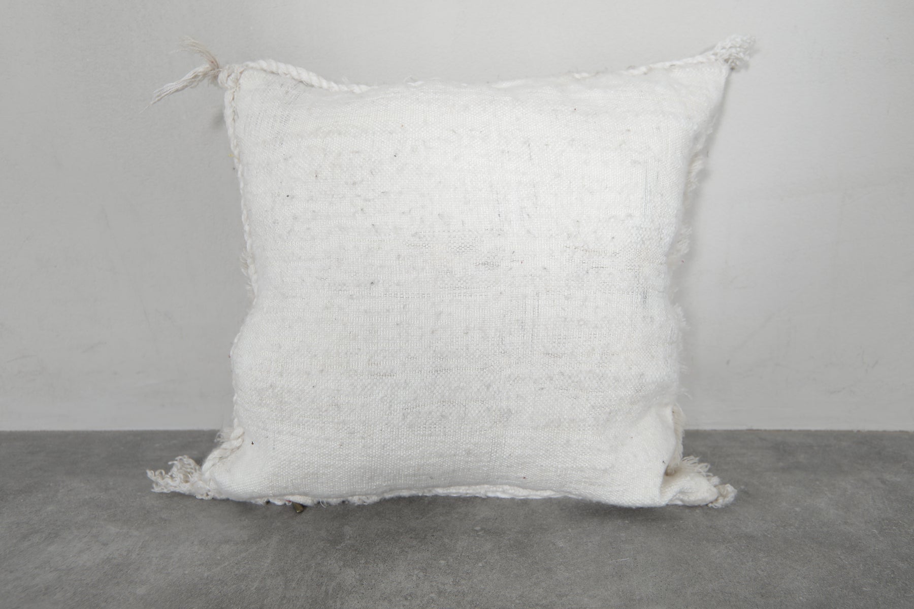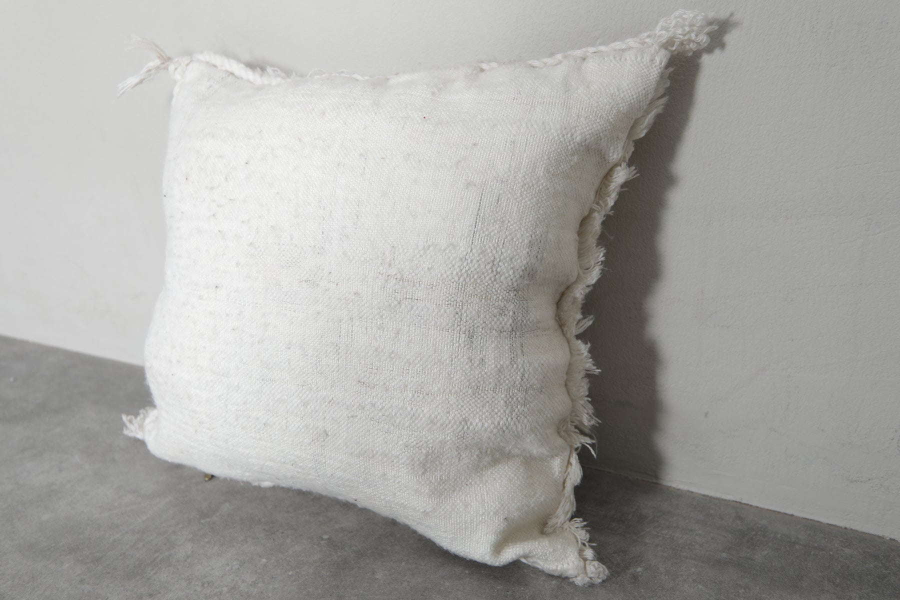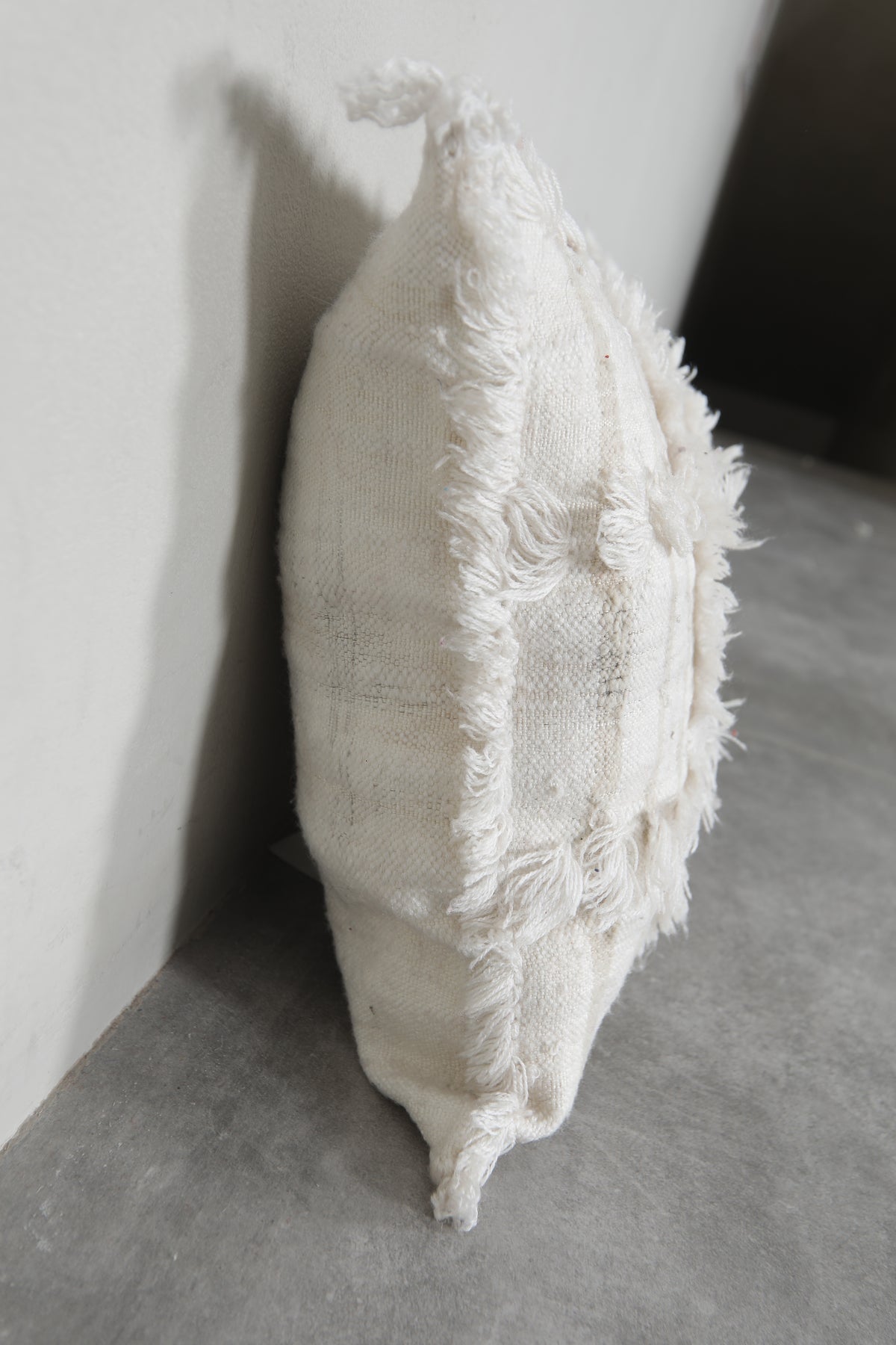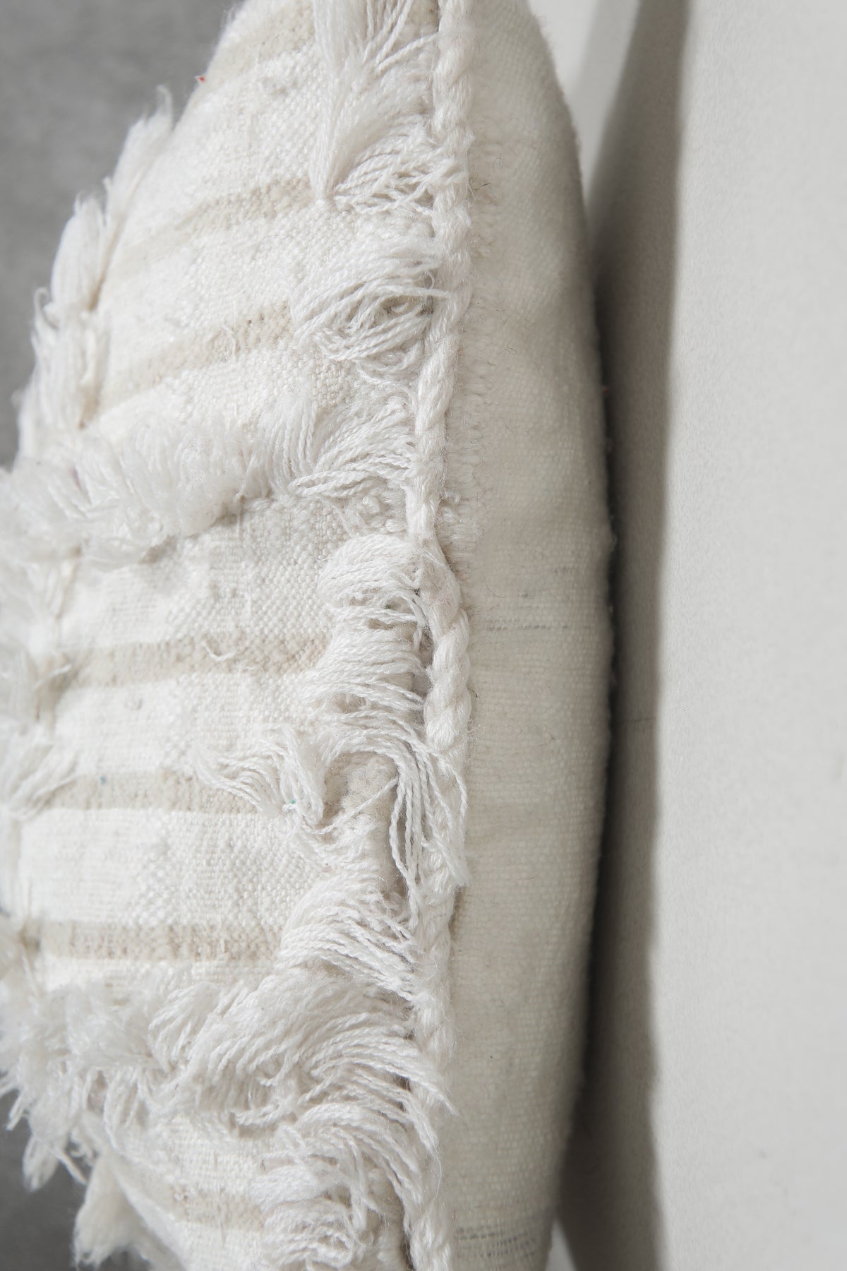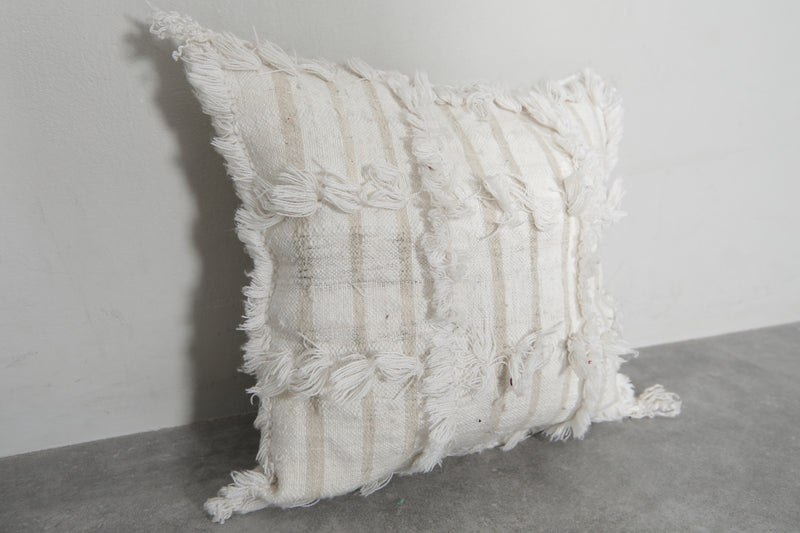 Enhance your space with this handwoven Moroccan pillow featuring soft cream tones and delicate striped patterns. Accented with textured fringes, it adds a cozy, bohemian vibe to any room. Perfect for sofas, chairs, or beds, this versatile piece combines comfort and style. Dimensions: 18.8 x 19.6 inches.