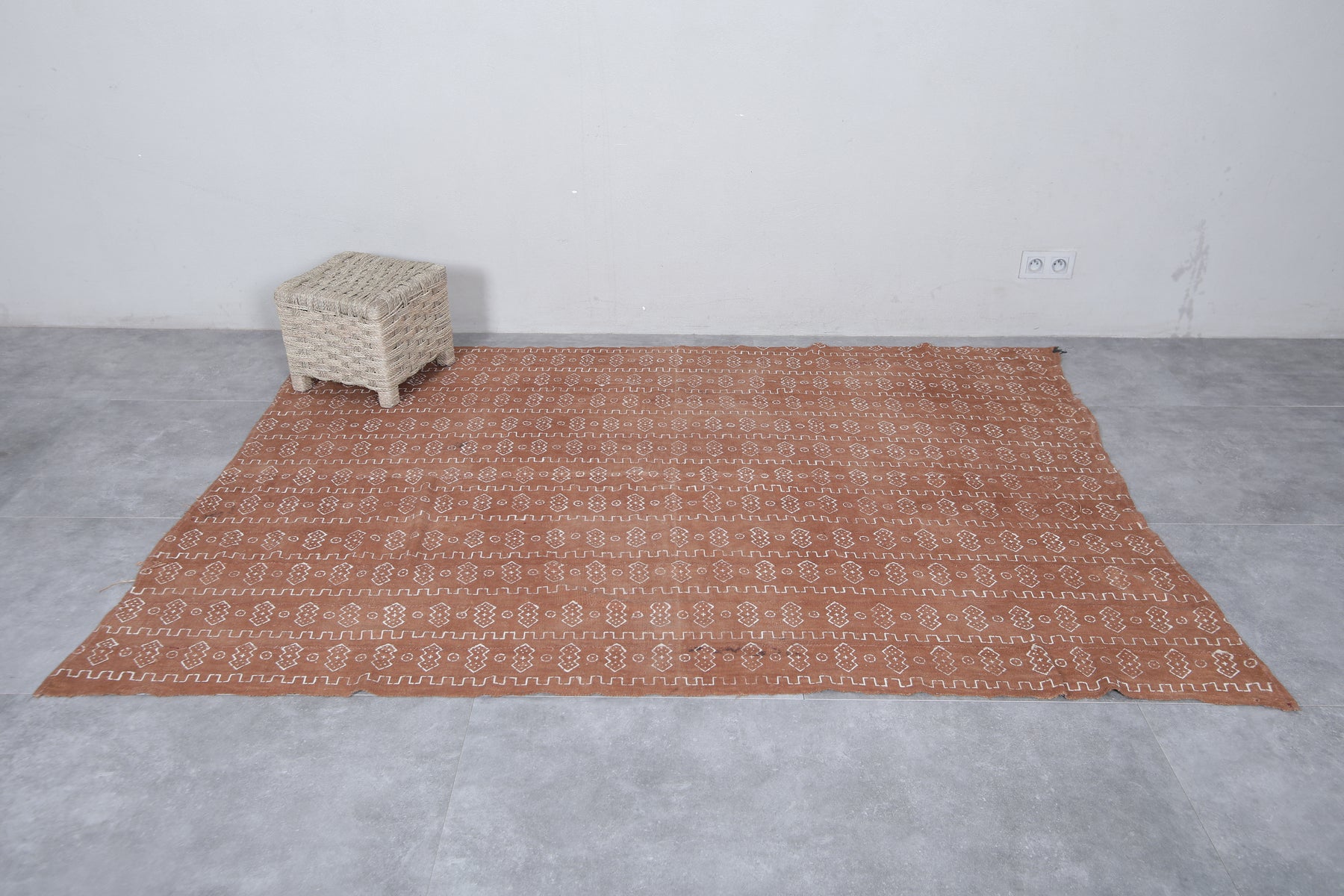 This 5 x 7.2 feet Traditional Handwoven Kilim Rug features warm earthy tones and intricate geometric motifs in rich brown and white hues. Designed to bring timeless elegance and cultural depth, this artisan-crafted rug is perfect for modern and traditional interiors alike.