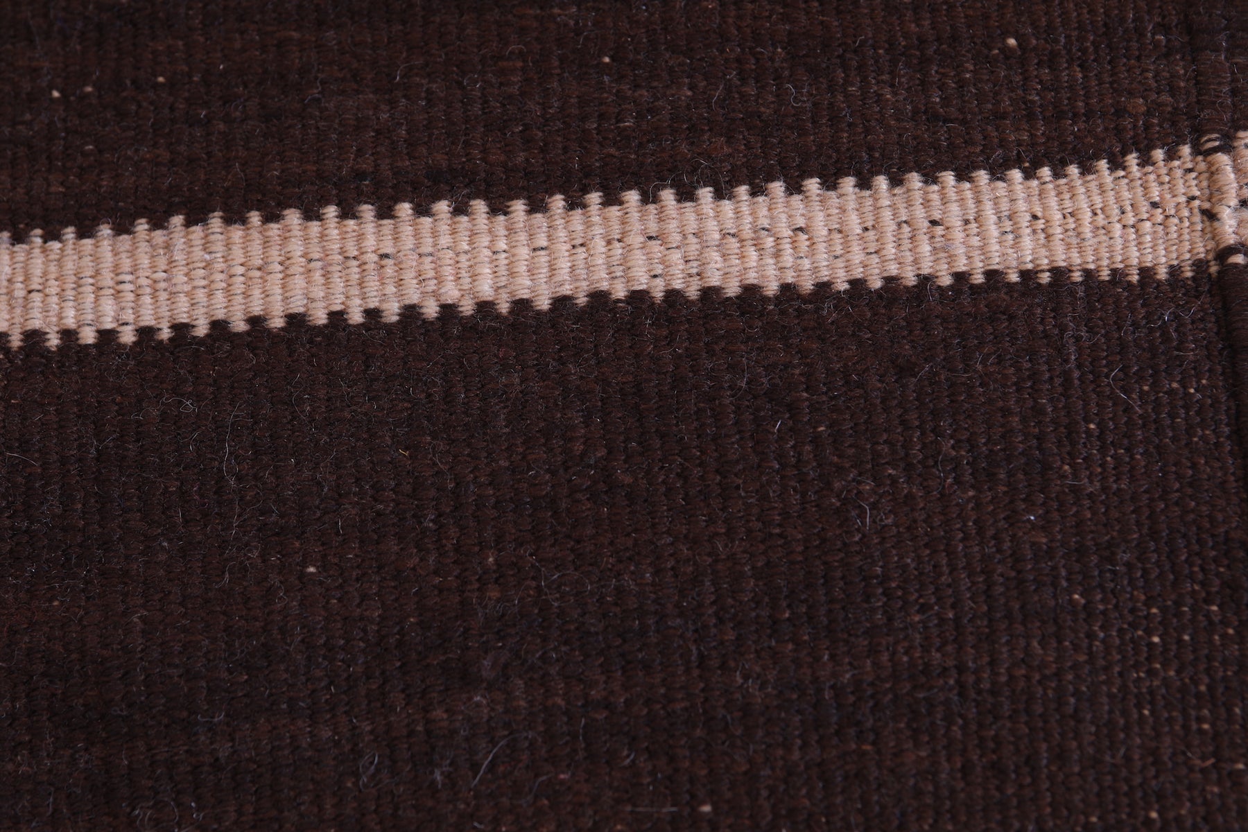 This 3.7 x 6.7 feet traditional Moroccan Berber Kilim rug showcases a timeless striped design in rich brown tones with soft ivory accents. Handwoven with care, it’s a warm and understated piece that adds depth and heritage to living rooms, reading nooks, or minimalist interiors.