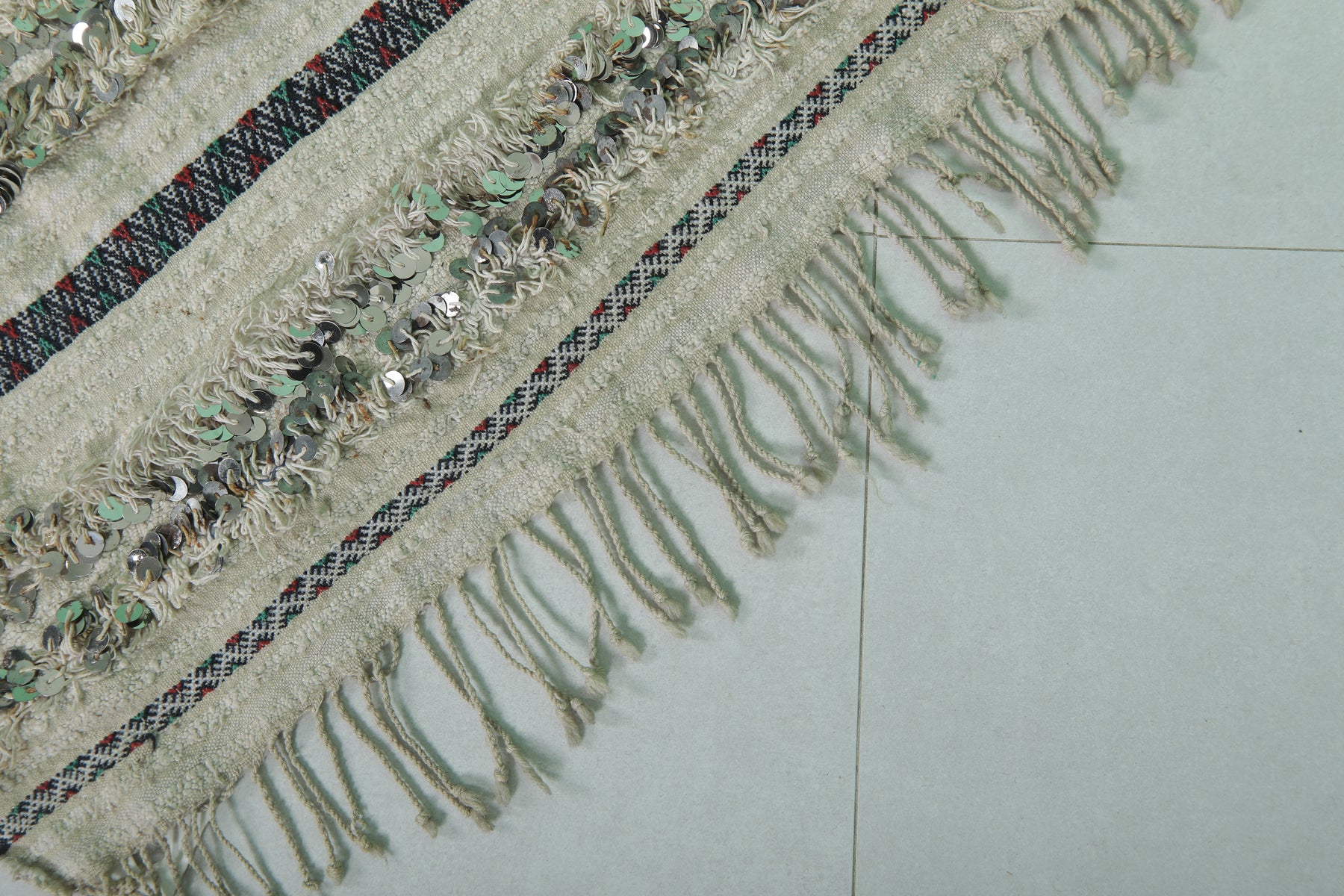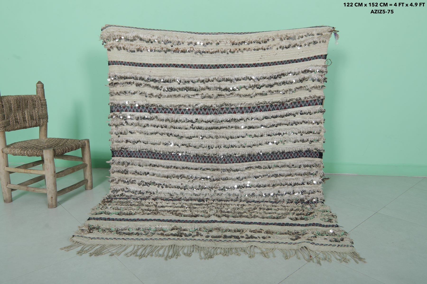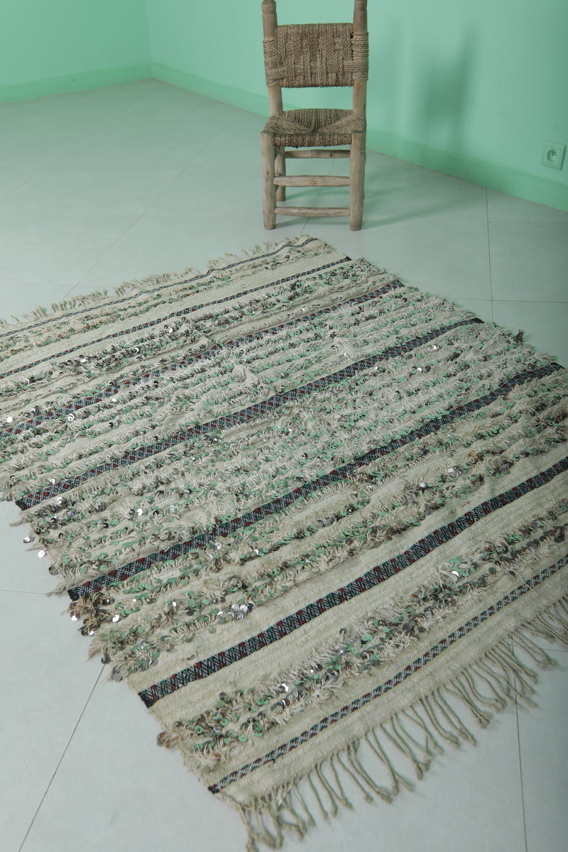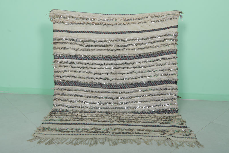 Add sparkle and heritage beauty with this Handwoven Tribal Berber Wedding Blanket. Measuring 4 FT x 4.9 FT, this Moroccan-made piece features shimmering sequins and detailed tribal motifs woven onto a soft neutral wool base. Whether draped over a bed, used as a throw, or hung as wall art, it brings glamour and tradition into any space.