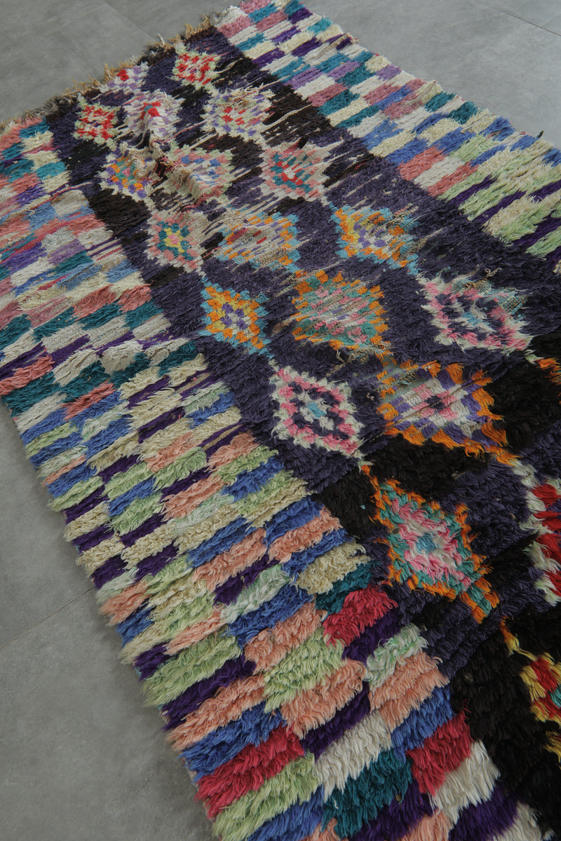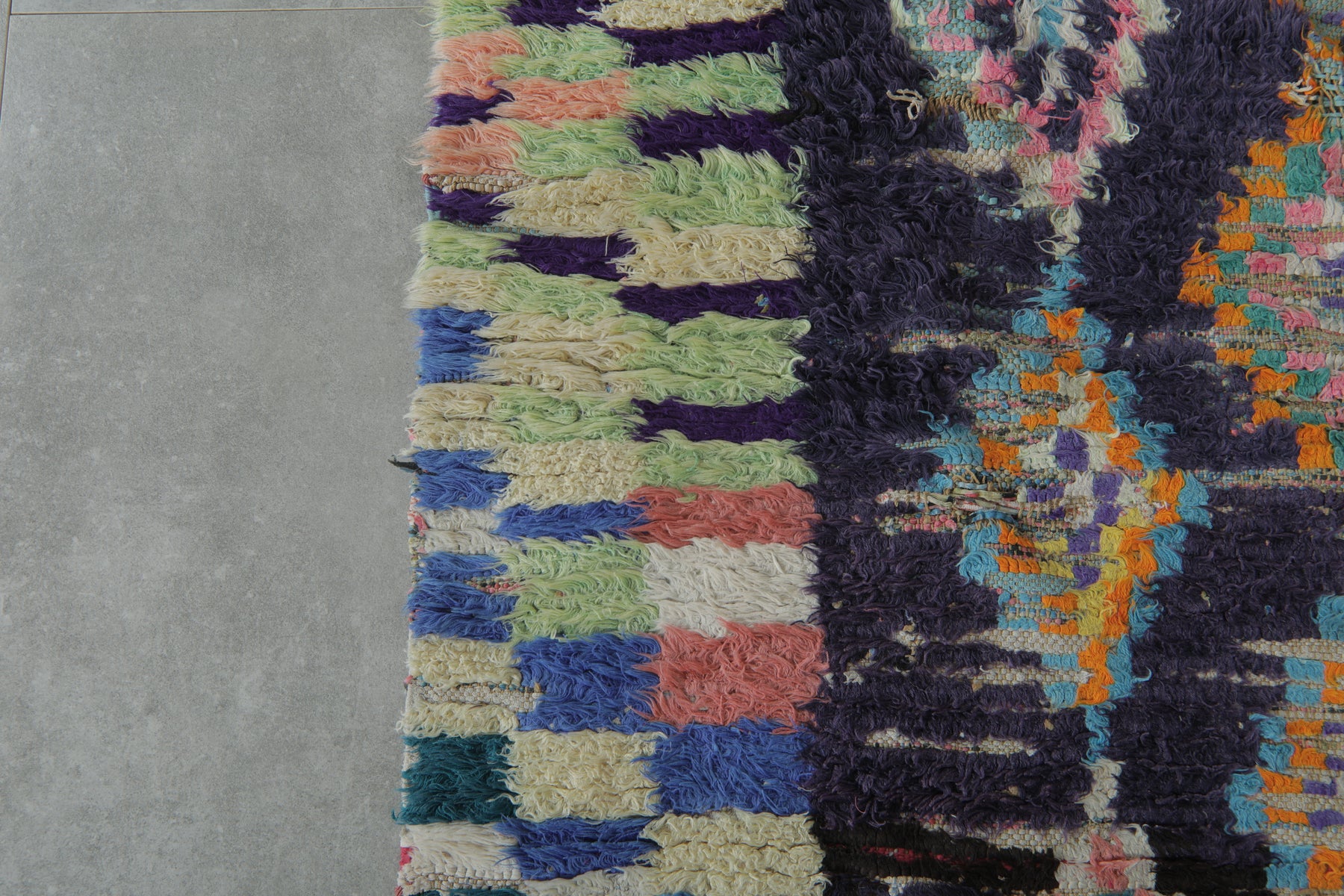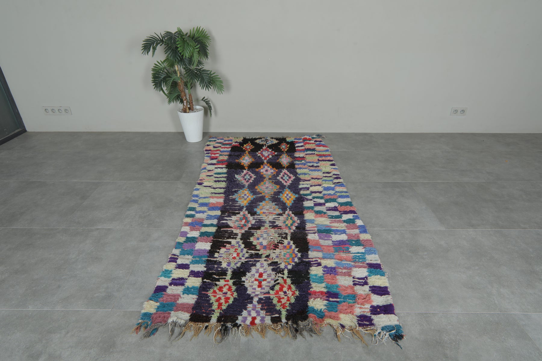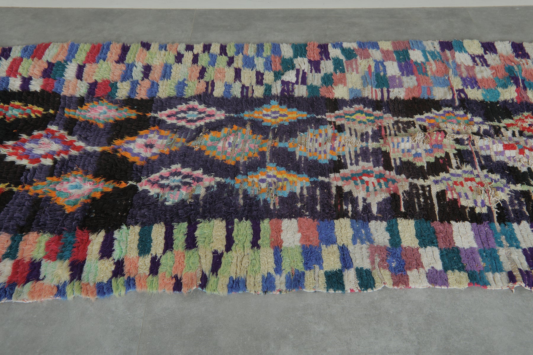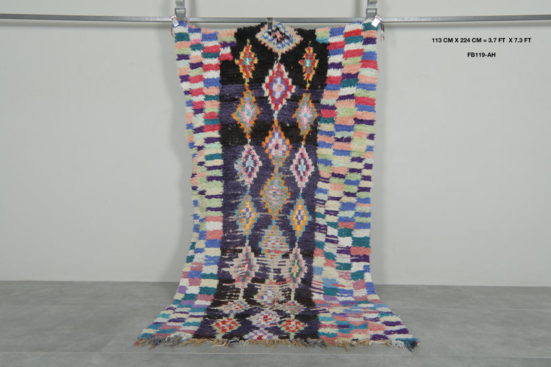 Bring bold tradition and vivid color to your home with this Moroccan Boucherouite rug, measuring 3.7 x 7.3 feet. Woven from recycled fabric scraps, it showcases a central line of diamond medallions on a deep violet-black ground, bursting in bright tones like saffron, fuchsia, turquoise, and lavender. The sides are filled with multicolor mosaic-style patchwork, creating a dynamic and energetic contrast. A piece that feels alive—perfect for hallway displays, creative lofts, or layered eclectic rooms.