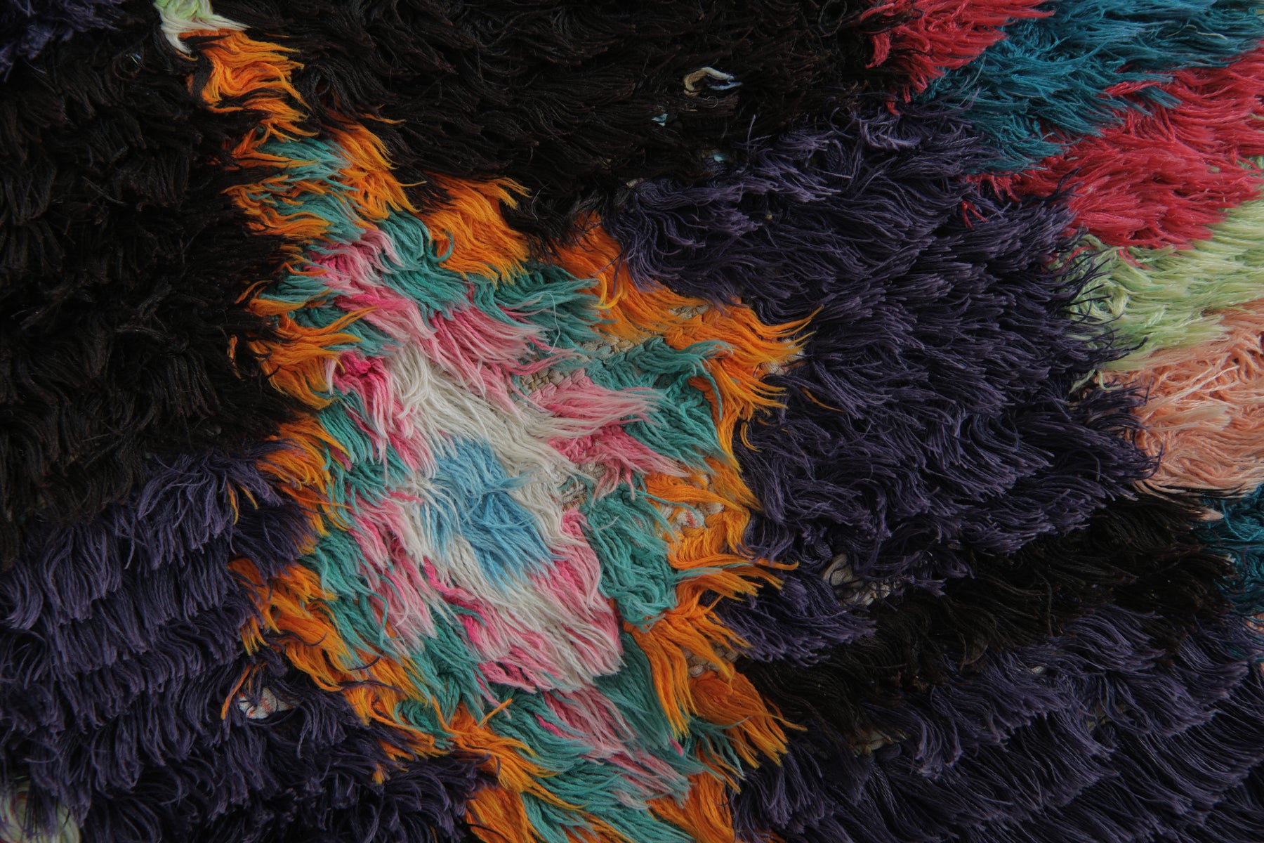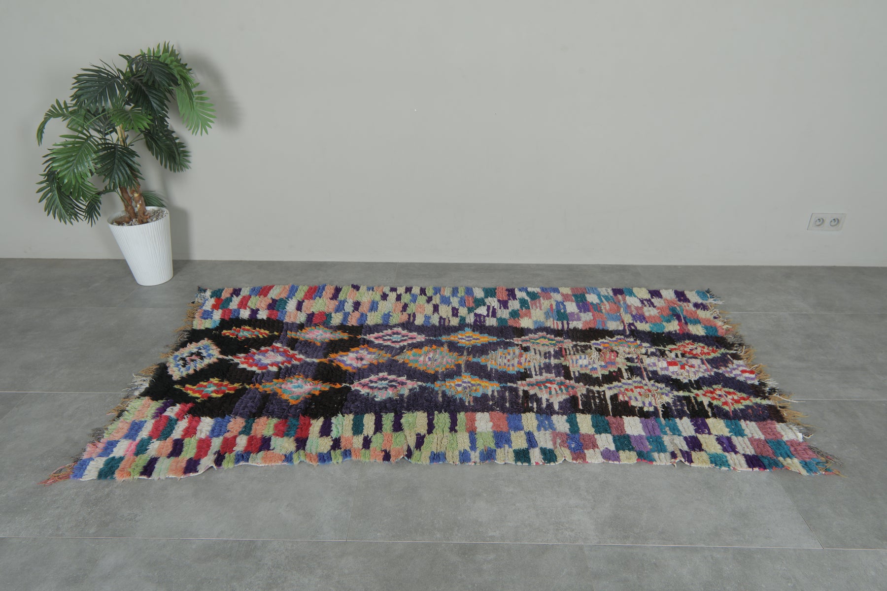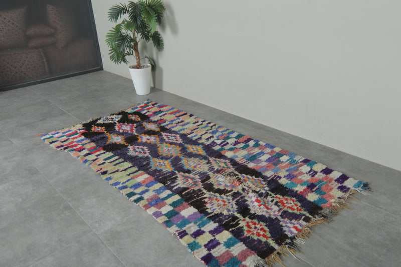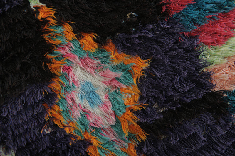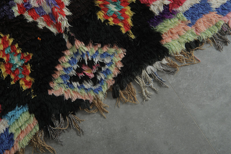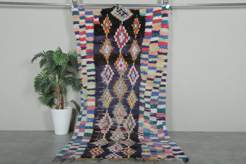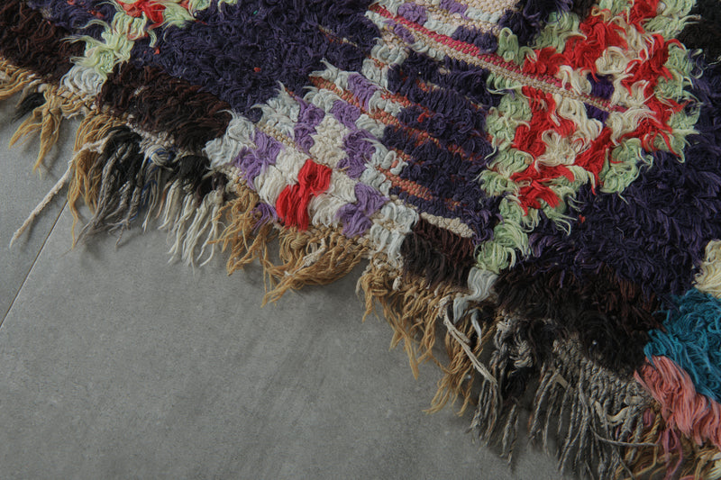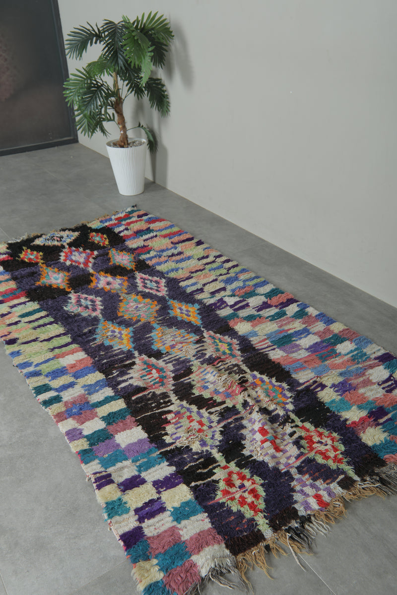 Bring bold tradition and vivid color to your home with this Moroccan Boucherouite rug, measuring 3.7 x 7.3 feet. Woven from recycled fabric scraps, it showcases a central line of diamond medallions on a deep violet-black ground, bursting in bright tones like saffron, fuchsia, turquoise, and lavender. The sides are filled with multicolor mosaic-style patchwork, creating a dynamic and energetic contrast. A piece that feels alive—perfect for hallway displays, creative lofts, or layered eclectic rooms.