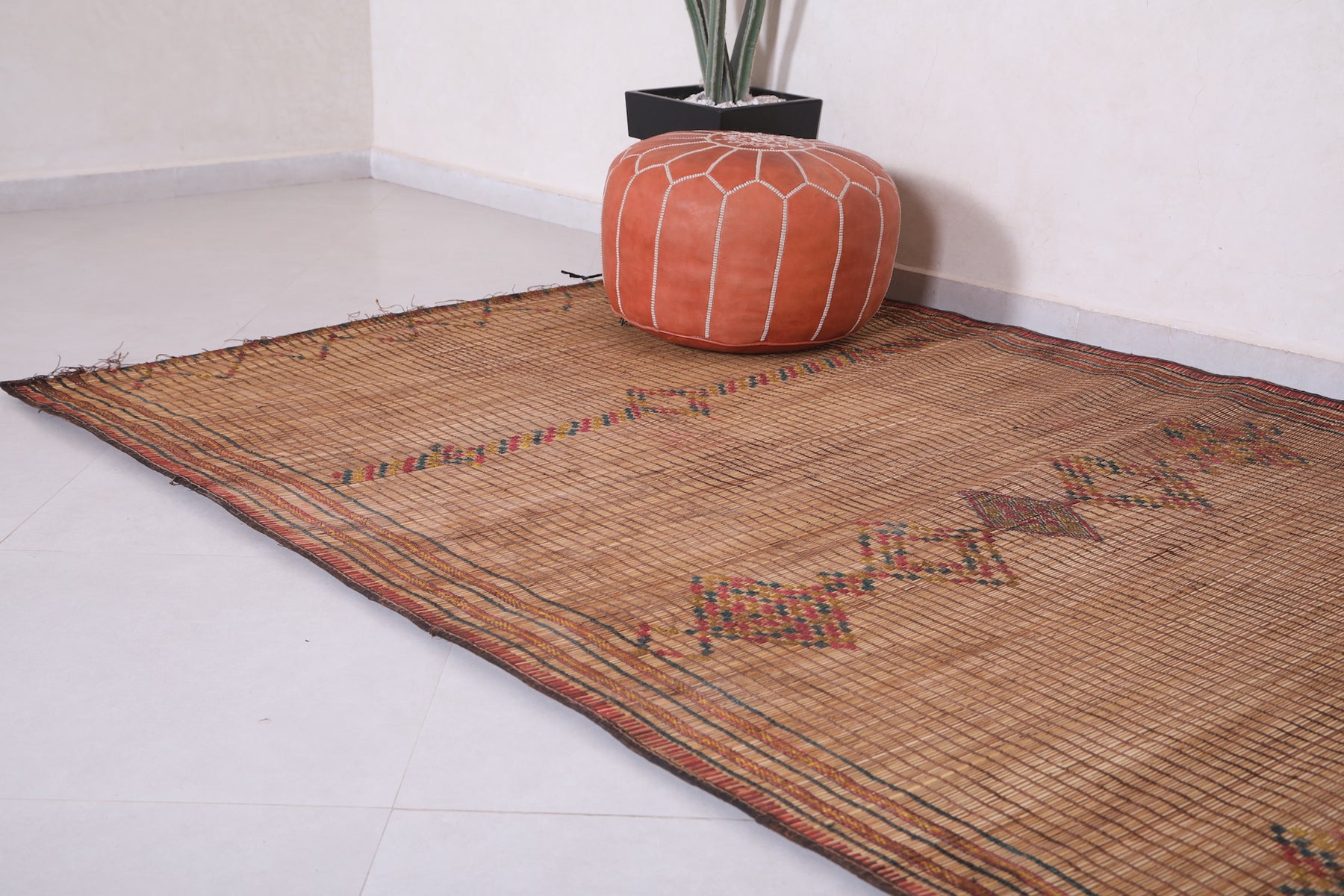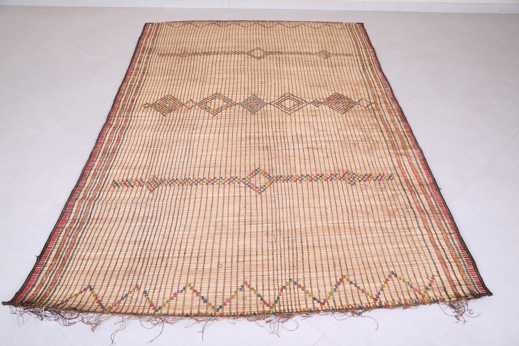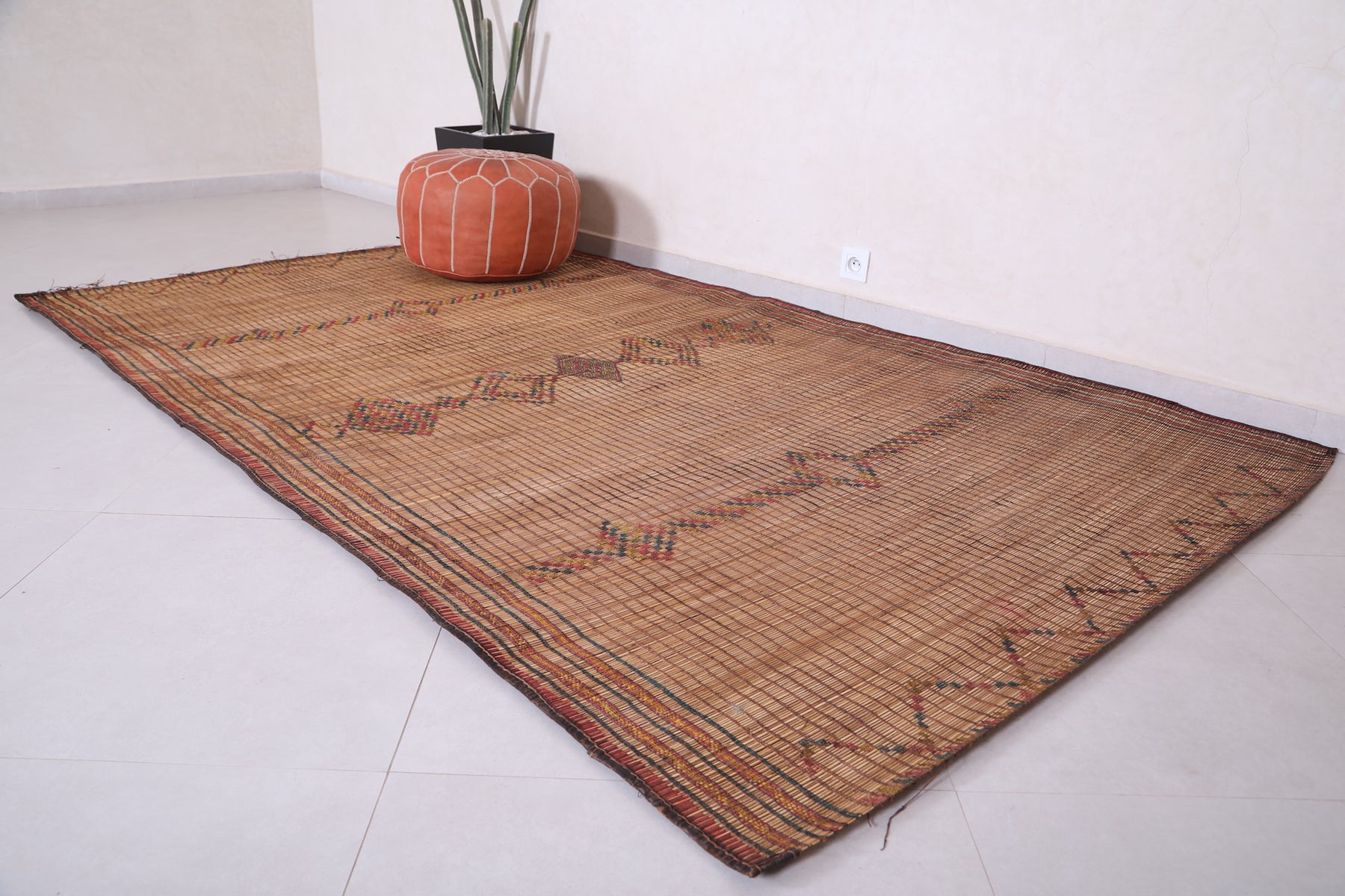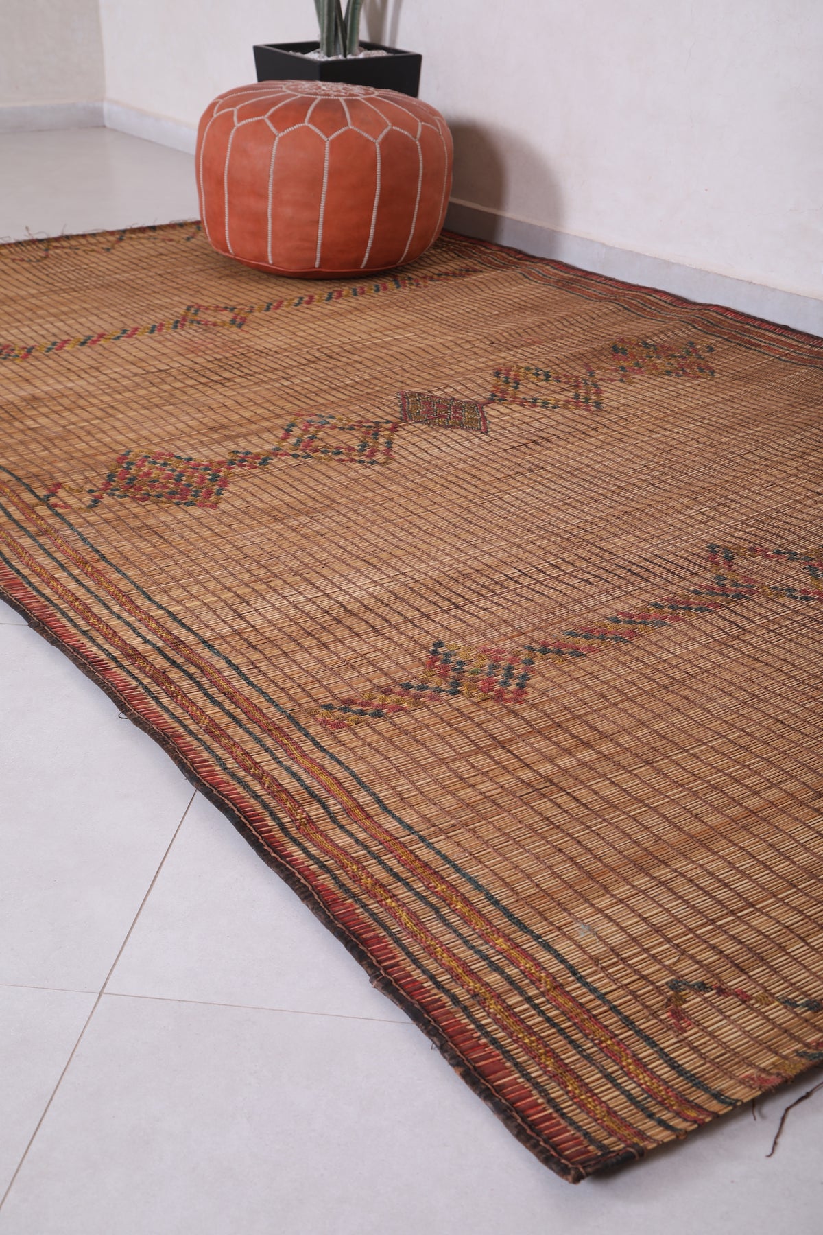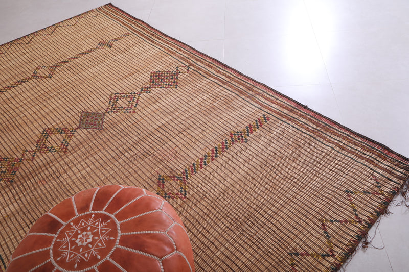 Elevate your space with the timeless charm of this Vintage Handmade Moroccan Tuareg Rug. Meticulously crafted by skilled artisans using natural reed fibers, this one-of-a-kind piece blends traditional craftsmanship with durability. Its intricate geometric patterns and earthy tones create a warm, textured focal point, perfect for living rooms, entryways, or creative spaces. This rug effortlessly merges culture, history, and style into your décor.