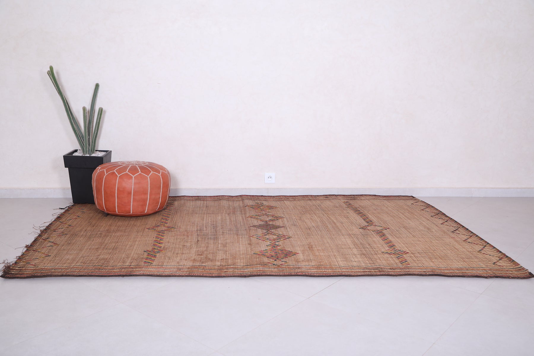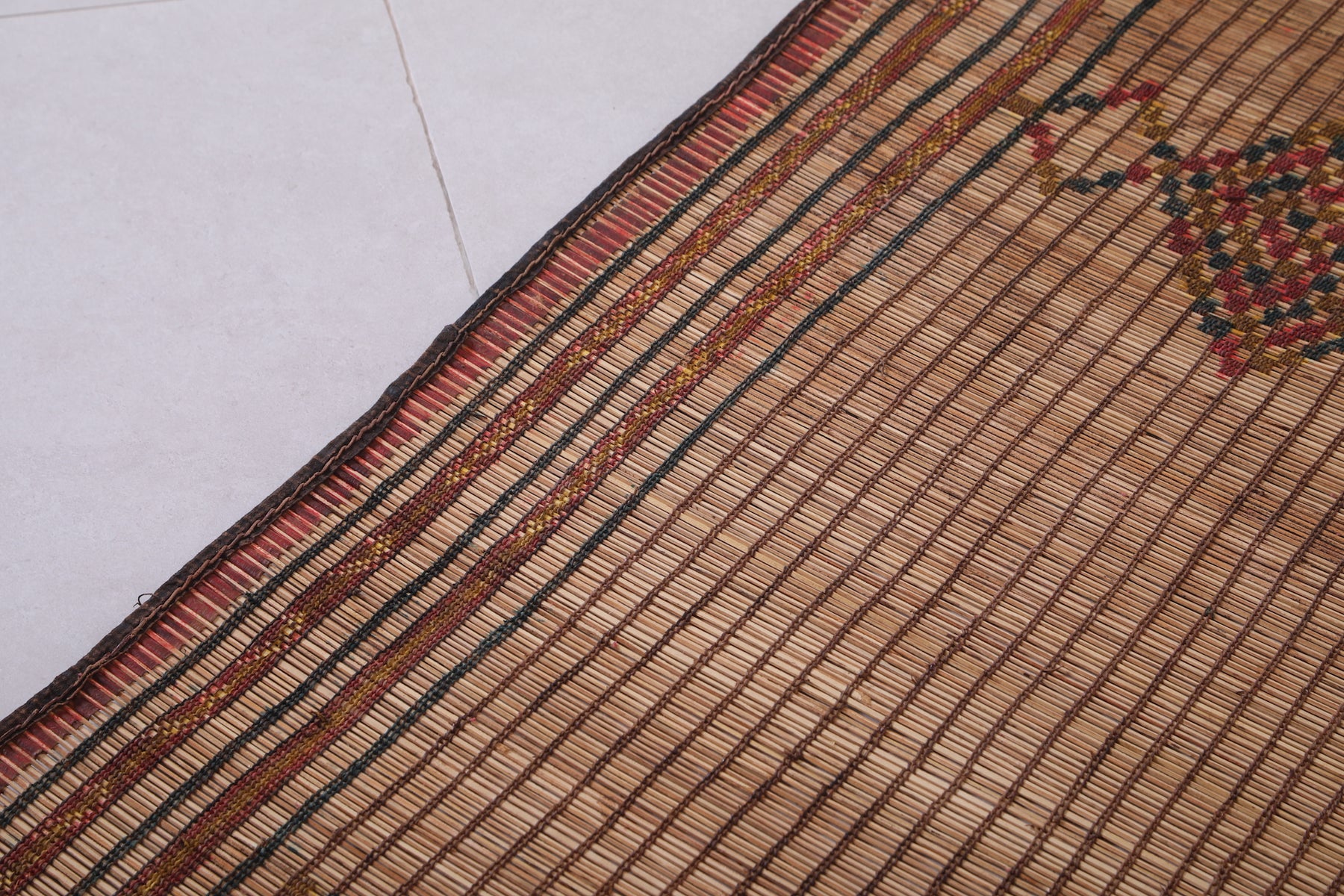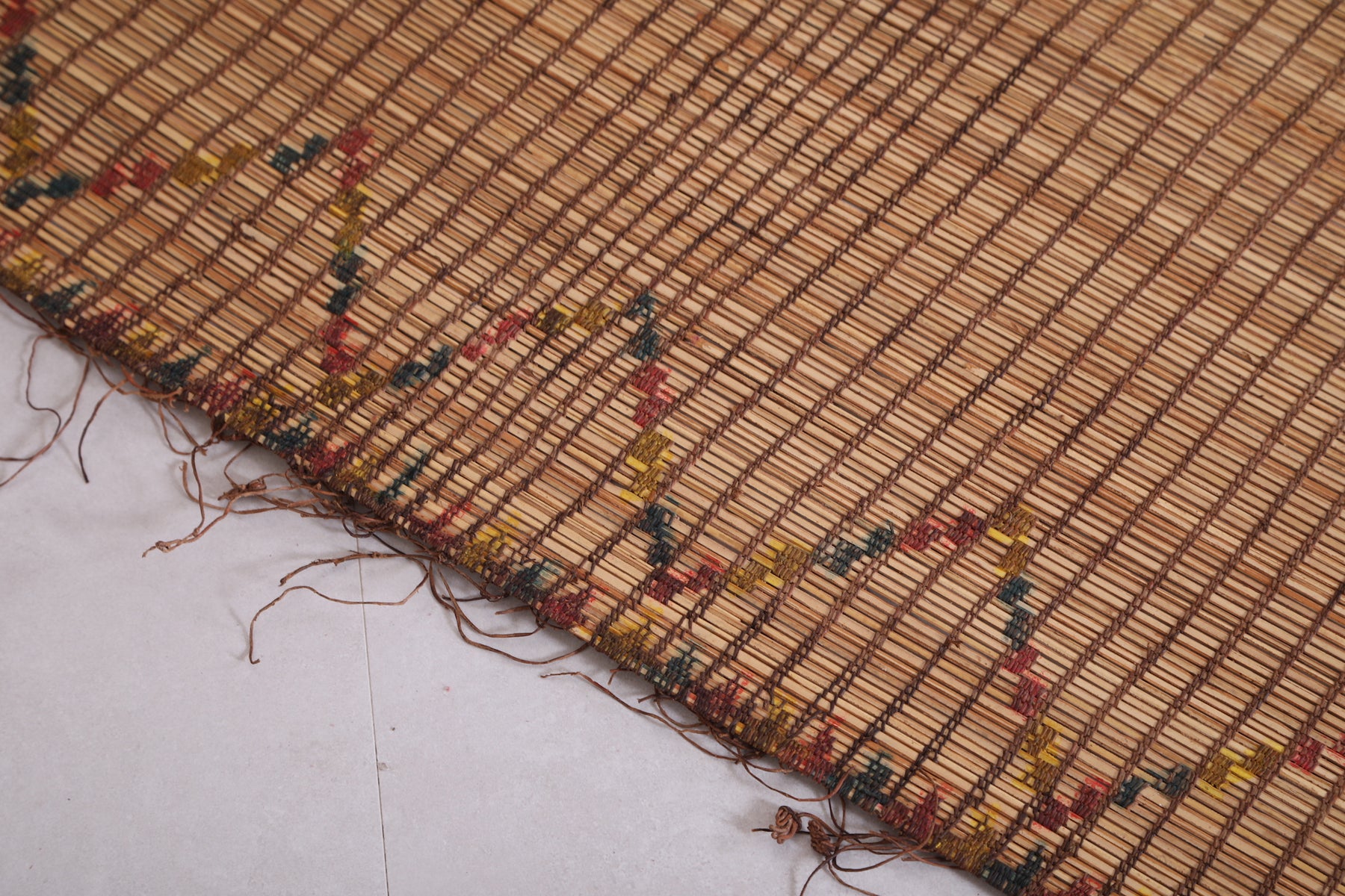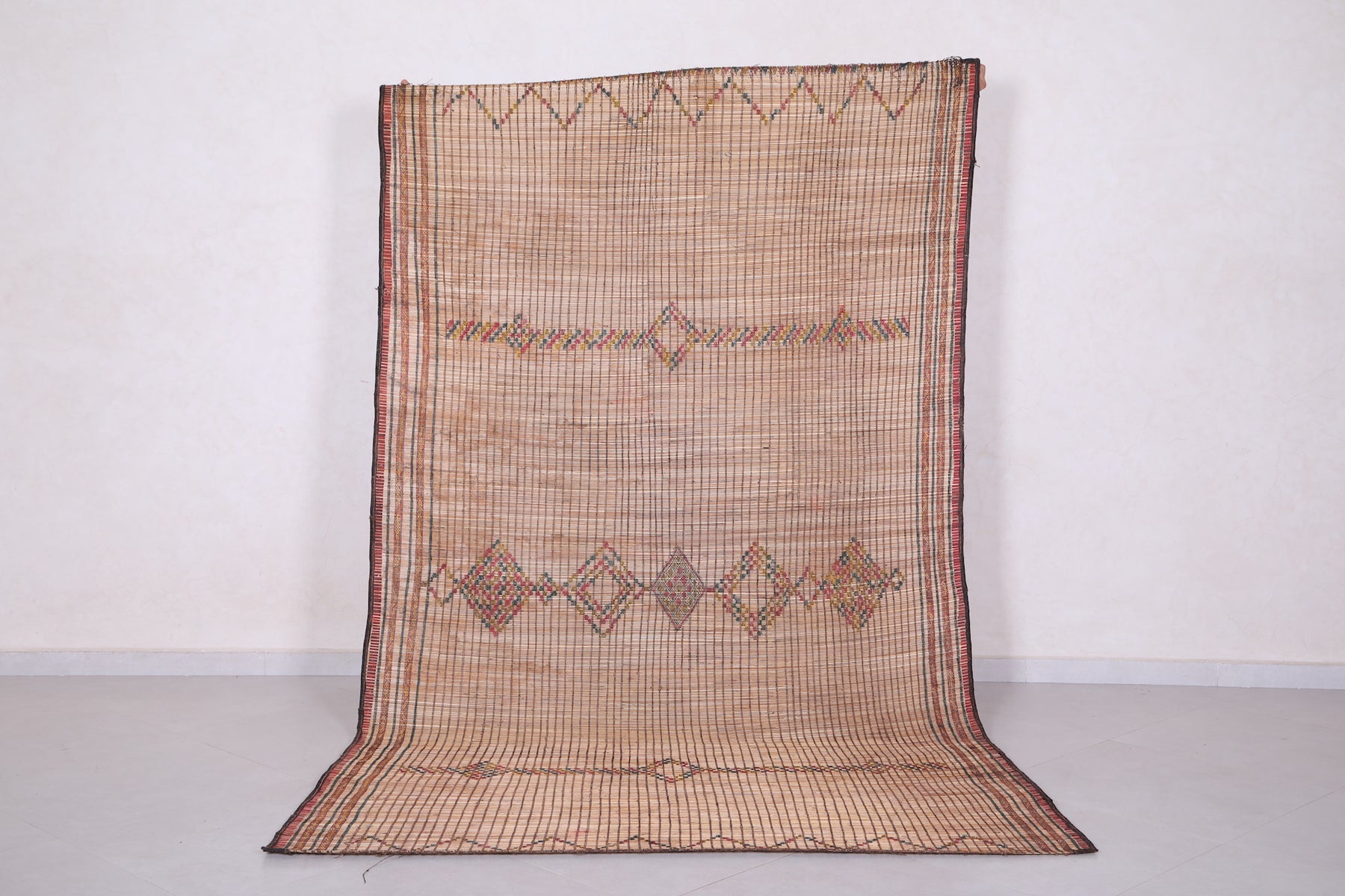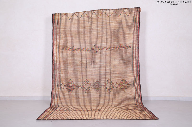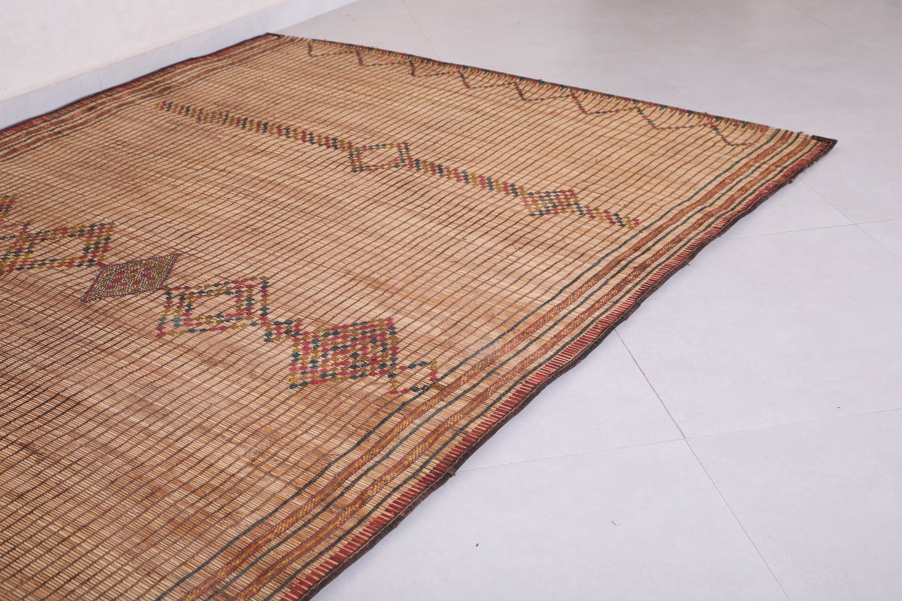 Elevate your space with the timeless charm of this Vintage Handmade Moroccan Tuareg Rug. Meticulously crafted by skilled artisans using natural reed fibers, this one-of-a-kind piece blends traditional craftsmanship with durability. Its intricate geometric patterns and earthy tones create a warm, textured focal point, perfect for living rooms, entryways, or creative spaces. This rug effortlessly merges culture, history, and style into your décor.