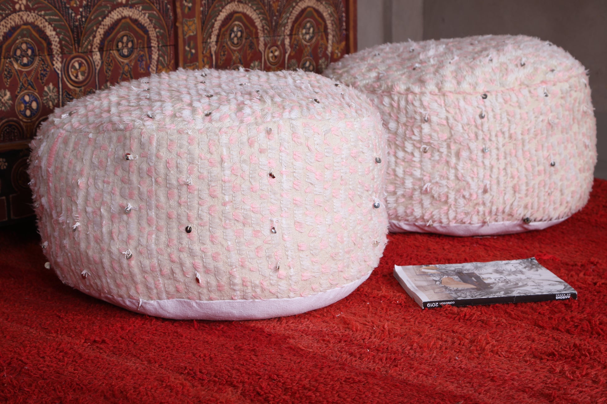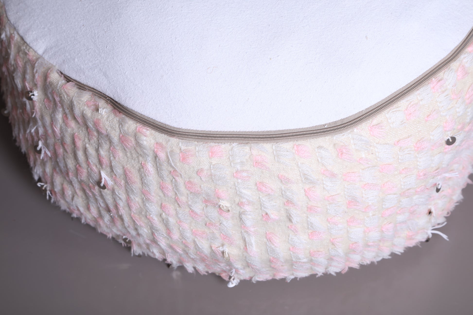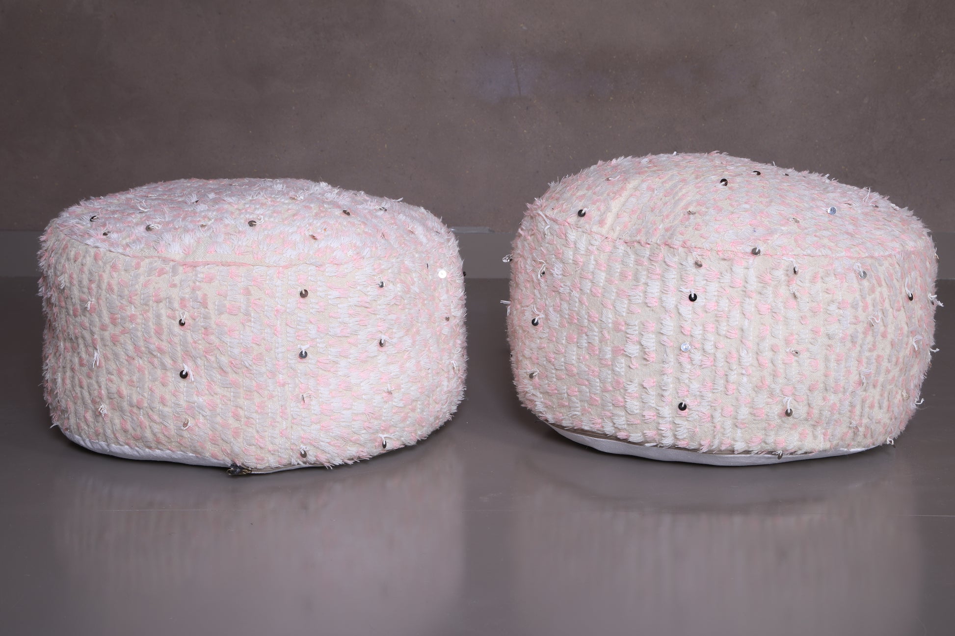 Add soft Moroccan luxury to your space with this set of two round poufs, beautifully handcrafted from vintage kilim textiles. Featuring a delicate blend of pale pink and creamy ivory, these poufs shimmer with hand-sewn sequins, creating a romantic accent for bohemian, chic, or feminine interiors.