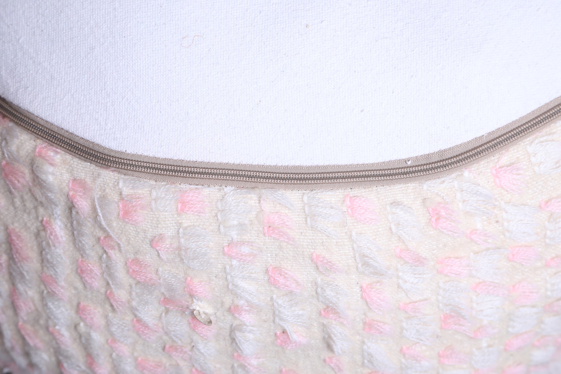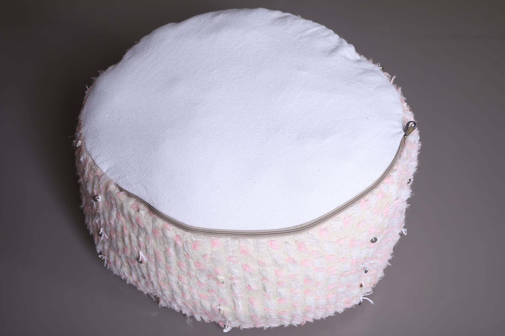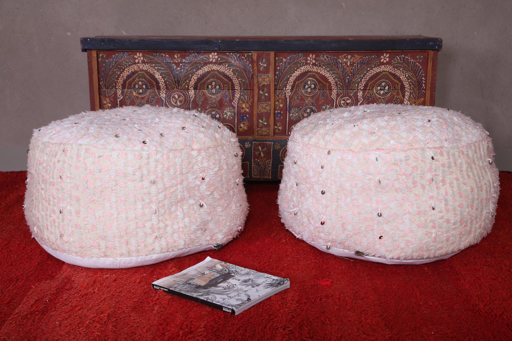 Add soft Moroccan luxury to your space with this set of two round poufs, beautifully handcrafted from vintage kilim textiles. Featuring a delicate blend of pale pink and creamy ivory, these poufs shimmer with hand-sewn sequins, creating a romantic accent for bohemian, chic, or feminine interiors.