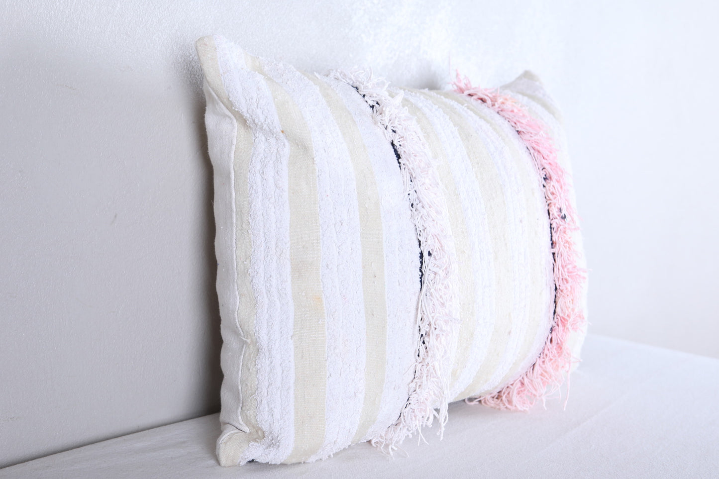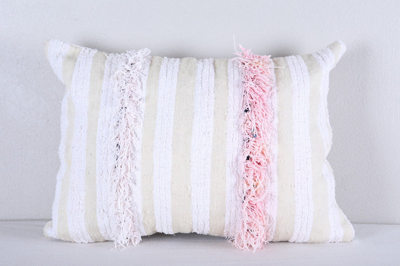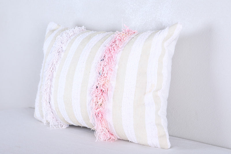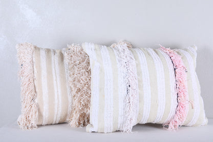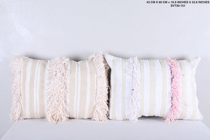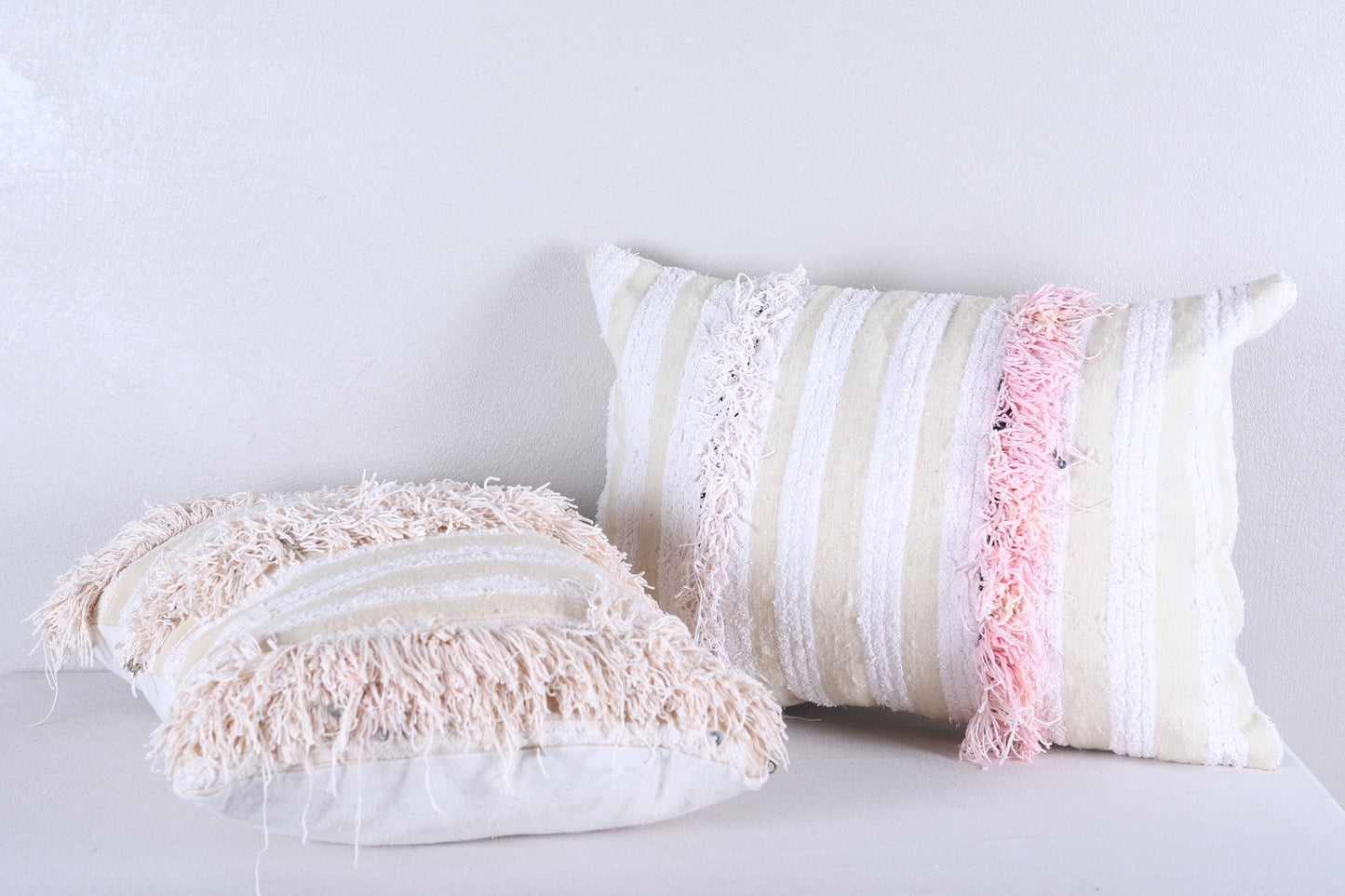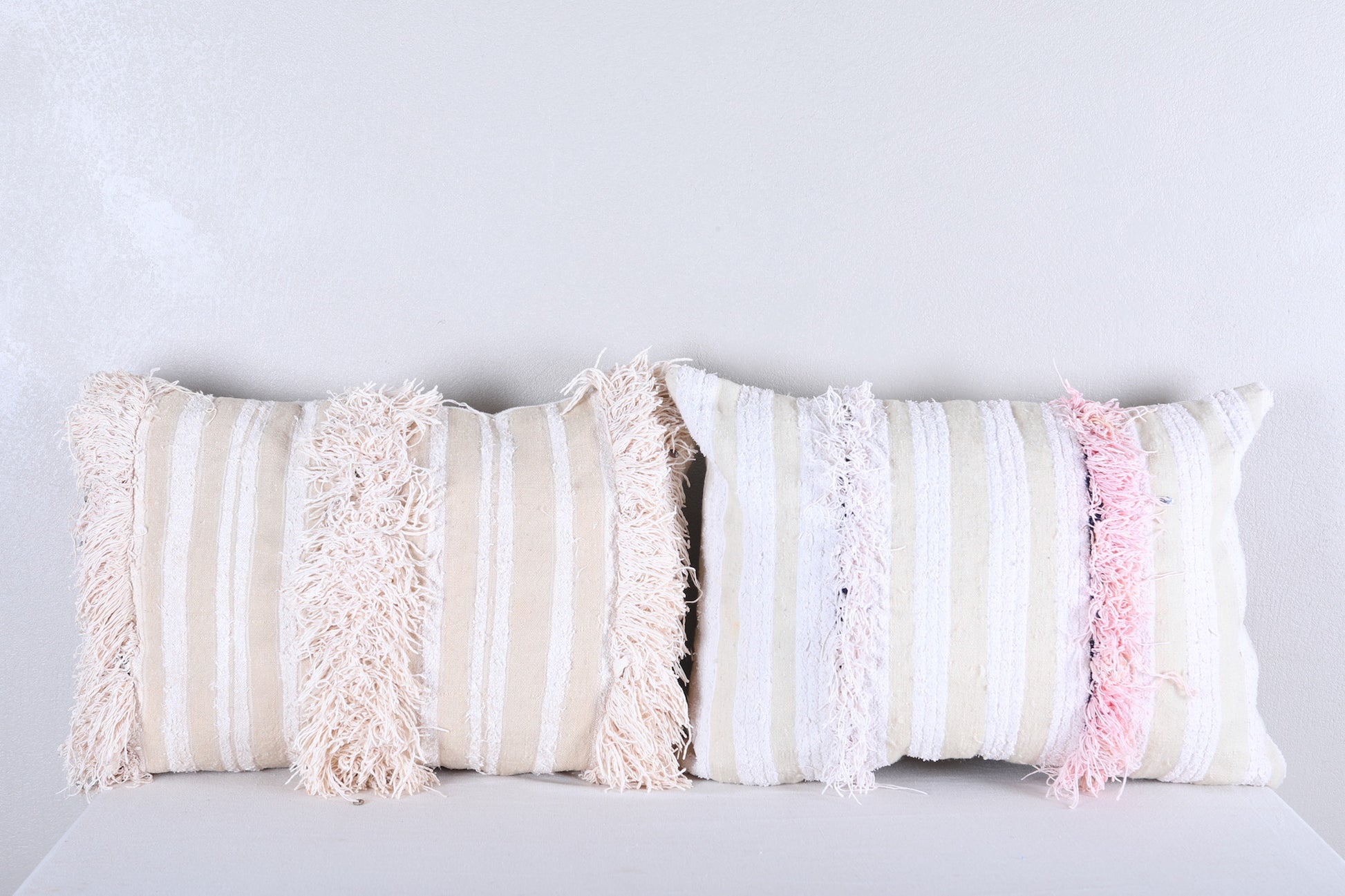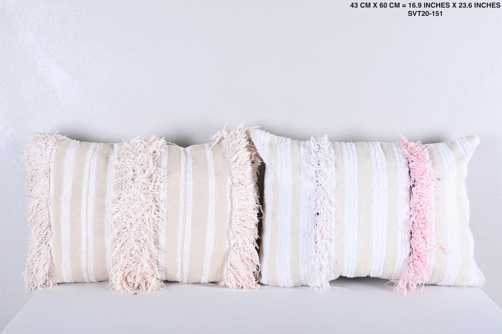 These Two Moroccan pillows provide both style and comfort with their unique vintage kilim rug design and handmade construction. Measuring 16.9 x 23.6 inches, they are filled for maximum support. Upgrade your home decor with these elegant throw pillows from Morocco.
